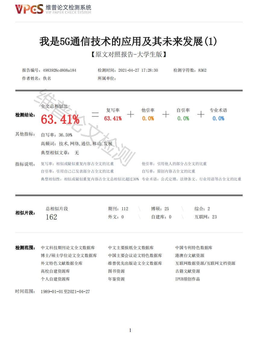 维普论文检测系统/IP PAPER CHECK SYSTEM我是5G通信技术的应用及其未来发展(1)【原文对照报告-大学生版】报告编号:4983928cd808a184检测时间:2021-04-2717:28:30检测字符数:8362作者姓名:佚名所属单位:全文总相似比复写率他引率自引率专业术语检测结论:63.41%63.41%0.0%0.0%0.0%其他指标:自写率:36.59%高频词:技术,网络,通信,移动,发展典型相似文章:无指标说明:复写率:相似或疑似重复内容占全文的比重他引率:引用他人的部分占全文的比重自引率:引用自己已发表部分占全文的比重自写率:原创内容占全文的比重典型相似性:相似或疑似重复内容占全文总相似比超过30%专业术语:公式定理、法律条文、行业用语等占全文的比重总相似片段期刊:112博硕:25综合:2相似片段:162外文:0自建库:0互联网:23检测范围:中文科技期刊论文全文数据库中文主要报纸全文数据库中国专利特色数据库博士/硕士学位论文全文数据库中国主要会议论文特色数据库港澳台文献资源外文特色文献数据全库维普优先出版论文全文数据库互联网数据资源/互联网文档资源高校自建资源库图书资源古籍文献资源个人自建资源库年鉴资源IPUB原创作品时间范围:1989-01-01至2021-04-27维普论文检测系统VIP PAPER CHECK SYSTEM原文对照颜色标注说明:■自写片段■复写片段(相似或疑似重复)口引用片段(引用)■专业术语(公式定理、法律条文、行业用语等)JIANGSU MARITIME INSTITUTE专科毕业设计(论文)论文题目:二级学院:专业:班级:姓名:学号:指导教师:职称:20年6月南京原创性声明本人郑重声明:所呈交的论文,是本人在指导教师的指导下,独立进行研究工作所取得的成果。除文中已经注明引用的内容外,本论文不含任何其他个人或集体已经发表或撰写过的作品成果。对本文的研究做出重要贡献的个人和集体,均已在文中以明确方式标明。本人完全意识到本声明的法律结果由本人承担。作者签名:日期:年月日论文使用授权本人完全了解江苏海事职业技术学院有关保留、使用论文的规定,学院有权保留并向国家有关部门或机构送交论文的复印件和磁盘,允许论文被查阅和借阅。本人授权江苏海事职业技术学院可以将论文的全部或部分内容编入有关数据库进行检索,可以采用影印、缩印或扫描等复制手段保存、汇编论文。(保密的论文在解密后应遵守此规定)作者签名:指导教师签名:日期:年月日摘要随着通信技术的不断发展,人们获得的信息越来越高效。5G作为一种新兴的通信技术和最现代的网络技术,其应用极大地提高了人们的使用频率和使用体验。本文对5G通信技术及其未来发展进行了简要的介绍和探讨,结合5G通信技术的应用场景和核心技术,对5G通信技术的各个阶段进行了深入的研究,提供了系统的认识,并提供了相关的理论参考和应用技术,为以后的研究和开发提供了实践依据。关键词:5G:通信技术;应用场景:关键技术Abstract2维普论文检测系统VIP PAPER CHECK SYSTEMWith the continuous development of communication technology,people get more and more efficientinformation.5G as a new communication technology and the most modern network technology,itsapplication has greatly improved people's use frequency and experience.In this paper,5Gcommunication technology and its future development are briefly introduced and discussed.Combinedwith the application scenarios and core technologies of 5G communication technology,each stage of5G communication technology is deeply studied,which provides a systematic understanding,andprovides relevant theoretical reference and application technology,which provides a practical basisfor future research and development.Key words:5G:Communication technology:Application scenario:Key technology目录摘要IAbstractII1绪论11.1研究背景11.2研究意义12相关理论分析12.15G通信技术概述12.25G关键技术22.2.1全双工技术22.2.2MIM0技术32.2.3智能化技术52.2.4设备间直接通信技术6论文检测2.2.5超密集异构网络72.2.6自组织网络835G移动通信技术优势93.1频谱利用率高93.2通信性能提高93.3设计理念先进93.4运营成本及能耗降低945G移动通信的关键技术应用发展104.15G移动通信技术的发展现状分析104.25G移动通信中的多载波技术发展104.35G移动通信中的超密集异构网络技术发展1055G移动通信技术的未来发展方向115.1SDN和NFV成为平台支撑技术115.2网络实现动态切片125.3网络能力深度开放13结论14致谢15参考文献161绪论1.1研究背景移动通信在现代生活中占有重要地位。目前,中国通过建立4G移动网络,提供稳定、快速的移动通信方式,整个国家4G移动通信基本可以满足当前人们的需求,但是由于信息时代的发展,人们的日常生活对数据传输速度的要求越来越高。经过多年的发展,5G移动通信核心技术的研究已经完成,并逐步进入最后的实用阶段,在商业化发展的过程中,5G移动通信技术也逐渐暴露出自身的问题。其中,5G移动通信发展问题备受关注,本文分析了5G移动通信的发展,探讨了未来的发展方向以及核心技术的发展和应用。3