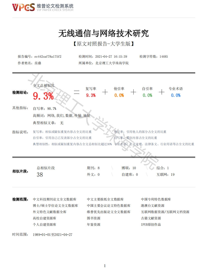 维普论文检测系统VIP PAPER CHECK SYSTEM无线通信与网络技术研究【原文对照报告-大学生版】报告编号:ec442caf78a175f2检测时间:2021-04-2716:15:39检测字符数:14485作者姓名:房鼎所属单位:北京理工大学珠海学院全文总相似比复写率他引率自引率专业术语检测结论:9.3%9.3%0.0%0.0%0.0%其他指标:自写率:90.7%高频词:网络,我们,数据,传输,地址典型相似文章:无指标说明:复写率:相似或疑似重复内容占全文的比重他引率:用他人的部分占全文的比重自引率:引用自己已发表部分占全文的比重自写率:原创内容占全文的比重典型相似性:相似或疑似重复内容占全文总相似比超过30%专业术语:公式定理、法律条文、行业用语等占全文的比重总相似片段期刊:8博硕:10综合:1相似片段:38外文:0自建库:0互联网:19检测范围:中文科技期刊论文全文数据库中文主要报纸全文数据库中国专利特色数据库博士/硕士学位论文全文数据库中国主要会议论文特色数据库港澳台文献资源外文特色文献数据全库维普优先出版论文全文数据库互联网数据资源/互联网文档资源高校自建资源库图书资源古籍文献资源个人自建资源库年鉴资源IPUB原创作品时间范围:1989-01-01至2021-04-27维普论文检测系统VIP PAPER CHECK SYSTEM原文对照颜色标注说明:■自写片段■复写片段(相似或疑似重复)口引用片段(引用)■专业术语(公式定理、法律条文、行业用语等)无线通信与网络技术研究学院:信息学院通信工程专业:姓名:房鼎170108106619指导老师:学号:职称:谢珺堂教授中国·珠海诚信承诺书本人郑重承诺:我所呈交的毕业论文《无线通信与网络技术研究》是在指导教师的指导下,独立开展研究取得的成果,文中引用他人的观点和材料,均在文后按顺序列出其参考文献,论文使用的数据真实可靠。承诺人签名:日期:年月日无线通信与网络技术研究摘要所谓科技强国,也就是目前我国重要发展的互联网行业,我们要通过发展新科技来加快我国的发展。当下盛行的3G和4G网络也渐渐地不能满足我国发展的需求了,近些年兴起的新名称5G,5G无线网络有远超4G网络的优越性,但目前来说还不是很成熟。但我们不知道其实5G无线网络早就出现在我们身边了,但是出现方式是与物联网相结合的产物,像VR,无人机,远程医疗,卫星导航等。我们生活在一个网络时代,脱离了网络我们身边的资讯会落后。现在的移动支付,定位导航可以说无处不在,但这些领域的发展都基于我们现在的无线网络。我们现在可以在家进行购物,在家进行娱乐,无线网络让即使身处异地的我,也可以见到许久未见甚是想念的亲人,这些都是便利着我们的日常生活。但问题来了,怎么让我们之间想传递的信息变得更加迅速呢?怎么让物联网快速发展呢?怎么让经常卡顿的信号变得流畅呢?5G网络的出现及时地解决了这些问题,如今疫情当下,在武汉第一批无人机快递,无人机送货,有效地节省了人力物力,减少了居民的外出,也是抑制疫情扩散的功臣。从此次疫情我们也严重意识到发展5G与物联网刻不容缓!无规矩不方圆,作为新时代的产物5G网络的前身3G和4G无线网络都有自己所对应的规矩,也就是我们常说的网络协议。最早的网络是有线网络,所以网络协议不需要很复杂,基本上都是点对点传输。但是现在是无线网络的时代,我们对于无线网络的规划要更加精密,更加严谨,否则我们的用户安全得不到保障。无线网络相对于有线网2维普论文检测系统VIP PAPER CHECK SYSTEM络,网络协议会更加地复杂,因为有些数据包会被阻塞,会被丢弃,会有损耗,所以我们要通过规定的无线网络协议来尽量规避这些会出现的状况。对于本次毕业设计,我会应用移动通信和通信原理的知识来为大家做一个有关无线通信与网络技术的介绍,让大家在阅读完本篇论文后,对未来无线网络的发展有一定的了解。关键词:5G物联网无线通信网络协议IPV6Wireless communication and network technology researchAbstractWe need to accelerate China's development through the development of new technologies.Thecurrent prevailing 3G and 4G networks are gradually unable to meet the needs of China's development.In recent years,the new name 5G emerged.5G wireless network has far more advantages than 4Gnetwork,but it is not very mature at present.But we don't know that 5G wireless network has beenaround us for a long time,but the way it appears is combined with the Internet of Things,such asVR,drones,satellite navigation and so on.We are living in a network era,without the network,the information around us will lag behind.Nowadays,mobile payment,positioning and navigation can be said to be everywhere,but thedevelopment of these fields is based on our current wireless network.Now we can do shopping andentertainment at home.The wireless network allows me to see the loved ones I haven't seen for along time even if I am in a different place.All these are convenient for our daily life.But thequestion is,how do we make the messages we want to send to each other faster?How to make theInternet of Things grow fast?How to make the signal of frequent lag become smooth?The emergence of5G network has solved these problems in a timely manner.Now that the epidemic is under way,thefirst batch of drone delivery in Wuhan has effectively saved manpower and material resources,reduced residents'going out,and also contributed to the suppression of the spread of the epidemic.From this epidemic,we are also seriously aware that the development of 5G and the Internet ofThings is urgent!As the product of the new era,the predecessor of 5G network,3G and 