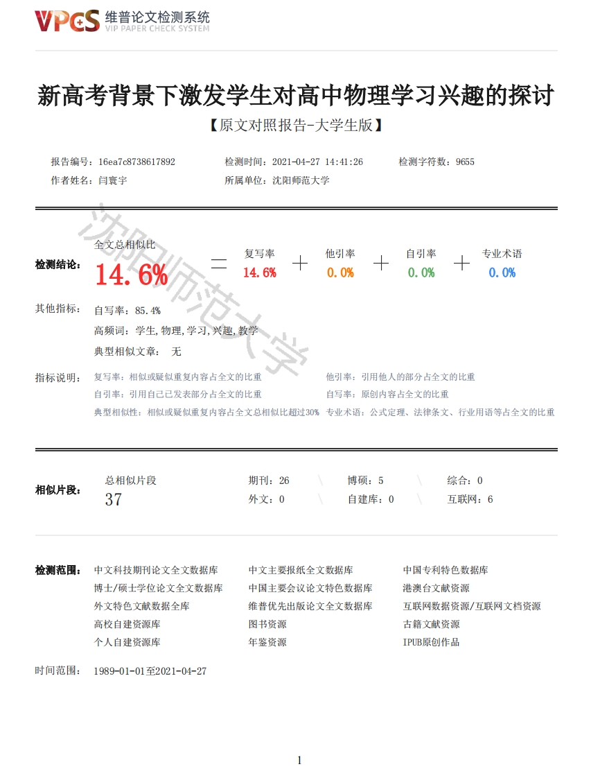 维普论文检测系统VIP PAPER CHECK SYSTEM新高考背景下激发学生对高中物理学习兴趣的探讨【原文对照报告-大学生版】报告编号:16ea7c8738617892检测时间:2021-04-2714:41:26检测字符数:9655作者姓名:闫寰宇所属单位:沈阳师范大学全文总相似比复写率他引率自引率专业术语检测结论:14.6%14.6%0.0%0.0%0.0%其他指标:自写率:85.4%高频词:学生,物理,学习,兴趣,教学典型相似文章:无指标说明:复写率:相似或疑似重复内容占全文的比重他引率:引用他人的部分占全文的比重自引率:引用自己已发表部分占全文的比重自写率:原创内容占全文的比重典型相似性:相似或疑似重复内容占全文总相似比超过30%专业术语:公式定理、法律条文、行业用语等占全文的比重总相似片段期刊:26博硕:5综合:0相似片段:37外文:0自建库:0互联网:6检测范围:中文科技期刊论文全文数据库中文主要报纸全文数据库中国专利特色数据库博士/硕士学位论文全文数据库中国主要会议论文特色数据库港澳台文献资源外文特色文献数据全库维普优先出版论文全文数据库互联网数据资源/互联网文档资源高校自建资源库图书资源古籍文献资源个人自建资源库年鉴资源IPUB原创作品时间范围:1989-01-01至2021-04-27维普论文检测系统VIP PAPER CHECK SYSTEM原文对照颜色标注说明:■自写片段■复写片段(相似或疑似重复)口引用片段(引用)■专业术语(公式定理、法律条文、行业用语等)本科毕业论文(设计)(2021届本科毕业生)の题目:新高考背景下激发学生对高中物理学习兴趣的探讨学生姓名:闫寰宇学生学号:17028058学院名称:物理科学与技术学院专业名称:物理学(师范)指导教师:陈皓2021年4月30日摘要兴趣是对学生学习最帮助的老师。在物理教学中,激发学生的物理学习兴趣,进而提高学习的积极性与主动性,是提高物理教学质量的主要手段。教师要学会运用各种教学方法以及手段来提高学生的物理学习兴趣。当然,光从教学出发也是不行的,学校家长的共共同努力也是必不可少的,学生自身也是事情本身所在。关键词:学习兴趣;学习氛围:鼓励AbstractInterest is the most effective teacher for students to learn,in physics teaching,it is themain means to improve the quality of physics teaching for stimulating students'interest,improvingthe enthusiasm and initiative of learning.Teachers should use a variety of teaching methods to2维普论文检测系统VIP PAPER CHECK SYSTEMimprove students'interest in physical learning.Of course,it is not enough to teach alone,thecommon efforts of parents and school is also essential,.The students themselves are the key.Abstract:learning interest:learning atmosphere:encourage目录引言-1-第一章新高考政策的下的专业选择-2一1.1新高考的内容-2-1.2针对新高考政策学校和家庭的应对-2-1.3大学专业设置跟物理的关系-3-第二章高考政策下学生物理学系所面临的问题-3~2.1学科因素-4-2.2学生自自身素的问题-4-2.3教师教学因素的问题-5-第3章提高物理学习兴趣的方法6-3.1教育教学过程中提高学习兴趣的办法6-3.1.1创设和谐的学习氛围,激发学生内部动机-6-3.1.2教师的人格魅力、幽默风趣的语言也能起到增强学习气氛的作用-6-3.1.3运用物理实验,挖掘学生物理学习兴趣-6-3.1.4巧用多媒体教学,使学生亲身体会物理知识的奥妙7-3.1.5联系生活实际,使物理知识生活化-7-3.1.6加强教学结果的评定、反馈及师生交流-3.2学生自我调节的方法8-3.2.1为自己创造或寻找兴趣-8-3.2.2科学的安排学习时间和勤于计划-8-致谢-11-引言随着新高考政策的落实,高中物理学科教学面临着机遇和挑战。一方面物理作为高校某些专业录取时的必要科目受到了学校和学生足够的重视:另一方面高中物理知识有一定的难度,很多知识偏向于抽象的理论,还伴有大量的计算,导致很多学生对物理的学习没有兴趣,动力不足,甚至失去信心。这给教师教学带6来了很大的挑战,而一个优秀的教师不应该因此而畏惧逃避,一定要迎难而上,改变学生对物理的固有想法,消除学生恐惧。在此过程中教师要学会因材施教,设定适合自己学生的教学计划,找准物理学习的核心要点,潜移默化地帮助学生找到学习物理的乐趣,进而达到重拾信心的目的。兴趣是学生最好的老师,如果学生对物理学产生了兴趣,积极主动地去探索物理知识,并在此过程中体会到了学习物理带来的乐趣,那将对学生自身发展产生很大的帮助。因此在教学中通过各种手段激发学生的学习动机,对于培养学生学习兴趣势在必行。新课改的进行使教师更加尊重学生的主体地位,关注学生的全面发展。如果学生对物理的学习产生了兴趣,充分发挥学习的主体地位,积极主动地探索新知,将会获得非常愉快的学习体验,学习成绩也会得到质的提升。由此可见,激发学生学习物理的兴趣尤为重要,这不仅是学生个体发展的需要,同时也是社会发展的需要。对学生个人来讲,新高考改革后,许多高校对高考考生的物理成绩有一定的要求,为了报志愿时选择性更多,许多学生会选择物理这一学科。但物理的学习具有一定的难度和抽象性,同时要求学生逻辑严谨,思维缜密。学生在学习时难免会感到吃力,枯燥。这就对教师提出了更高的要求,教师应在教学过程中通过各种教学方法激发学生学习的主动性,提升学生对物理学科的兴趣。与此同时学生也应该保持良好的学习心态积极主动地学习,让学习充满快乐,不再枯燥。对社会来讲,物理作为一门基础学科,关系