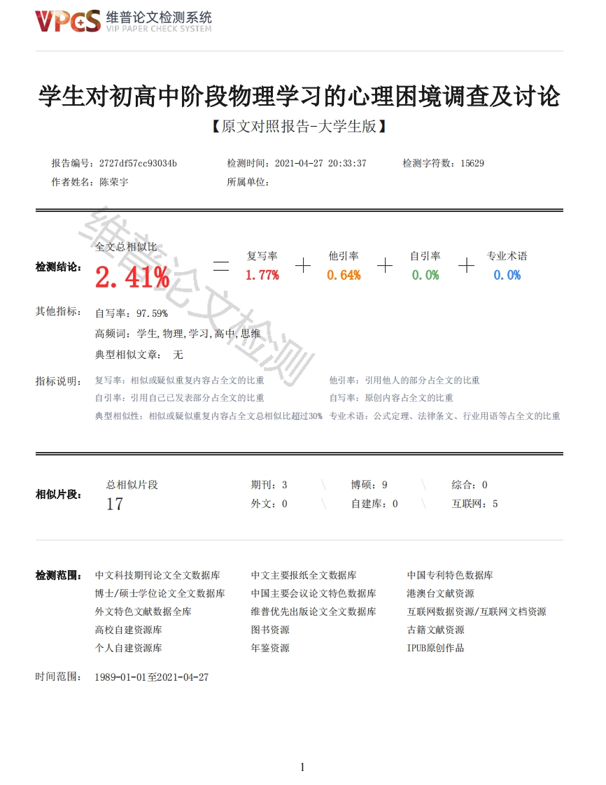 维普论文检测系统VIP PAPER CHECK SYSTEM学生对初高中阶段物理学习的心理困境调查及讨论【原文对照报告-大学生版】报告编号:2727df57cc93034b检测时间:2021-04-2720:33:37检测字符数:15629作者姓名:陈荣宇所属单位:全文总相似比复写率他引率自引率专业术语检测结论:2.41%1.77%0.64%0.0%0.0%其他指标:自写率:97.59%高频词:学生,物理,学习,高中,思维典型相似文章:无指标说明:复写率:相似或疑似重复内容占全文的比重他引率:引用他人的部分占全文的比重自引率:引用自己已发表部分占全文的比重自写率:原创内容占全文的比重典型相似性:相似或疑似重复内容占全文总相似比超过30%专业术语:公式定理、法律条文、行业用语等占全文的比重总相似片段期刊:3博硕:9综合:0相似片段:17外文:0自建库:0互联网:5检测范围:中文科技期刊论文全文数据库中文主要报纸全文数据库中国专利特色数据库博士/硕士学位论文全文数据库中国主要会议论文特色数据库港澳台文献资源外文特色文献数据全库维普优先出版论文全文数据库互联网数据资源/互联网文档资源高校自建资源库图书资源古籍文献资源个人自建资源库年鉴资源IPUB原创作品时间范围:1989-01-01至2021-04-27维普论文检测系统VIP PAPER CHECK SYSTEM原文对照颜色标注说明:■自写片段■复写片段(相似或疑似重复)口引用片段(引用)■专业术语(公式定理、法律条文、行业用语等)晋论文1932本科生毕业论文(设计)(2017)届论文(设计)题目:学生对初高中阶段物理学习的心理困境调查及讨论学院:物理科学与技术学院专业:物理学学号:201710800085学生姓名:陈荣宇指导教师姓名及职称:郭平生教授目录1.前言12.中学生的学习心理特点22.1好动好奇的转变22..2感性思维向理性思维发展42.3心理承受压力的转变52.4情绪的不稳定性63.中学生心理困境调查73.1调查概况73.2调查结果73.3调查分析总结82维普论文检测系统VIP PAPER CHECK SYSTEM4.中学生高中物理学不好的原因分析104.1理性思维还没有培养完成104.2学习物理兴趣降低104.3学习压力越来越大114.4易受情绪影响125破解中学生高中物理学习困难建议125.1培养学生的理性思维125.2努力使学生对物理感兴趣145.3教会学生疏导压力145.4培养学生良好的情绪15参考文献16致谢18附录19广西师范大学本科毕业论文(设计)学生诚信保证书20学生对初高中阶段物理学习的心理困境调查及讨论专业:物理学学号:201710800085学生姓名:陈荣宇指导老师:郭平生教授内容摘要:本文在分析学生在初高中时物理学习的心理困境,论述高中物理学生面临的一些现状。通过问卷调查等分析,探讨出一些解决学生在高中对物理学习的心理困境,主要从中学生的心理特点,中学生心理困境调查,中学生高中物理不好的原因分析及破解中学生高中物理学习困难建议等方面进行了分析。在通过分析与总结,查找资料和询问有经验的老师,找到了一些解决学生在高中学习物理的困境的方法,这对以后在教育教学工作中能够取得一定的教学成果,学生能够学会学习,学到知识,会自己解决问题,全面提升物理教学质量。关健词:心理特点:调查:分析:建议1.前言在我实习期间,我教两个班的物理,而我实习的学校在县里是最好的高中学校,因此学生生源不会很差。但尽管如此,我在教物理的过程中却经常感到很吃力,学生无论是在基础还是在听课效果及作业完成的情况上效果都不尽人意。物理学是研究物质世界最基本的结构、最普遍的相互作用、最一般的运动规律及所使用的实验手段和思维方法的自然学科,是一门基础学科。所以说学好物理对我们的生活有着非常重要的帮助,我们生活中的很多现象都可以用物理学来解释。可为何现在的高中生物理的学习效果降低如此之多?是初中物理学不好还是高中物理太难?举个例子,在某次课间曾有学生问我我问题时,对于题中的水平力,我让她受力分析时,她居然将水平力当成重力,如图1所示。除此之外,还有很多学生在解决问题中受力分析一直都是错的,甚至连物理中分解力时使用到的三角函数:sin cos tani这些都不懂。这是个极其严肃的问题,这已经不只是学生学不学得好的问题了,而应该是为何现阶段的学生对物理的理解基本上可以说为零。我觉得现阶段研究学生对物理的认知与感受比研究如何教物理更为重要,解决学生物理初中到高中这一过度的问题应该是首要问题。为了弄明白现阶段的学生对初高中物理学习的心理困境,我对我教的两个班以及另外老师的一个班上的学生做了问卷调查,并希望通过这次调查能够找出影响学生学习高中物理的因素,从而让学生喜欢物理,学好物理。图12.中学生的学习心理特点中学生处于个体发展的青春初期,青春初期是个体生理、心理和社会性上向成人接近的时期,思维开始出现辩证思维,而抽象思维已经由经验型向理论型转化。个人情感、道德感、理智感和美感都有得到发展,情绪存在:爆发性与冲动性:不稳定性与两极性:外露性与内敛性:心境化与持久性。同时他们也渴望表现自我,保护自我,形成自我意识,但这又与现实的自我往往是冲突的。所以在高中的物理教学过程中要注意学生思维的转化,培养学生3