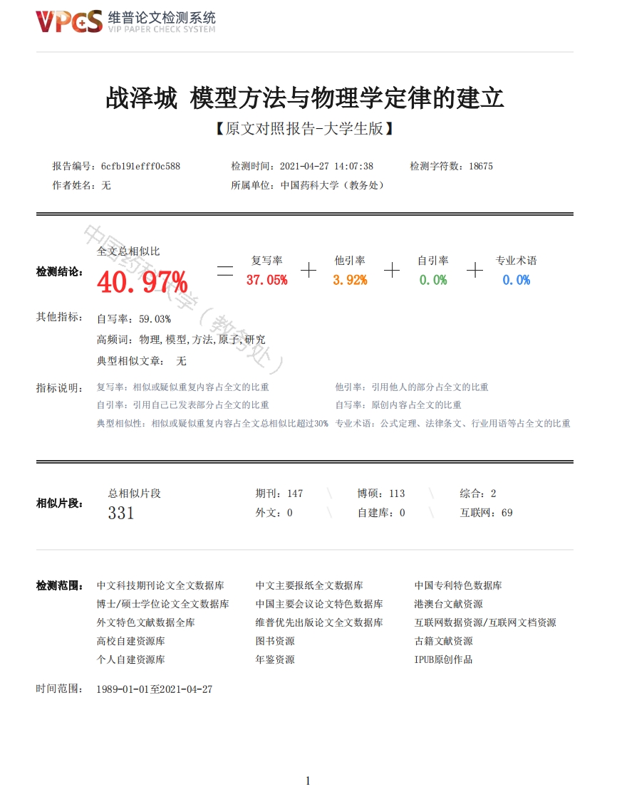 维普论文检测系统/IP PAPER CHECK SYSTEM战泽城模型方法与物理学定律的建立【原文对照报告-大学生版】报告编号:6cfb191efff0c588检测时间:2021-04-2714:07:38检测字符数:18675作者姓名:无所属单位:中国药科大学(教务处)全文总相似比复写率他引率自引率专业术语检测结论:40.97%37.05%3.92%0.0%0.0%其他指标:自写率:59.03%高频词:物理,模型,方法,原子,研究典型相似文章:无指标说明:复写率:相似或疑似重复内容占全文的比重他引率:引用他人的部分占全文的比重自引率:引用自己已发表部分占全文的比重自写率:原创内容占全文的比重典型相似性:相似或疑似重复内容占全文总相似比超过30%专业术语:公式定理、法律条文、行业用语等占全文的比重总相似片段期刊:147博硕:113综合:2相似片段:331外文:0自建库:0互联网:69检测范围:中文科技期刊论文全文数据库中文主要报纸全文数据库中国专利特色数据库博士/硕士学位论文全文数据库中国主要会议论文特色数据库港澳台文献资源外文特色文献数据全库维普优先出版论文全文数据库互联网数据资源/互联网文档资源高校自建资源库图书资源古籍文献资源个人自建资源库年鉴资源IPUB原创作品时间范围:1989-01-01至2021-04-27维普论文检测系统VIP PAPER CHECK SYSTEM原文对照颜色标注说明:■自写片段■复写片段(相似或疑似重复)口引用片段(引用)■专业术语(公式定理、法律条文、行业用语等)国药科QINGDAO UNIVERSITY本科毕业设计(论文)题目:模型方法与物理学定律的建立学院:物理科学学院专业:物理学(师范类)姓名:战泽城指导教师:索标2021年5月10日模型方法与物理学定律的建立摘要在研究复杂的物理现象时,为了更好地把握研究对象的本质和事物发展的规律,往往根据不同的研究对象的特点和不同的研究重点,突出研究对象的主要特征,舍弃除自然以外的次要因素,将研究对象进行归纳概括、可视化处理,创建一个只包含主要因素和反映事物规律的载体的研究对象,即创建物理模型。通过理想模型来研究物理问题的方法,是物理学研究中常用的、重要的基本方法。该文章通过介绍常见的物理科学方法,并通过分析了卡诺定理的建立、原子模型的演化过程论述了理想模型方法在物理学定律建立过程中所起的重要作用,以及通过分析比较,说明模型方法的优缺点。关键词物理科学方法理想模型卡诺定理原子模型Model method and physics lawestablishmentAbstractIn the study of complex physical phenomena,in order to better grasp the essence and rule,weoften based on different research objects and research emphasis,highlight the main characteristicof the object of study,abandon the secondary factors other than nature,generalization,visualization processing will be the research object,establish a only contains the main factors andreflect the research object change rule of the carrier,namely,to establish the physical model.Themethod of studying physical problems by establishing ideal models is a common and important basicmethod in the study of physics.In this paper,by introducing the common physical science methods,and through the analysis of the establishment of Carnot theorem,the evolution process of atomic2维普论文检测系统VIP PAPER CHECK SYSTEMmodel discussed the ideal model method in the establishment of physical laws play an important role,and through the analysis and comparison,the model method has a certain limitation.Key word:physical science method ideal model Carnot's theorem atomic model目录本科毕业设计(论文)1模型方法与物理学定律的建立2引言41.物理科学方法41.1物理科学方法的基本概念41.2常用的物理科学方法简介61.3.1设疑提问法61.3.2观察方法71.3.3实验方法71.3.4数学方法81.3.5比较与分类方法81.3.6分析与综合方法91.3.7归纳与演绎方法91.3.8理想化方法91.3.9类比方法111.3.10物理假说及其检验112.物理定律的建立与物理模型的联系112.1模型方法与卡诺定理的建立112.2理想模型与原子结构142.3理想模型与玻尔原子模型的提出163.对理想模型方法的思考与认识183.1理想模型在自然科学研究中的重要作用。183.2理想模型的局限性184.结束语19谢辞19参考文献20引言方法是认识世界、改造世界的步骤与途径。正确的方法可以引导我们在解决问题的过程中增加目的性,克服盲目性。在物理学研究中,为了简化研究对象,摒弃次要因素,把握主要因素,将实际问题理想化,通过构建理想模型来揭示原型的特征和性质,可以清楚地反应被研究问题的本体特性,及事情所蕴含的主要问题,方便我们对主要的运动规律进行分析和发现的问题。理想模型方法在各个领域中都已经被人们广泛的应用。物理模型是抽象思维的假设,它可以超越现有的条件,指出研究的方向,进行科学的预测和科学的假设。例如,麦克斯韦方程组的建立就是基于电磁模型。物理模型方法是进行物理研究的有效手段,但是层出不穷的新实验材料和新理论是永远不会被包裹在原始模型中,并保持是一个内容,停顿不前的。辩证唯物主义认识论强调认识是一个不断深化的动态的辩证发展过程,所以一个理想模型在科学注释或物理形式上也一定是不断深化发展的,而不可能保持原封不动的。因此,在获得的丰富的知识并加以利用的基础上,下一步也需要不断改善旧的模型甚至超越摆脱现有的具体模型,建立新的更加完善的理论体系。1.物理科学方法1.1物理科学方法的基本概念“方法”就是指“行事之条理也”,方法被认为是做事情所应遵循的顺序、途