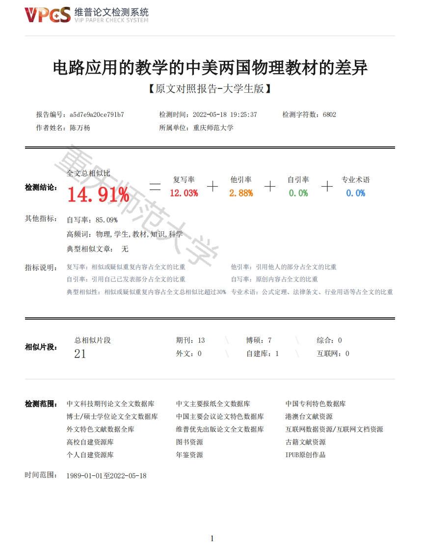 维普论文检测系统/IP PAPER CHECK SYSTEM电路应用的教学的中美两国物理教材的差异【原文对照报告-大学生版】报告编号:a5d7e9a20ce791b7检测时间:2022-05-1819:25:37检测字符数:6802作者姓名:陈万杨所属单位:重庆师范大学全文总相似比复写率他引率自引率专业术语检测结论:14.91%12.03%2.88%0.0%0.0%其他指标:自写率:85.09%高频词:物理,学生,教材,知识,科学典型相似文章:无指标说明:复写率:相似或疑似重复内容占全文的比重他引率:引用他人的部分占全文的比重自引率:引用自己已发表部分占全文的比重自写率:原创内容占全文的比重典型相似性:相似或疑似重复内容占全文总相似比超过30%专业术语:公式定理、法律条文、行业用语等占全文的比重总相似片段期刊:13博硕:7综合:0相似片段:21外文:0自建库:1互联网:0检测范围:中文科技期刊论文全文数据库中文主要报纸全文数据库中国专利特色数据库博士/硕士学位论文全文数据库中国主要会议论文特色数据库港澳台文献资源外文特色文献数据全库维普优先出版论文全文数据库互联网数据资源/互联网文档资源高校自建资源库图书资源古籍文献资源个人自建资源库年鉴资源IPUB原创作品时间范围:1989-01-01至2022-05-18维普论文检测系统VIP PAPER CHECK SYSTEM原文对照颜色标注说明:■自写片段■复写片段(相似或疑似重复)口引用片段(引用)■专业术语(公式定理、法律条文、行业用语等)全日制本科生毕业论文题目:电路应用的教学的中美两国物理教材的差异学院:物理与电子工程学院专业年级:物理学2018级学生姓名:陈万杨学号:2018041101049指导教师:胡锋职称:副教授2022年05月18日电路应用的教学的中美两国物理教材的差异物理与电子工程学院物理学(师范)专业2018级陈万杨指导教师胡锋摘要:电路及其应用是中学物理知识的一个重要内容,考虑到美国物理方面的教育始终处在全球的领先地位,其课程改革也处于发展前沿,美国的教育值得学习和借鉴。本文从教学角度出发,分析了中美两国物理教材中的电路应用部分的差异,包括电路、电路分析、电路应用,最后针对两国高中物理教材中的课程设计、实验教学、习题设置进行了比较分析和总结,旨在挖掘两国教材各自的特色和优点,给今后我国的教材编写提供一定的参考和意见。关键词:电路应用:物理教材:中美差异:对比分析Abstract:Circuits and their applications are an important part of middle school physicsknowledge.Considering that American physics education has always been in a leading position in theworld,and its curriculum reform is also at the forefront of development,American education isworth learning and learning from.From the perspective of teaching,this paper analyzes thedifferences in the application of circuits in the physics textbooks between China and the UnitedStates,including circuits,circuit analysis,and circuit applications.The purpose of comparativeanalysis and summary is to explore the characteristics and advantages of the textbooks of the twocountries,and to provide certain reference and opinions for the compilation of textbooks in ourcountry in the future.Key words:circuit application:physics textbook:differences between China and America:2维普论文检测系统VIP PAPER CHECK SYSTEMcomparative analysis1引言多年来,诺贝尔物理学奖多被美国科学家收入囊中,世界一流大学排名前列多为美国大学,人们也开始注意到美国的教育有着得天独厚的优势,美国教材也一定有着其特殊之处。在中学阶段,物理知识是不可或缺的部分,也是培养公民核心素养的重要方式。中国人教版初高中物理教材前后都经过数次修订,只为打造更适合我国学生学习物理知识的教材内容。但我国物理教育相比美国来说还有很大的距离,也有许多专家学者注意到这一点,对中美两国的物理教材不同阶段、不同板块都展开了分析研究,希望借此找出两国教材差异所在,为我国的物理教材的编写提供参考和建议,有利于学生更好的掌握有关科学知识,形成科学的思维方式,更好的培养符合时代发展的新型人才[1]。而在高中物理板块里,电路及其应用无疑是学习的重难点,它的应用范围可以说在日常生活中无处不在,同时也是开展物理前沿研究的基础知识,而关于中美两国教材这一板块的研究较少。基于以上研究结论,本文选取了美国高中物理教材(图1-1左):Barron’s AP Physics C和中国高中物理教材(图1-1右):人教新版高中物理必修三,对二者电路应用的教学部分进行对比,最终发现两国教材的差异所在,并为我国教材编写提供经验和参考。BARRON'SA物理PHYSICS C图1-1美(左)中(右)教材[2][3]2中美物理教材电路应用课程设计的对比分析2.1章节安排人教新版高中物理必修三,第九、十两章研究的“电”是“静电”,而第十一、十二章研究的“电”是“动电”,是有关运动电荷的规律。先研究的是电场的知识,再研究电路的知识。两者关联很大,因为电路中的很多概念都是在静电场知识的基础上建立的,如电压、电势差概念。美国高中AP课程是为了高中学生提前接触大学课程,避免高中和大学初级阶段课程的重复。在学习第十四章“含电池和电阻的电路分析”之前,教材安排了:库仑定律、连续电势的计算、高斯定律等作为学习电路的前提课程,而电路及其应用作为电场和磁场中承上启下的部分。对比分析:中国教材更注重由浅入深,先从简单的概念入手,再一步一步深入,且将高斯定律等需要微积分的定理等留到了大学课程,先建立起