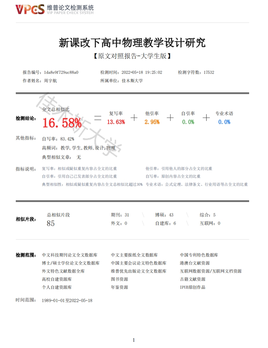维普论文检测系统/IP PAPER CHECK SYSTEM新课改下高中物理教学设计研究【原文对照报告-大学生版】报告编号:1da8e9f729uc88a0检测时间:2022-05-1819:25:02检测字符数:17532作者姓名:周宇航所属单位:佳木斯大学全文总相似比复写率他引率自引率专业术语检测结论:16.58%13.63%2.95%0.0%0.0%其他指标:自写率:83.42%高频词:教学,学生,教师,设计,物理典型相似文章:无指标说明:复写率:相似或疑似重复内容占全文的比重他引率:引用他人的部分占全文的比重自引率:引用自己已发表部分占全文的比重自写率:原创内容占全文的比重典型相似性:相似或疑似重复内容占全文总相似比超过30%专业术语:公式定理、法律条文、行业用语等占全文的比重总相似片段期刊:31博硕:43综合:5相似片段:85外文:0自建库:6互联网:0检测范围:中文科技期刊论文全文数据库中文主要报纸全文数据库中国专利特色数据库博士/硕士学位论文全文数据库中国主要会议论文特色数据库港澳台文献资源外文特色文献数据全库维普优先出版论文全文数据库互联网数据资源/互联网文档资源高校自建资源库图书资源古籍文献资源个人自建资源库年鉴资源IPUB原创作品时间范围:1989-01-01至2022-05-18维普论文检测系统VIP PAPER CHECK SYSTEM原文对照颜色标注说明:■自写片段■复写片段(相似或疑似重复)引用片段(引用)■专业术语(公式定理、法律条文、行业用语等)摘要如今,信息飞速发展、科技迭代更新,国内急迫的需要大量的人才来建设社会,教育也急切地需要改革来适应新的发展变化。在此背景下,国家迎来了新一轮的课程改革,颁布了《普通高中物理课程标准(2017年版)》并于2020年进行了修订,对课程体系、教学等做出了变动。结合新课改对教师的要求、基于教学设计的基本理念,分析了教师的教学现状,探讨了教师在教学及教学设计中存在一些问题:教师自身的教学观念陈旧、忽视对学生自主能力的培养、教学模式枯燥单一等。针对教师存在的问题、结合新课改提出的要求,在教学设计上给出了解决的策略:转变自身观念、紧跟时代、将学生放在师生关系的正确的主体地位、将多媒体设备教学和分组教学两种教学模式活用于课堂中等。关键词:新课改:高中物理:教学设计Abs tractNowadays,with the rapid development of information and the iterative renewal of science andtechnology,China urgently needs a large number of talents to build the society,and educationurgently needs reform to adapt to the new development and changes.In this context,the country hasushered in a new round of curriculum reform,promulgated the physics curriculum standard for seniorhigh schools (2017 Edition),revised it in 2020,and made changes to the curriculum system andteaching.Combined with the requirements of the new curriculum reform for teachers and based on the basicconcept of teaching design,this paper analyzes the current situation of teachers'teaching,anddiscusses some problems existing in Teachers'teaching and teaching design:Teachers'own teachingconcept is old,ignoring the cultivation of students'independent ability,boring and singleteaching mode,etc.In view of the problems existing in teachers and the requirements put forward bythe new curriculum reform,this paper gives the solving strategies in teaching design:changingtheir own ideas,keeping up with the times,putting students in the correct main position of therelationship between teachers and students,and living the two teaching modes of multimediaequipment teaching and group teaching in the classroom.Key Words:new curriculum reform;high school physics;instructional design目录第1章绪论·······51.1国内外研究现状..2VPCS维普论文检测系统VIP PAPER CHECK SYSTEM1.1.1国外研究现状···········1.1.2国内研究现状······1.2研究的意义及方法·······1.3.2具体目标·······第2章教学设计理论阐述··2.1高中物理教学设计理论2.1.1教学设计的理论发展2.2高中物理教学设计原则···第3章目前高中物理教师教学现存问题······3.1教师教学观念陈旧··········3.1.1内容守旧·········3.2教师缺乏对学生自主思考能力培养・・・・133.2.1对学生角色定位不清晰········3.2.2注重知识掌握忽视能力培养·····133.3.1以教师单向知识输出为主······3.3.2现代教学手段运用不足·······第4章新课改下的高中物理教学设计策略·4.1改变教师的教学观念···········4.1.1做好充分备课工作设置课前预习····4.1.2视学生为学习的主体········4.1.3注重课程的时代性体现育人价值・・・・4.2注重培养学生自主思考能力・・・・・・・・183