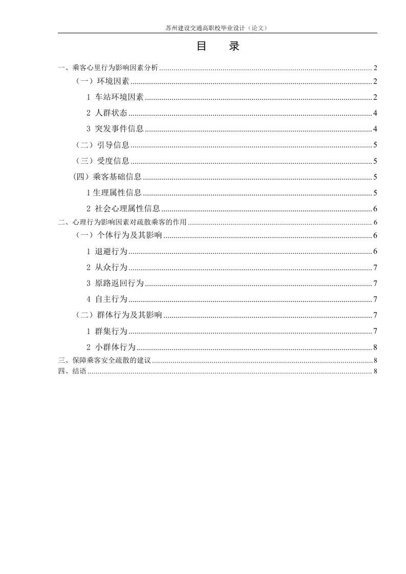 苏州建设交通高职校毕业设计〔论文)目录一、乘客心里行为影响因素分析2(一)环境因素…1车站环境因素22人群状态3突发事件信息(二)引导信息…(三)受度信息(四)乘客基础信息51生理属性信息2社会心理属性信息…二、心理行为影响因素对疏散乘客的作用6(一)个体行为及其影响】退避行为…62从众行为73原路返回行为4自主行为…(二)群体行为及其影响.2小群体行为8三、保障乘客安全疏散的建议…苏州建设交通高职校毕业设计〔论文)摘要:轨道交通车站突发事件下乘客的心理行为对安全疏散具有重要影响。将轨道交通车站应急疏散乘客心理行为影响因素概括为环境因素、引导因素、理解性因素及乘客基本信息等四个方面,并加以分析。探讨了影响因素的作用机制,针对相应因素提出了指导应急疏散的建议。关键词:轨道交通车站:应急疏散:心理行为:影响因素城市轨道交通系统是一种大运量、快速、准时、安全、舒适的客运交通系统,为缓解城市交通拥挤、运输能力不足的问题提供了极为有效的途径。随着城市轨道交通线网规模的不断扩大,轨道交通承担的客运量持续增加。车站是城市轨道交通系统的基层生产单位,城市轨道交通车站多处于城市地下,是乘客进出城市轨道交通线路的界面,乘客在车站大量集中和疏散,流动性非常大,具有空间狭小封闭、结构复杂、出口较少等特点,一旦发生火灾、爆炸、毒气等突发事件,极易导致乘客的伤亡,因此车站乘客疏散问题十分严峻。应急疏散过程中乘客的心理行为对疏散有重要影响,而对疏散乘客心理行为影响因素的研究是进一步研究乘客心理行为的基础,对保障乘客安全疏散具有重要意义。目前,国外还没有专门针对轨道交通车站乘客心理行为影响因素的研究,国内有关影响因素方面的研究多见于针对心理行为的研究,缺乏有针对性的、全面的、系统的总结和深入研究。因此,亟需对轨道交通车站乘客疏散心理行为影响因素进行研究。一、乘客心里行为影响因素分析乘客的疏散行为不是兀自产生的,而是乘客受多种因素作用后在自身的映射结果。不同环境下,影响乘客疏散心理行为的因素及其主要方面具有差异性。乘客在轨道交通车站中疏散时除受自身因素影响外,还受到车站特性影响,由此将轨道交通车站乘客疏散心理行为影响因素归纳为环境因素、引导因素、理解性因素及乘客基本属性等四类。前两者为客观信息,后两者为主观信息。疏散乘客通过对信息的处理产生相应的心理及行为,进而影响应急疏散过程。(一)环境因素环境因素为乘客疏散限定了背景条件,与乘客心理行为间存在实时反馈,是影响乘客心理行为的基础性因素之一,是乘客疏散的约束条件。环境信息主要分三个方面,即车站环境、人群状态、突发事件本身的性质和状态。1车站环境因素(1)疏散设施1)出入口:城市轨道交通车站一般面向交叉口的四个方位设置出入口,通常车站的紧急疏散出口位于离站台最远距离最近的出入口。在灾害事故发生时,出入口均衡、合理的选择决定着疏散的时间和效率。有关研究表明,出入口的选择取决于疏散出口的位置和状态、人们对疏散出口的熟悉程度、疏散出口的标志及标志的可识别性等因素。行人在恐苏州建设交通高职校毕业设计〔论文)慌情绪下,往往凭着直觉和本能选择出口,比如跟随大部队、沿进站的路线返回,选择较为熟悉的出入口等等,很少有人能够理智的分析现状,做出决策,从而出现平常情况下关闭的紧急出入口被忽略,部分出口过于拥挤的现象,因此,突发情况下车站工作人员的疏散组织显得尤为重要,现场指挥、广播引导、应急灯的开启等措施可以大大提高疏散的有效性。随着出入口宽度增大,疏散时间逐渐减少。随着转角角度的增加,疏散时间不断减少。相比L型和T型出入口,直线型出入口疏散速度最高,在疏散通道足够宽时,尽量采用直线型出入口,避免转弯和拐角的出行。2)闸机:闸机是车站非付费区与付费区的隔开设备,设置在车站站厅的检票口处。行人在闸机处的行为特性可以用排队论来描述,当行人到达速率大于闸机的服务效率时,就会出现排队等待现象。闸机的类型往往影响着车站内客流的通行能力。目前我国常用的检票闸机分为门扉式和三杆式两种,不同的闸机类型对应检票口不同的设计通过能力,与三杆式闸机相比,门扉式闸机的设计通过能力更大,单位时间内通过的行人数量更多。在紧急情况下门扉式进站闸机还可以作为出站闸机使用,能够有效提高疏散效率,更为优越。在车站突发事故时,为最大程度疏散客流,进站口会转变功能,临时充当出站口使用,此时闸机的设置反而阻碍了人员的疏散。当大量的行人从站台涌向站厅时,工作人员必须迅速将进站闸机转换为出站闸机并一直保持开启状态,否则行人聚集在闸机处,相互推挤,甚至翻越闸机,造成闸机损坏和人员伤亡。除了闸机的类型外,闸机的数量也制约着车站的通过能力。闸机数量越大,检票口同一时刻允许通过的行人数也就越多,也就有利于客流高峰时段和突发情况下行人的有效疏解,避免大量行人堵塞在进站口。但是,闸机的数量会受到站内布局的限制,而且平峰时段过多的闸机停用会造成闸机通过能力的浪费。3)楼梯和通道:城市轨道交通车站通道直接连接着站厅和出入口,无论是进站客流、换行人流还是出站客