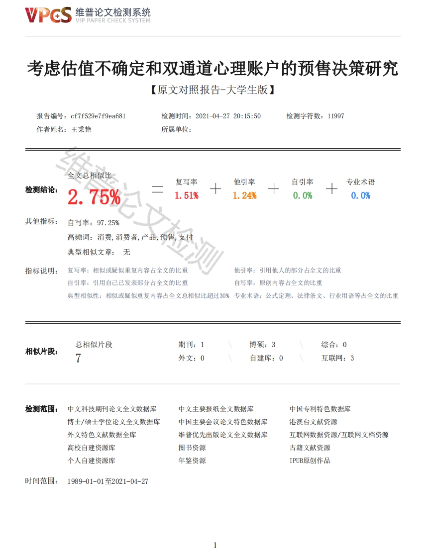 维普论文检测系统VIP PAPER CHECK SYSTEM考虑估值不确定和双通道心理账户的预售决策研究【原文对照报告-大学生版】报告编号:cf7f529e7f9ea681检测时间:2021-04-2720:15:50检测字符数:11997作者姓名:王秉艳所属单位:全文总相似比复写率他引率自引率专业术语检测结论:2.75%1.51%1.24%0.0%0.0%其他指标:自写率:97.25%高频词:消费,消费者,产品,预售,支付典型相似文章:无指标说明:复写率:相似或疑似重复内容占全文的比重他引率:引用他人的部分占全文的比重自引率:引用自己已发表部分占全文的比重自写率:原创内容占全文的比重典型相似性:相似或疑似重复内容占全文总相似比超过30%专业术语:公式定理、法律条文、行业用语等占全文的比重总相似片段期刊:1博硕:3综合:0相似片段:外文:0自建库:0互联网:3检测范围:中文科技期刊论文全文数据库中文主要报纸全文数据库中国专利特色数据库博士/硕士学位论文全文数据库中国主要会议论文特色数据库港澳台文献资源外文特色文献数据全库维普优先出版论文全文数据库互联网数据资源/互联网文档资源高校自建资源库图书资源古籍文献资源个人自建资源库年鉴资源IPUB原创作品时间范围:1989-01-01至2021-04-27维普论文检测系统VIP PAPER CHECK SYSTEM原文对照颜色标注说明:■自写片段■复写片段(相似或疑似重复)口引用片段(引用)■专业术语(公式定理、法律条文、行业用语等)考虑估值不确定和双通道心理账户的预售决策研究学生姓名:王秉艳指导教师:吴丽荣内容提要:本文基于消费者的双通道心理账户和对新产品的估值不确定,首先构建了不同支付方案下消费者在预售和现售两阶段下的效用函数,之后研讨了销售商在两阶段下的最优定价和预售期的最优配给量,最后通过matlab软件探究了快乐弱化系数和痛苦钝化系数对销售商产品最优定价和利润的影响,并对销售商提出了一些建议。关键词:预售双通道心理账户估值不确定1引言在电商和信息技术的高速发展下,预售变得越来越容易进行,也越来越受到商家的欢迎,所涉及的品类也越来越多。2020年以预售为代表的天猫双十一营销活动分两拨进行,给了商家更多的销售时间,在此期间主要有大家电、美容护肤、精品女装和零食坚果等几大热门品类。除此之外,一些商家在新品上市之前都会采用预售的方式进行多期销售,如苹果手机在发布会之后会采用溢价预售策略进行第一拨销售,华为智选海雀智能摄像头Pr0以低于现售阶段价格的售价进行预售。通过预售,消费者不但能比别人更早地体验商品用途,而且购买后其心理上会一种满足感和优越感。而对于商家而言,预售不仅能提前锁定消费者,了解消费者喜好,还能提前获得预付资金投入生产或采购,使其现金流更加稳健[1]。参与预售的消费者需要在预售阶段支付产品价格,等待到现售阶段才会收到产品,支付与消费过程的分离会影响消费者对产品价格和价值的感知[16]。芝加哥大学教授Richard Thaler认为人们在进行消费决策时会存在一个心理账户,分别记录其收入和支出[2]。而由心理账户研究拓展的双通道心理账户是指消费者在做出购买决策之前会从心理上分别记录从消费中获得的快乐以及支付时的痛苦,这二者的联结程度会影响其对产品的满意度,若付款时产生的痛苦能够被消费时获得的快乐有效弱化,则消费者会认为购买产品的决策是值得的[2]。同时,由于新产品在预售阶段还未有人使用,消费者在购买时无法参考他人评价及购买经历对其做出准确的估值,因而其在预售阶段对新产品的估值不确定,而消费者在购买时往往会以最大化自身购买效用为原则做出购买决策,这种不确定性会导致消费者推迟购买[3]。例如,华为在7月30日新品发布会上发布了华为手环B6、畅享平板2等五款新品,并于当天下午开始预售,有的消费者积极关注新品信息,参与了新品发布会,但并不是所有参与新品发布会的消费者都购买了产品。华为新品Mate40首批预售很快告罄,又开启了第二批预售,那么商家在预售期应该提供多少产品合适呢?商家又该如何制定预售策略以及现售阶段的产品售价?基于上述背景,本文将在考虑消费者双通道心理账户和估值不确定性的情况下,研究销售商在预售阶段的最优配给量和两阶段的最优产品售价,在此基础上探讨双通道心理账户对销售商预售策略和利润的影响。2文献综述与本文相关的文献主要涉及预售和双通道心理账户两类研究。近年来不少学者关于预售开展了大量研究,如王宣涛等[10]和李勇建等[11]考虑了预售背景下的退货策略,徐浩轩等[12]研究了商家对销售期较短的网络新产品进行预售时最优订货策略。还有的学者侧重于研究销售商如何制定预售策略,其中一些学者将消费者的异质性纳入了预售策略的考虑范围,如翟硕等[3]和李辉等[4]根据消费者是2维普论文检测系统VIP PAPER CHECK SYSTEM否知晓有关预售的信息将其分为告知型(或知情)消费者和非告知型(或非知情)消费者,探讨了商家最优的预售策略:计国君等[1]则研究了消费者对产品的估值和参照价格的偏好程度有所差异时商家的定价和预售策略;谷艳红等[5]将市场上的策略型消费者分成估值高的消费者、估值低的消费者,探究了销售商在产能受到约束时最优的预售策略。在预售阶段,消费者无法真实地感受商品,所以其对商品的估值无法确定。白世贞等[6]认为消费者在正常销售