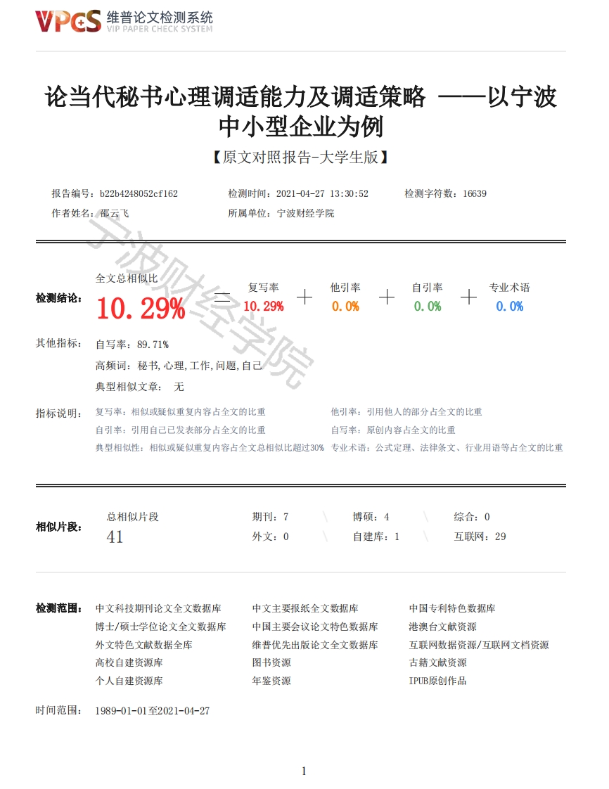 维普论文检测系统VIP PAPER CHECK SYSTEM论当代秘书心理调适能力及调适策略一一以宁波中小型企业为例【原文对照报告-大学生版】报告编号:b22b4248052cf162检测时间:2021-04-2713:30:52检测字符数:16639作者姓名:邵云飞所属单位:宁波财经学院全文总相似比复写率他引率自引率专业术语检测结论:10.29%经学10.29%0.0%0.0%0.0%其他指标:自写率:89.71%高频词:秘书,心理,工作,问题,自己典型相似文章:无指标说明:复写率:相似或疑似重复内容占全文的比重他引率:引用他人的部分占全文的比重自引率:引用自己已发表部分占全文的比重自写率:原创内容占全文的比重典型相似性:相似或疑似重复内容占全文总相似比超过30%专业术语:公式定理、法律条文、行业用语等占全文的比重总相似片段期刊:7博硕:4综合:0相似片段:41外文:0自建库:1互联网:29检测范围:中文科技期刊论文全文数据库中文主要报纸全文数据库中国专利特色数据库博士/硕士学位论文全文数据库中国主要会议论文特色数据库港澳台文献资源外文特色文献数据全库维普优先出版论文全文数据库互联网数据资源/互联网文档资源高校自建资源库图书资源古籍文献资源个人自建资源库年鉴资源IPUB原创作品时间范围:1989-01-01至2021-04-27维普论文检测系统VIP PAPER CHECK SYSTEM原文对照颜色标注说明:■自写片段■复写片段(相似或疑似重复)口引用片段(引用)■专业术语(公式定理、法律条文、行业用语等)宁宁波财经学院毕业论文(设计)论当代秘书心理调适能力及调适策略一以宁波中小型企业为例所在学院人文学院班级17秘书学2班姓名邵云飞学号1721630075指导教师富赋起止时间2020年6月-2021年4月2021年4月30日诚信声明我声明,所呈交的毕业设计作品和论文是本人在经过近四年的基础课程和专业课程学习的基础上,以及指导教师的指导下,经过几个月的集中毕业设计学习、实践和努力工作所取得的成果。据本人查证,除了文中特别加以标注和致谢的地方外,设计作品和论文中不包含其他人已经发表或撰写过的研究成果。我承诺,设计作品和论文中的所有内容均真实、可信。学生签名:签名日期:年月日目录2维普论文检测系统VIP PAPER CHECK SYSTEM诚信声明I摘要21绪论41.1研究的背景及意义41.2研究现状51.2.1国内秘书心理研究现状51.2.2国外秘书心理研究现状61.2.3国内外研究现状评述62秘书心理调适能力现状分析一以宁波中小企业为例82.1调查对象的基本信息82.2问卷调查分析83秘书的心理问题103.1自身发展易遇到的心理问题103.2人际交往常出现的问题103.3其他方面的心理问题114秘书应具备的心理调适能力124.1对心理问题的认知124.2增强抗压能力125秘书心理调适策略135.1注重自身发展135.2增强人际关系的适应能力135.3对压力有所认识,有所准备16经学院6结论与展望176.1研究结论176.2研究展望17附录21摘要在我国现代经济社会的进步与发展中,秘书管理人员在某个公司中所占的地位十分特殊,事务极其繁忙,再加上这里都是各种矛盾冲突的聚集地,其所遭受到的压力也是非常大的,如果不及时进行适当的调整,就可能会严重地景影响到个人的身心健康及正常的工作。秘书这是一项富于创新性和桃战的职业,它不但需要具备过硬的实际工作技巧,也要求具备非凡的精神和承受能力。秘书的精神心理品格素质是一个决定秘书管理活动与行为效果好坏一个关键因素。而且心理素质又是一种技术能力,能力的强弱对中小企业产生了巨大的影响。拥有这样一种精神层面上的信念,将会大幅度地促进公司秘书的工作。心理素质主要包括智力因素和非智力因素,即情商与智慧之间的差异。秘书管理工作中所处的地理位置与重重矛盾相互交叉的专业特点,决定着秘书管理工作的具有政治、政策、全面、复杂等特征。现在的各个专业都越来越需要一名精干的秘书,同时对于秘书人员素质也提出了新的更高要求。因此,秘书管理人员必须在不断地扩充自身的理论知识,提高自身各项办事技巧的同时,也必须要自觉地加强对心理素质的训练。为了更好地适应信息化时代的发展与现代人生活的需求,研究秘书管理人员的心理调适方法已经具有极其重大的前瞻性和现实意义,秘书的工作与社会之间的人际交往活动极其频繁、广泛,而由此导致引发的心理问题日益凸显,秘书管理人员首先需要做的事情就是对自己的职业角色进行定位,其次还应该寻找到一套适合于自己实际工作情况的调适手段。关键词:心理调适,调试策略,心理素质ABSTRACTWith in the development of modern society,secretary personnel in a company in the position isvery special,extremely busy affairs,plus is the collection point of all kinds of contradictions,itspressure is very big,if not timely adjustment,it will seriously affect personal physical and mentalhealth and work.Secretary is a career that is full of challenge,it needs to have excellent jobability not only,also want to have special psychology to bear ability.The psychological quality of3