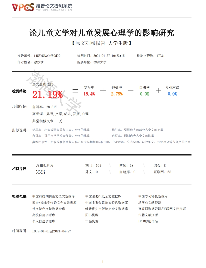 维普论文检测系统/IP PAPER CHECK SYSTEM论儿童文学对儿童发展心理学的影响研究【原文对照报告-大学生版】报告编号:1453b5d3cbf50d20检测时间:2021-04-2710:33:15检测字符数:17031作者姓名:漆沙沙所属单位:渤海大学全文总相似比复写率他引率自引率专业术语检测结论:21.19%18.4%2.79%0.0%0.0%其他指标:自写率:78.81%高频词:儿童,文学,幼儿,发展,心理典型相似文章:无指标说明:复写率:相似或疑似重复内容占全文的比重他引率:引用他人的部分占全文的比重自引率:引用自己已发表部分占全文的比重自写率:原创内容占全文的比重典型相似性:相似或疑似重复内容占全文总相似比超过30%专业术语:公式定理、法律条文、行业用语等占全文的比重总相似片段期刊:109博硕:38综合:8相似片段:223外文:0自建库:0互联网:68检测范围:中文科技期刊论文全文数据库中文主要报纸全文数据库中国专利特色数据库博士/硕士学位论文全文数据库中国主要会议论文特色数据库港澳台文献资源外文特色文献数据全库维普优先出版论文全文数据库互联网数据资源/互联网文档资源高校自建资源库图书资源古籍文献资源个人自建资源库年鉴资源IPUB原创作品时间范围:1989-01-01至2021-04-27维普论文检测系统VIP PAPER CHECK SYSTEM原文对照颜色标注说明:■自写片段■复写片段(相似或疑似重复)引用片段(引用)■专业术语(公式定理、法律条文、行业用语等)渤海大学本科毕业论文论儿童文学对幼儿心理发展的影响On the influence of children's literature on children'sdevelopmental psychology学院:教育科学学院专业:学前教育(师范)学号:17102214学生姓名:漆沙沙入学年度:2017年指导教师:孙悦完成日期:2021年4月14日渤海大学承诺书本人承诺:所呈交答辩的毕业论文(设计)与通过学校查重检测的毕业论文(设计)为同一版本,提交电子文档的内容和纸质论文(设计)的内容完全一致。并且在毕业论文(设计)撰写期间,指导教师已对本人进行了学术规范和学术诚信教育,学习了《学位论文作假行为处理办法》(教育部令第34号)、《高等学校预防与处理学术不端行为办法》(教育部令第40号)、《渤海大学预防和处理学术不端行为办法》《渤海大学本科生毕业论文(设计)管理办法》等文件,并严格遵照文件执行,如未遵照文件执行,所产生的后果和责任由本人承担。毕业论文(设计)作者签名:漆沙沙摘要党的十九大以来,学前教育领域受到越来越多的关注,如何促进幼儿的全面发展成为了社会关注的热点,其中幼儿的心理发展状态是评判幼儿是否全面发展的标准之一。随着家庭教育的不断发展与完善,越来越多的元素在幼儿生活中扮演着重要的角色,例如玩教具、儿童文学作品、游戏、奥尔夫音乐等。因为儿童文学作品在儿童教育方面所扮演的角色,作为幼儿接触的第一类书籍,可以为幼儿的心理带来最直观的体验与感受。儿童文学作品形式多样,其价值与功能对于幼儿的心理发展来说是大有益处的。在阅读和学习了一定数量的国内、国外有关儿童文学作品与幼儿发展心理学的相关资料以及研究成果的前提下,通过使用文献研究法,论述儿童文学的概念、现状与发展前景、与儿童心理学之间的联系等,分析了儿童文学的价值之所在。通过论述儿童发展心理学的概念、研究对象、影响儿童心理发展的因素,指出人们对幼儿生命发展重视程度的不断提高:其次通过跨学科研究法,总结儿童文学的发展历程、作用价值,从两方面重点论述了儿童文学对幼儿心理发展的影响,其一是从儿童文学本身入手,在儿童文学作品对儿童心理的积极作用、性格形成及儿童观的塑造等着笔,其二通过分析儿童文学与儿童发展心理学之间的关系,详细阐述了两种学科相互联结的共通点,凸显出儿童文学对幼儿发展心理学的影响。最后通过访谈法,调查幼儿园中性格内向的幼儿在通过阅读一定数量的儿童文学作品后,其性格所发生的变化,做出比较。通过上述调查研究,希望从中获得一些有用的判断和结论,拓宽儿童文学的界限,对幼儿心理的发展提供一些新思路。2维普论文检测系统VIP PAPER CHECK SYSTEM关键词:儿童文学:儿童发展心理学:儿童观:儿童思维On the influence of children's literature on children'sdevelopmental psychologyAbstractSince the 19th National Congress of the Communist Party of China,more and more attention hasbeen paid to preschool education,and how to promote children's all-round development has becomethe focus of social attention,among which the psychological development of children is one of thecriteria to judge whether children are all-round development.With the continuous development andperfection of family education,more and more elements play an important role in children's life,such as playing teaching AIDS,children's literature works,games,Orff music and so on.Becausechildren's literature works play a role in children's education,as the first kind of books thatchildren come into contact with,they can bring the most intuitive experience and feelings tochildren's psychology.Children's literature works have various forms,and their value andfunction are of great benefit to children's psychological development.On the premise of reading andstudying a certain amount of related materials and research results about children's literature andchildren's developmental psychology at home and abroad,this paper discusses the concept,presentsituation and development prospect of children's literature and its relationship with children'spsychology by using literature research met