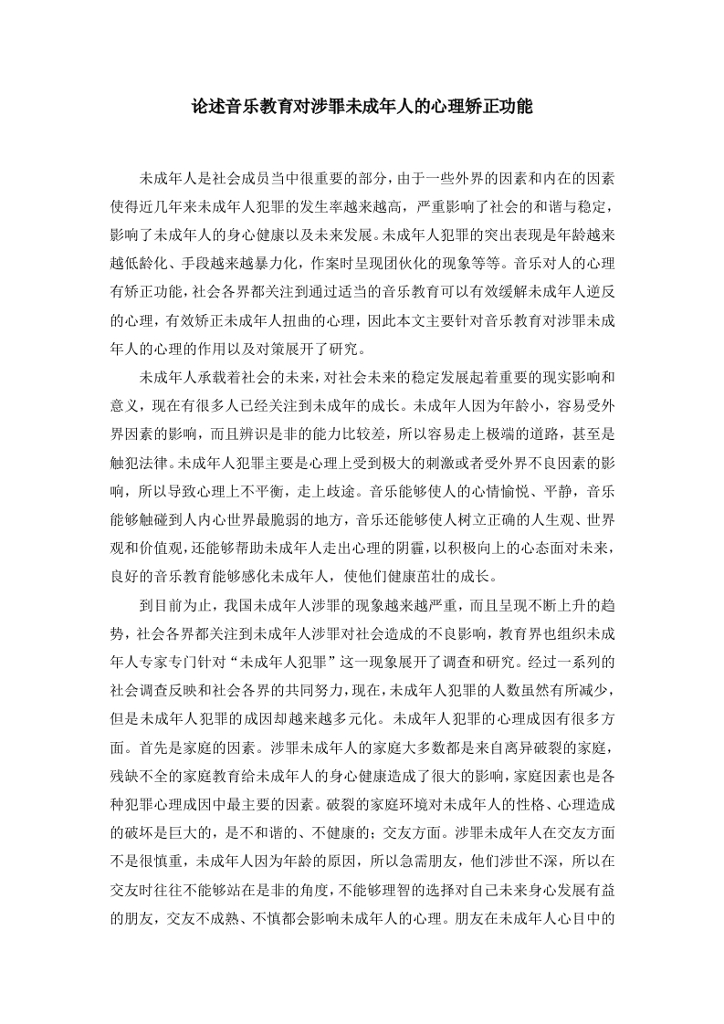 论述音乐教育对涉罪未成年人的心理矫正功能未成年人是社会成员当中很重要的部分,由于一些外界的因素和内在的因素使得近几年来未成年人犯罪的发生率越来越高,严重影响了社会的和谐与稳定,影响了未成年人的身心健康以及未来发展。未成年人犯罪的突出表现是年龄越来越低龄化、手段越来越暴力化,作案时呈现团伙化的现象等等。音乐对人的心理有矫正功能,社会各界都关注到通过适当的音乐教育可以有效缓解未成年人逆反的心理,有效矫正未成年人扭曲的心理,因此本文主要针对音乐教育对涉罪未成年人的心理的作用以及对策展开了研究。未成年人承载着社会的未来,对社会未来的稳定发展起着重要的现实影响和意义,现在有很多人已经关注到未成年的成长。未成年人因为年龄小,容易受外界因素的影响,而且辨识是非的能力比较差,所以容易走上极端的道路,甚至是触犯法律。未成年人犯罪主要是心理上受到极大的刺激或者受外界不良因素的影响,所以导致心理上不平衡,走上歧途。音乐能够使人的心情愉悦、平静,音乐能够触碰到人内心世界最脆弱的地方,音乐还能够使人树立正确的人生观、世界观和价值观,还能够帮助未成年人走出心理的阴霾,以积极向上的心态面对未来,良好的音乐教育能够感化未成年人,使他们健康茁壮的成长。到目前为止,我国未成年人涉罪的现象越来越严重,而且呈现不断上升的趋势,社会各界都关注到未成年人涉罪对社会造成的不良影响,教育界也组织未成年人专家专门针对“未成年人犯罪”这一现象展开了调查和研究。经过一系列的社会调查反映和社会各界的共同努力,现在,未成年人犯罪的人数虽然有所减少,但是未成年人犯罪的成因却越来越多元化。未成年人犯罪的心理成因有很多方面。首先是家庭的因素。涉罪未成年人的家庭大多数都是来自离异破裂的家庭,残缺不全的家庭教育给未成年人的身心健康造成了很大的影响,家庭因素也是各种犯罪心理成因中最主要的因素。破裂的家庭环境对未成年人的性格、心理造成的破坏是巨大的,是不和谐的、不健康的:交友方面。涉罪未成年人在交友方面不是很慎重,未成年人因为年龄的原因,所以急需朋友,他们涉世不深,所以在交友时往往不能够站在是非的角度,不能够理智的选择对自己未来身心发展有益的朋友,交友不成熟、不慎都会影响未成年人的心理。朋友在未成年人心目中的地位是很重要的,未成年人遇到挫折或者受到委屈时,往往是先想到朋友,所以朋友的不良、危险建议会给未成年人造成影响:网络传媒的影响。现在,互联网的普及对很多人来讲是好事,能够足不出户了解社会大事和每天发生的新鲜信息,但是对于心理年龄不是很成熟的未成年人来讲却未必是好事,网络上有很多色情、暴力的信息对未成年的影响很大,未成年是非观、社会观还没有形成,很容易受网络不良信息的熏陶和蛊惑,犯罪心理就自然形成了,犯罪行为就自然产生了。音乐教育对涉罪未成年人有很大的影响。未成年人对音乐都不是很了解,现在大多数的未成年人都喜欢听网络流行音乐,网络流行音乐对未成年人的心理和行为影响是很大的。所以要从网络流行音乐的教育入手,在网络上全面普及有教育意义又符合未成年人年龄特点和心理特点的音乐。在音乐中融入积极向上以及励志的思想,要让未成年人对音乐有足够的了解和需要,要对一些积极向上的音乐信任,才能够真正让音乐教育对未成年人发挥作用。良好的音乐教育能够对涉罪未成年人的心理状态产生影响,积极向上的音乐能够营造积极向上的氛围和环境,能够陶治未成年人的情操,能够让未成年保持乐观的心态,能够平复未成年人对社会和现实的不满,能够让未成年人树立积极向上的人生观和价值观。例如周杰伦的歌曲《蜗牛》,不管是歌词还是在语调上都能够在一定程度上改善未成年人的心理状态:未成年人的基本素质的培养受社会外界的影响很大,良好的音乐教育能够提高未成年人的基本素质,比如说《勇敢》这首歌曲,还有《隐形的翅膀》等等,都能够提高涉罪未成年人的基本素质,能够让他们在面对困难和挫折时有不屈不挠、迎难而上的品质。让涉罪未成年人更快地融入社会和生活,音乐教育在很大程度上反映的社会现实和生活,音乐教育也可以称为情感教育,能够让未成年人的情感升华,能够净化未成年人的心灵,音乐的语言都富有生机和活力。在未成年人喜爱的流行音乐中融合情感音乐,增强未成年人的责任感和道德感,让涉罪未成年人更快地融入社会和生活。稳定涉罪未成年人的情绪,涉罪未成年人一般都心理上不是很安定,而且对社会、学校和家庭都抱有怨恨的心理,情绪上的不稳定容易导致行为上的失衡,音乐教育能够平复涉罪未成年人的失衡情绪,比如说恩雅的歌曲,安静又不失大气。未成年人是社会的希望,是社会的未来。因此,社会各界一定要关注未成年人的发展,即使未成年人在成长的过程中误入歧途也不要轻言放弃,要让未成年人感受到社会的温暖。良好的音乐教育能够矫正未成年人不健康的心理,能够让涉罪未成年人更快地融入现实社会和生活,对涉罪未成年人的发展有积极向上的作用。音乐教育对矫正涉罪未成年人的心理有很好的作用,有很好的可行性和可靠性,值得在涉罪未成年人的教育上被广泛推