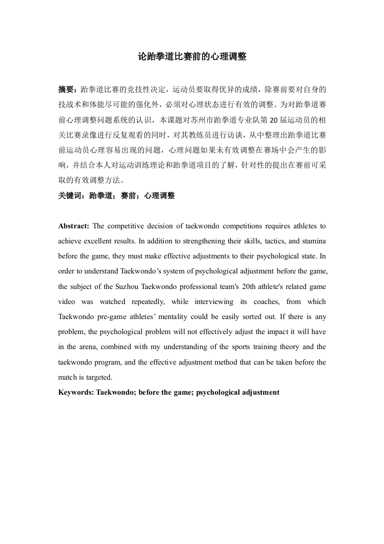 论跆拳道比赛前的心理调整摘要:跆拳道比赛的竞技性决定,运动员要取得优异的成绩,除赛前要对自身的技战术和体能尽可能的强化外,必须对心理状态进行有效的调整。为对跆拳道赛前心理调整问题系统的认识,本课题对苏州市跆拳道专业队第20届运动员的相关比赛录像进行反复观看的同时,对其教练员进行访谈,从中整理出跆拳道比赛前运动员心理容易出现的问题,心理问题如果未有效调整在赛场中会产生的影响,并结合本人对运动训练理论和跆拳道项目的了解,针对性的提出在赛前可采取的有效调整方法。关键词:跆拳道;赛前;心理调整Abstract:The competitive decision of taekwondo competitions requires athletes toachieve excellent results.In addition to strengthening their skills,tactics,and staminabefore the game,they must make effective adjustments to their psychological state.Inorder to understand Taekwondo's system of psychological adjustment before the game,the subject of the Suzhou Taekwondo professional team's 20th athlete's related gamevideo was watched repeatedly,while interviewing its coaches,from whichTaekwondo pre-game athletes'mentality could be easily sorted out.If there is anyproblem,the psychological problem will not effectively adjust the impact it will havein the arena,combined with my understanding of the sports training theory and thetaekwondo program,and the effective adjustment method that can be taken before thematch is targeted.Keywords:Taekwondo;before the game;psychological adjustment目录1.研究对象与方法1.1研究对象..1.2研究方法1.2.1文献资料法1.2.2观察法..2.1跆拳道比赛前运动员心理容易出现的问题.…22.1.2认知失调22.1.3紧张过度.…2.2跆拳道比赛前心理问题对比赛可能产生的影响.…42.2.1注意力不集中2.2.2技战术失准....53.跆拳道运动员赛前心理调整的建议53.1灵活的使用心理训练方法.3.2注重差异化的心理引导3.3提升技战术训练的科学性3.4积极使用鼓励性的训练语言结论:6参考文献:7前言:自2000年跆拳道成为奥运会比赛项目开始,每届奥运会我国在此项目都会获取金牌,优秀的奥运比赛成绩不仅彰显我国在跆拳道项目中处于较领先的水平,而且带动民众对跆拳道运动的喜爱程度不断提升。本人在在对喜爱的跆拳道项目的相关比赛进行观察中发现,很多技战术水平和身体素质并未表现出明显差距的运动员,在比赛中取得的成绩却差异明显,与跆拳道运动员的心理素质可能具有密切关系,所以针对此项目的赛前心理调整问题展开研究。1.研究对象与方法1.1研究对象为对跆拳道比赛前的心理调整问题系统的认识,本文以苏州市跆拳道专业队第20届的13名男子运动员为对象展开研究。1.2研究方法1.2.1文献资料法利用知网和万方查阅竞技比赛赛前心理调整的相关文章,从中选择10篇文档,对其进行资料分析,为本文研究做好一定的理论准备。1.2.2观察法通过观察研究对象参与的2017江苏省青少年跆拳道锦标赛以及日常训练中模拟比赛的录像视频,观察研究对象在比赛中的具体表现。结合相关运动员的日常表现,为进行赛前心理调整问题分析提供依据。1.2.3访谈法通过与调查对象的教练以及本人接触的其他多位跆拳道俱乐部优秀教练面对面的访谈交流,确定跆拳道比赛前心理调整的重要性以及目前调整采用的主要方法。访谈教练员数量共7名,基本信息如表1所示,具体访谈问卷见附录。表1接受访谈的教练员基本信息序号年龄性别教龄机构36男9俱乐部239女13体校339男11体校44015体校538女11俱乐部635男俱乐部732男6俱乐部2.研究结果与分析