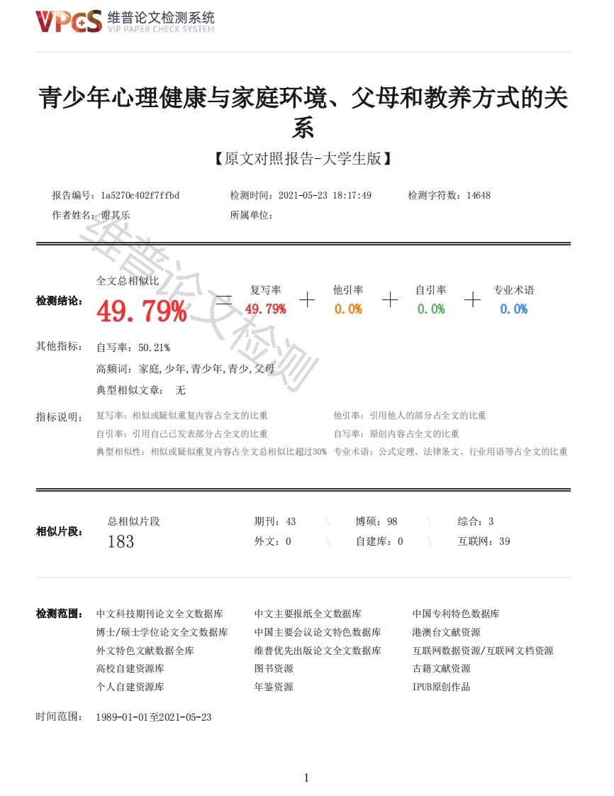 维普论文检测系统VIP PAPER CHECK SYSTEM青少年心理健康与家庭环境、父母和教养方式的关系【原文对照报告-大学生版】报告编号:1a5270c402f7ffbd检测时间:2021-05-2318:17:49检测字符数:14648作者姓名:谢其乐所属单位:全文总相似比复写率他引率自引率专业术语检测结论:49.79%49.79%0.0%0.0%0.0%其他指标:自写率:50.21%高频词:家庭,少年,青少年,青少,父母典型相似文章:无指标说明:复写率:相似或疑似重复内容占全文的比重他引率:引用他人的部分占全文的比重自引率:引用自己已发表部分占全文的比重自写率:原创内容占全文的比重典型相似性:相似或疑似重复内容占全文总相似比超过30%专业术语:公式定理、法律条文、行业用语等占全文的比重总相似片段期刊:43博硕:98综合:3相似片段:183外文:0自建库:0互联网:39检测范围:中文科技期刊论文全文数据库中文主要报纸全文数据库中国专利特色数据库博士/硕士学位论文全文数据库中国主要会议论文特色数据库港澳台文献资源外文特色文献数据全库维普优先出版论文全文数据库互联网数据资源/互联网文档资源高校自建资源库图书资源古籍文献资源个人自建资源库年鉴资源IPUB原创作品时间范围:1989-01-01至2021-05-23维普论文检测系统VIP PAPER CHECK SYSTEM原文对照颜色标注说明:■自写片段■复写片段(相似或疑似重复)口引用片段(引用)■专业术语(公式定理、法律条文、行业用语等)青少年心理健康与家庭环境、父母教养方式的关系学生:谢其乐(指导教师:蔡明兰)(淮南师范学院教育学院)摘要:随着社会的发展,近年来我国青少年面临的压力也越来越多元化,心理健康问题层不出穷,困扰着家长和孩子们。因此,关注青少年心理健康、促进青少年心理健康成长是一件刻不容缓的事。本文从家庭环境和父母教养方式两大家庭因素入手,采用问卷调查法,运用$PSS进行数据的录入与分析,讨论家庭环境、父母教养方式与青少年心理健康之间的关系。调查研究的结果表明,青少年心理健康(主观幸福感、情绪症状、攻击行为、亲社会行为)与家庭硬环境(家庭结构、父母文化程度、父母职业),家庭软环境(父母关系、亲子关系、家庭氛围)和父亲教养方式(情感温暖与理解:惩罚、严厉:过分干涉:偏爱被试:拒绝、否认:过度保护),母亲教养方式(情感温暖与理解:过分干涉、保护:拒绝、否认;惩罚、严厉:偏爱被试)存在各种相关性。关键词:青少年心理健康:家庭环境:父母教养方式The relationship between adolescents'mental health,family environment and parental rearingstylesStudent:Xieqile(Faculty Adviser:Caiminglan)(College of Education,Abstract:Family education is the starting point and foundation of all education.In recentyears,our country has developed rapidly.While people's material and spiritual lives have becomemore and more abundant,the mental health problems of teenagers have been endless,which plaguesparents and children.Therefore,paying attention to the mental health of young people and promotingthe growth of young people's mental health is a matter of urgency.This article starts with twofamily factors,family environment and parenting style,and discusses the relationship between themand the mental health of adolescents.The author uses a questionnaire survey method,uses SPSS toenter and analyze data,and discuss the relationship between family environment,parental rearingstyles and adolescents'mental health.The results of the difference analysis show that there aredifferences in the mental health status of adolescents in gender,the mental health status of onlychildren and non-only children.The results of correlation analysis show that there are variouscorrelations between various dimensions of the family environment and various factors of mentalhealth,and various factors of parental rearing style and various factors of mental health also havevarious correlations.Based on the secondary results,the author puts forward corresponding measuresand countermeasures in family education,trying to improve the family environment and parentalrearing methods that have adverse effects on the mental health of adolescents.2维普论文检测系统VIP PAPER CHECK SYSTEMKey words:Youth mental health;Family environment;Parenting style前言社会经济高速发展的当代,青少年所要承受的心理压力越来越重。其心理健康问题开始被更多的人关注,心理学术语“人格障碍”、“抑郁症”、“焦虑症”等也被广为熟知。青少年的心理健康除了受先天遗传因素的影响外,家庭因素中的家庭环境和父母教养方式在其发展中也有着举足轻重的作用。本课题研究的是青少年心理健康与家庭环境、父母教养方式的关系,目的是对不同家庭环境、父母教养方式下的青少年心理健康发展进行研究,分析得出之间的相关性,并在此基础上探究并深入了解我国青少年心理健康的家庭影响因素,从而为加强青少年心理健康建设提供依据和帮助,预防或减少当代青少年存在的一些心理健康问题。一、研究意义(一)理论意义本文先通过文献研究青少年心理健康与家庭环境、父母教养方式的关系,并在此基础上运用比较研究法,比较当前形势下所研究中的不足之处,从而对比得出新的研究思路,最后通过问卷调查研究发现青少年心理健康与家庭环境各维度的相关性、青少年心理健康与父母教养方式各因子的相关性,有助于丰富青少年心理健康教育现有的理论研究成果,在一定程度上也有助于丰富家庭教育理论。可以更全面地分析家庭环境、父母教养方式对青少年心理健康的影响,在某种程度上能