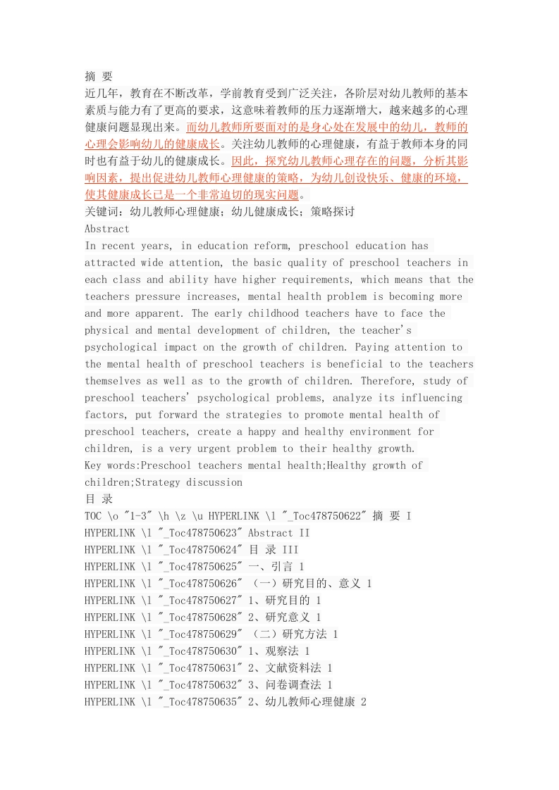 摘要近几年,教育在不断改革,学前教育受到广泛关注,各阶层对幼儿教师的基本素质与能力有了更高的要求,这意味着教师的压力逐渐增大,越来越多的心理健康问题显现出来。而幼儿教师所要面对的是身心处在发展中的幼儿,教师的心理会影响幼儿的健康成长。关注幼儿教师的心理健康,有益于教师本身的同时也有益于幼儿的健康成长。因此,探究幼儿教师心理存在的问题,分析其影响因素,提出促进幼儿教师心理健康的策略,为幼儿创设快乐、健康的环境,使其健康成长已是一个非常迫切的现实问题。关键词:幼儿教师心理健康:幼儿健康成长:策略探讨AbstractIn recent years,in education reform,preschool education hasattracted wide attention,the basic quality of preschool teachers ineach class and ability have higher requirements,which means that theteachers pressure increases,mental health problem is becoming moreand more apparent.The early childhood teachers have to face thephysical and mental development of children,the teacher'spsychological impact on the growth of children.Paying attention tothe mental health of preschool teachers is beneficial to the teachersthemselves as well as to the growth of children.Therefore,study ofpreschool teachers'psychological problems,analyze its influencingfactors,put forward the strategies to promote mental health ofpreschool teachers,create a happy and healthy environment forchildren,is a very urgent problem to their healthy growth.Key words:Preschool teachers mental health;Healthy growth ofchildren;Strategy discussion目录T0C\o"1-3”h\z\u HYPERLINK\1"_Toc478750622”摘要IHYPERLINK \1 Toc478750623"Abstract IIHYPERLINK\1”ToC478750624”目录IIIHYPERLINK\1”Toc478750625”一、引言1HYPERLINK\1”Toc478750626”(一)研究目的、意义1HYPERLINK\1”Toc478750627”1、研究目的1HYPERLINK\1”Toc478750628”2、研究意义1HYPERLINK\1”Toc478750629”(二)研究方法1HYPERLINK\1”_Toc478750630”1、观察法1HYPERLINK\1”Toc478750631”2、文献资料法1HYPERLINK\1”_Toc478750632”3、问卷调查法1HYPERLINK\1”ToC478750635”2、幼儿教师心理健康2HYPERLINK\1”Toc478750636”3、幼儿健康成长2HYPERLINK \1 Toc478750637"二、幼儿教师的心理健康对幼儿健康成长的影响2HYPERLINK \1 Toc478750639"(二)幼儿教师的心理健康影响幼儿的心理健康3HYPERLINK \1 Toc478750640"(三)幼儿教师的心理健康影响幼儿的社会适应能力3HYPERLINK \1 "_Toc478750642"三、幼儿教师心理健康的现状及存在问题4HYPERLINK\1”Toc478750643”(一)幼儿教师心理健康的现状4HYPERLINK\1”Toc478750644”1、幼儿教师心理健康状况调查4HYPERLINK\1”ToC478750648”2、幼儿教师的心理异常现象7HYPERLINK\1”Toc478750649”3、幼儿教师的行为问题8HYPERLINK\1”Toc478750650”四、影响幼儿教师心理健康的因素8HYPERLINK\1”Toc478750654”3、重大的教师责任9HYPERLINK\1”_Toc478750655”(二)学校的压力9HYPERLINK\1”ToC478750656”1、对教师职业的严格要求9HYPERLINK\1”ToC478750658”(三)社会及现实生活因素10HYPERLINK\1”ToC478750659”1、家长过高的期望10HYPERLINK\1”Toc478750660”2、社会对幼儿教师的片面理解10HYPERLINK\1”Toc478750661”3、生活的压力10HYPERLINK\1”Toc478750662”五、促进幼儿教师心理健康的策略10HYPERLINK\1”_ToC478750665”2、与人和谐相处,建立良好的人际关系11HYPERLINK\1”Toc478750666”3、掌握心理调适方法,学会进行自我调节11HYPERLINK\1”Toc478750667”(二)学校完善管理机制,以人为本,科学管理11HYPERLINK\1”Toc478750668”1、合理安排工作强度11HYPERLINK\1”_Toc478750669”2、营造和谐轻松的环境12HYPERLINK\1”Toc478750670”3、加强心理健康教育12HYPERLINK\1”_Toc478750672”(三)创建良好的社会环境12HYPERLINK\1”Toc478750673”1、加强社会宣传力度12HYPERLINK\1”ToC478750674”2、加强社会支持力度12六、HYPERLINK\1”Toc478750675”结束语13HYPERLINK\1”ToC478750676”参考文献14HYPERLINK\1”_Toc478750677”附录15HYPERLINK\1”_Toc478750678”谢辞17一、引言(一)研究目的、意义1、研究目的随着经济社会的发展、就业压力加重、家长的期望愈来愈高、教育内容愈加丰富等多种因素影响,幼儿教师的压力越来越大,她们的心理健康问题也越来越多。而幼儿教师的心理健康关乎幼儿的健康成长,因此,本论文从分析幼儿教师的心理对幼儿成长的影响以及教师心理问题产生的缘由出发,提出促进幼儿教师心理健康的策略。2、研究意义与其他阶段相比,幼儿期是身心发展相对较快的阶段之一,此阶段幼儿受外界影响较为深远。如果教师情绪不稳可能导致幼儿焦虑、易怒:如果行为冲动则可能直接影响幼儿潜在的行为模式:如果教师的人生观和价值观有问题则会对幼儿道德的发展产生深远的不利影响。换而言之,幼儿教师良好的心理才能有助于幼儿成长。并且《幼儿园工作规程》中提出“幼儿园应当贯彻保育与教直相结合的原则,促进幼儿身心和谐发展,应当切实做好幼儿的心理保健工作。”所以,幼儿教师在提高专业知识与教学能力的基础上,还应保持健康的心理状态,幼儿成长的主要场所之一就是幼儿园,幼儿教师的言行举止都会影响幼儿的成长。所以,研究幼儿教师的心理与幼儿成长的联系十分必要。(二)研究方法1、观察法在研究中,本着实事求是的态度仔细观察幼儿教师的一举一动,对其行为表现进行深入分析,为论文提供重要案例,为策略的提出奠定基础。2、文献资料法通过查阅相关文献,分析近几年论文、期刊,了解并认识幼儿教师心理健康,参考相关经验,分析幼儿教师心理对幼儿健康成长的影