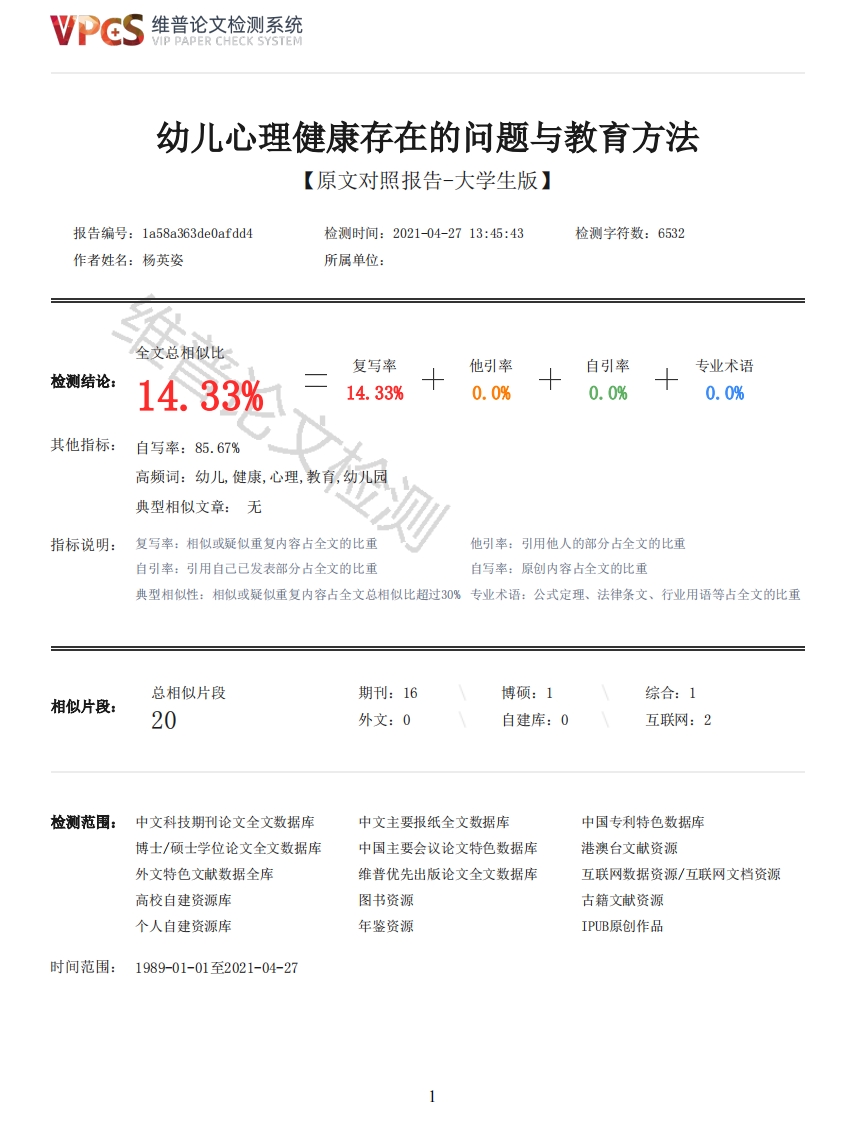 维普论文检测系统VIP PAPER CHECK SYSTEM幼儿心理健康存在的问题与教育方法【原文对照报告-大学生版】报告编号:1a58a363de0afdd4检测时间:2021-04-2713:45:43检测字符数:6532作者姓名:杨英姿所属单位:全文总相似比复写率他引率自引率专业术语检测结论:14.33%14.33%0.0%0.0%0.0%其他指标:自写率:85.67%高频词:幼儿,健康,心理,教育,幼儿园典型相似文章:无指标说明:复写率:相似或疑似重复内容占全文的比重他引率:引用他人的部分占全文的比重自引率:引用自己已发表部分占全文的比重自写率:原创内容占全文的比重典型相似性:相似或疑似重复内容占全文总相似比超过30%专业术语:公式定理、法律条文、行业用语等占全文的比重总相似片段期刊:16博硕:1综合:1相似片段:20外文:0自建库:0互联网:2检测范围:中文科技期刊论文全文数据库中文主要报纸全文数据库中国专利特色数据库博士/硕士学位论文全文数据库中国主要会议论文特色数据库港澳台文献资源外文特色文献数据全库维普优先出版论文全文数据库互联网数据资源/互联网文档资源高校自建资源库图书资源古籍文献资源个人自建资源库年鉴资源IPUB原创作品时间范围:1989-01-01至2021-04-27维普论文检测系统VIP PAPER CHECK SYSTEM原文对照颜色标注说明:■自写片段■复写片段(相似或疑似重复)口引用片段(引用)■专业术语(公式定理、法律条文、行业用语等)装订网络与继续教育学院Fujian Normal University福建师范大学现代远程教育毕业论文题目:幼儿园心理健康教育存在的问题和对策思考学习中心:奥鹏远程教育惠州学习中心(直属)[18]专业:学前教育年级:1809学号:182201808709104学生姓名:杨英姿导师姓名:李涛2021年4月7日福建师范大学网络与继续教育学院本科毕业论文(设计)诚信承诺书本人郑重承诺:本篇毕业论文(设计)是本人在指导教师指导下独立完成的,不存在抄袭、剽窃行为,引用他人观点和参考资料均加以注释和说明。如果存在与上述承诺不符的弄虚作假、抄袭等违反学术规范的行为,本人愿意接受学校按有关规定给予的处理,并承担一切责任。学员签名(手写):年月日幼儿园心理健康教育存在的问题和对策思考网络与继续教育学院(学院)学前教育(专业)(杨英姿182201808709104指导教师:李涛)【摘要】改革开放以来,我国加大了对教育事业的投入,教育事业不断进步,幼儿教育也取得了空前进展,幼儿心理健康问题逐渐受到各界人士的重视,已成为幼儿园,家庭,社会关注的热点。幼儿心理健康对幼儿的成长有着十分重要的影响,影响着幼儿的身心健康。但目前我国的幼儿心理健康教育并不是很规范,逐渐暴露出一些问题,比如受传统观念影响,缺乏合适的师资力量,没有合适的教育方式,幼儿普遍心理脆弱,独立性差,自控力差等等。及时探讨幼儿心理健康教育中存在的问题,尽快给幼儿们一个健积极的心态是我们刻不容缓的使命。本文通2维普论文检测系统VIP PAPER CHECK SYSTEM过研究幼儿心理健康教育中存在的问题,并根究存在问题提出了相关的对策与建议。【关键词】幼儿园:心理健康教育:对策思考一、引言《幼儿园教育指导纲要》指出,幼儿园工作的首位便是保护幼儿的性命和促进幼儿健康成长,健康并不仅仅只是身体健康,更是包括了心理的健康。心理健康早已成为了健康概念的重要组成部分。随着我国的幼儿教育不断取得发展,幼儿心理健康教育逐渐受到人们的关注。但是在进行心理教育的过程中,幼儿的一些表现却向我们反映了我们的心理健康教育存在问题。有些幼儿出现自闭症,注意力不集中,脾气暴躁,说谎,打架,自私,爱哭鼻子等等。以往在幼儿教育中,我们更多的是注重身体健康,忽略了心理健康,我们总是以为,幼儿是无忧无虑,没有什么心思,很容易快乐的,但目前幼儿出现的这些问题应当引起我们的重视和反思。因此,我们必须要针对幼儿心理健康教育中出现的问题进行研讨,找寻其背后存在的多重因素,尽快解决问题,在幼儿园教育工作中有效的实现教师与家长与幼儿之间的互动沟通,共同重视幼儿心理健康,确保幼儿心理健康发展。二、幼儿心理健康教育中存在的问题在此之前,专门前往一家幼儿园进行有关幼儿心理健康教育的调查,通过观察幼儿和与教师沟通分析,得出如下结果,幼儿园每半年召开一次家长会,主要内容为接送孩子时间,学费问题等。共选取100个幼儿进行调查,家长与幼儿园的关系更多的时候是在接送孩子的时候,其中有87位幼儿家长仅仅是将孩子放在幼儿园门口,与教师打个招呼,13位家长与教师进行简单的沟通。选取其中30位家长简单沟通,发现超过65%的家长认为把孩子送到幼儿园,幼儿园就应该承担起教学,照顾的所有责任,家长与教师认真探讨的次数少之又少。(一)幼儿园不够重视幼儿心理健康教育随着幼儿教育的不断发展,幼儿园都基本已经形成了一套完备科学的教学体系,然而在实际教学中,多数幼儿园都将重心放在了知识教育上,而忽视了对幼儿的心理健康教育。而且许多幼儿园在实施有关促进幼儿心理健康活动的同时,却因受到部分幼儿性格内向不配合,教师不重视忽略等原因而没能起到理想的效果。有的幼儿园开展心理健康教育的对象只是部分内向,不爱说话,行为不合理的儿童,却忽略了更大一部分的幼儿。其实,心理健康教育应当针对的是全体儿童,而不仅仅是个别。除此之外,幼儿园未能开展