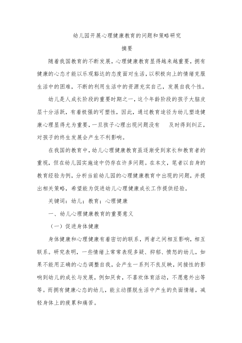 幼儿园开展心理健康教育的问题和策略研究摘要随着我国教育的不断发展,心理健康教育显得越来越重要,拥有健康的心态才能以乐观豁达的态度面对生活,以积极向上的情绪克服生活中的困难,不断的利用生活中的资源充实自己,发展自我个性。幼儿是人成长阶段的重要时期之一,这个年龄阶段的孩子大脑皮层十分活跃,有着极强的可塑性,因此,通过教育途径为幼儿塑造健康心理显得尤为重要,一旦孩子心理出现问题没有及时得到纠正,对孩子的终生发展会产生不利影响。在我国的教育中,幼儿心理健康教育虽逐渐受到家长和教育者的重视,但在幼儿园实施途中仍存在许多问题。在本文,笔者以自身的教育经验为例,分析当前幼儿园的心理健康教育中出现的问题,并提出相关策略,希望能为促进幼儿心理健康成长工作提供经验。关键词:幼儿;教育;心理健康一、幼儿心理健康教育的重要意义(一)促进身体健康身体健康和心理健康有着密切的联系,两者之间相互影响,相互联系。研究表明,一些情绪上常常表现多疑、抑郁、愤怒的幼儿,如果不能用正确的心态调整自我,会产生一系列不良反映,间接性的影响到幼儿的成长与发展,例如厌食,不喜欢体育活动,不愿意外出等等。而拥有健康心态的幼儿,能主动摆脱生活中产生的负面情绪,减轻身体上的疲累和痛苦。(二)开发幼儿智力当幼儿感到心里有压力时,容易感到焦躁不安,敏感抑郁,从而出现感知力下降,思维变慢的情况,这对幼儿的智力发展会产生不利的影响,通过实践证明,幼儿只有感到轻松、愉悦时才会排除没必要的忧虑和烦恼,主动增进体脑发展,用活跃的思维接受外界的新事物,寻找解决问题的办法,开发大脑智力。(三)促进性格形成性格是心理的体现,是大脑活动的产物,一旦形成关系终生,因此开展心理教育,能让幼儿为自己塑造理想形象,不断调节自我理想和自我之间的平衡,帮助幼儿发展个性,克服易怒、固执、孤僻等心理状态,形成良好的人格。二、幼儿园实施心理健康教育的问题(一)幼儿园没有系统的心理健康课程体系为了加强幼儿园对幼儿心理健康教育的重视,教育部在《纲要》中明确的为幼儿心理健康教育指明了方向,主要内容包括:激发幼儿求知欲,为幼儿树立自信心,提高幼儿耐挫力,培养幼儿调解情绪的能力等等。但《纲要》中只是为幼儿心理健康教育的目标进行了概括,并没有给出一个可操作性的课程体系,这便让教师在开展心理健康教育时感到手足无措,只能通过上网搜索资料,自己摸索相关方案实施教学计划。同时,因为幼儿园没有没有系统的心理健康课程体系,有关幼儿心理健康教育的书本也十分少,没有了科学性的指导,这无疑让教师在开展心理健康时增加了难度。(二)教师对幼儿心理健康教育有心无力1.幼儿教师对心理健康教育的知识掌握不够当前,在高校培养幼儿教师时,更注重专业技能的培养,忽视了对幼儿教师理论知识的培养,这就导致让幼儿园在开展心理健康教育时出现两个现象:第一,幼师在教学中更加关注培养学生的实践能力,忽视对幼儿的心理健康教育。第二,因为在走向工作岗位之前,幼师缺乏对心理健康教育方面的理论知识,在开展幼儿心理健康教育时,会因为相关的知识掌握不够出现许多困难。而部分在岗的老教师,受传统教育观念的影响,她们对有关幼儿心理健康教育的新观点的接受能力较弱,因此,在实践教学会感到有心无力。2.幼儿教师开展心理健康教育缺少支持幼儿教师开展心理健康教育缺少支持主要体现在两个方面:第一,教师缺少精神支持,根据我的调查发现,幼儿园教师从每天上班到下班的时间段里,需要用充沛的精力面对孩子,每天长时间