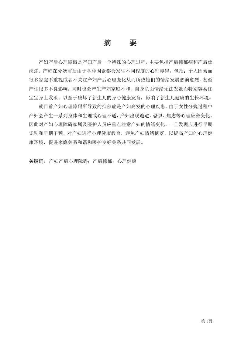 摘要产妇产后心理障碍是产妇产后一个特殊的心理过程,主要包括产后抑郁症和产后焦虑症。产妇在分娩前后由于各种因素都会发生不同程度的心理障碍,包括:个人因素而很多家庭不重视或者不关注产妇产后心理变化从而所致她们的情绪发展愈演愈烈,甚至产生很多不良影响:同时也会产生产妇家庭不和、自身负面情绪无法发泄而特别容易往宝宝身上发泄、以至于破坏了新生儿的身心健康发育,影响了新生儿健康的生长环境。就目前产妇心理障碍所导致的抑郁症是产妇高发的心理疾患,由于女性分娩过程中产妇会产生一系列身体和生理或心理不适,产妇出现逃避、恐惧、焦虑等心理应微变化。因此对产妇心理障碍家属及医护人员应重点注意产妇的情绪变化,一旦发现应进行早期识别和早期干预,对产妇进行心理健康教育,避免产妇情绪低落,以提高产妇的心理健康环境,促进家庭关系和谐和医护良好关系共同发展。关键词:产妇产后心理障碍:产后抑郁:心理健康第1页AbstractFrom Puerperal psychological disorder is a special psychological process of puerpera,including postpartum depression and postpartum anxiety.Puerpera before and after childbirthdue to a variety of factors will occur different degrees of psychological disorders,including:personal factors and many families do not pay attention to or do not pay attention to puerperapsychological changes resulting in their emotional development intensified,and even producea lot of adverse effects;At the same time,there will also be maternal family discord,their ownnegative emotions can not vent,especially easy to vent to the baby,so as to destroy thephysical and mental health of the newborn development,affect the healthy growthenvironment of the newborn.At present,maternal depression caused by maternal psychological disorders is a highincidence of maternal psychological disorders,because women in the process of childbirthwill produce a series of physical and physiological or psychological discomfort,maternalescape,fear,anxiety and other psychological stress changes.Therefore,the family membersand medical staff of maternal psychological disorders should focus on maternal mood changes,once found should be early identification and early intervention,maternal mental healtheducation,to avoid maternal depression,to improve maternal mental health environment,promote the harmonious family relationship and good medical relations of commondevelopment.Key Words:Puerpera psychological disorders,postpartum depression,psychological health第2页目录摘要Abstract…2第1章绪论1.2研究目的…51.3研究意义…第2章国内外文献综述2.1国内文献综述…2.2国外文献综述…第3章研究的主要内容及方法3.1研究的主要内容.…3.2研究方法3.2.1文献研究法…3.2.2问卷调查法第4章相关概念及其原因和表现..104.1相关概念..104.1.1产后抑郁.104.1.2产后焦虑…4.2原因4.2.1有关产后抑郁的原因分析.….104.2.2有关产后焦虑的原因分析.114.3表现…4.3.2产后抑郁的表现124.3.2产后焦虑的表现….12第5章某医院产妇产后心理障碍的现状及原因分析….145.1调研设计与基本数据统计5.1.2问卷设计.145.1.3问卷收集与整理第3页