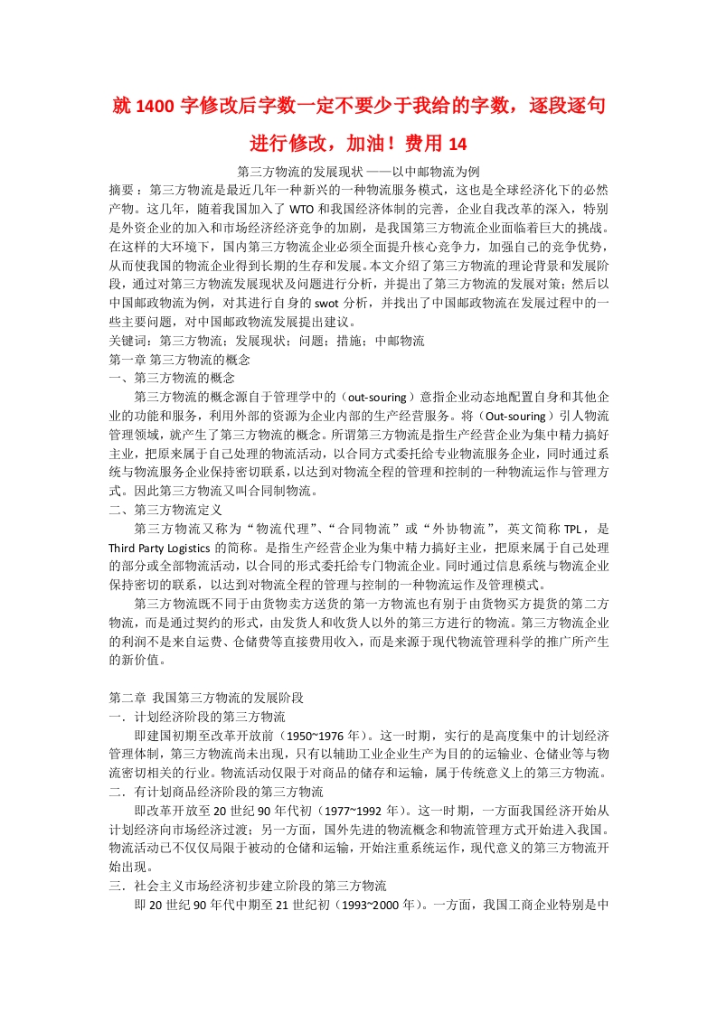 就1400字修改后字数一定不要少于我给的字数,逐段逐句进行修改,加油!费用14第三方物流的发展现状一一以中邮物流为例摘要:第三方物流是最近几年一种新兴的一种物流服务模式,这也是全球经济化下的必然产物。这几年,随着我国加入了WTO和我国经济体制的完善,企业自我改革的深入,特别是外资企业的加入和市场经济经济竞争的加剧,是我国第三方物流企业面临着巨大的挑战。在这样的大环境下,国内第三方物流企业必须全面提升核心竞争力,加强自己的竞争优势,从而使我国的物流企业得到长期的生存和发展。本文介绍了第三方物流的理论背景和发展阶段,通过对第三方物流发展现状及问题进行分析,并提出了第三方物流的发展对策:然后以中国邮政物流为例,对其进行自身的swOt分析,并找出了中国邮政物流在发展过程中的一些主要问题,对中国邮政物流发展提出建议。关键词:第三方物流:发展现状:问题:措施:中邮物流第一章第三方物流的概念一、第三方物流的概念第三方物流的概念源自于管理学中的(out-souring)意指企业动态地配置自身和其他企业的功能和服务,利用外部的资源为企业内部的生产经营服务。将(Out-souring)引人物流管理领域,就产生了第三方物流的概念。所谓第三方物流是指生产经营企业为集中精力搞好主业,把原来属于自己处理的物流活动,以合同方式委托给专业物流服务企业,同时通过系统与物流服务企业保持密切联系,以达到对物流全程的管理和控制的一种物流运作与管理方式。因此第三方物流又叫合同制物流。二、第三方物流定义第三方物流又称为“物流代理”、“合同物流”或“外协物流”,英文简称PL,是Third Party Logistics的简称。是指生产经营企业为集中精力搞好主业,把原来属于自己处理的部分或全部物流活动,以合同的形式委托给专门物流企业。同时通过信息系统与物流企业保持密切的联系,以达到对物流全程的管理与控制的一种物流运作及管理模式。第三方物流既不同于由货物卖方送货的第一方物流也有别于由货物买方提货的第二方物流,而是通过契约的形式,由发货人和收货人以外的第三方进行的物流。第三方物流企业的利润不是来自运费、仓储费等直接费用收入,而是来源于现代物流管理科学的推广所产生的新价值。第二章我国第三方物流的发展阶段一.计划经济阶段的第三方物流即建国初期至改革开放前(1950~1976年)。这一时期,实行的是高度集中的计划经济管理体制,第三方物流尚未出现,只有以辅助工业企业生产为目的的运输业、仓储业等与物流密切相关的行业。物流活动仅限于对商品的储存和运输,属于传统意义上的第三方物流。二,有计划商品经济阶段的第三方物流即改革开放至20世纪90年代初(19771992年)。这一时期,一方面我国经济开始从计划经济向市场经济过渡:另一方面,国外先进的物流概念和物流管理方式开始进入我国。物流活动己不仅仅局限于被动的仓储和运输,开始注重系统运作,现代意义的第三方物流开始出现。三,社会主义市场经济初步建立阶段的第三方物流即20世纪90年代中期至21世纪初(19932000年)。一方面,我国工商企业特别是中外合资企业为了提高竞争力而不断提出新的物流需求:另一方面,物流活动逐渐摆脱部门附属机构的地位,开始按照市场规律要求开展物流活动物流服务的范围和领域也不断扩大。四.社会主义市场经济逐步完善阶段的第三方物流即21世纪初期至今。这一时期,一方面随着中国加入WT0,政府对物流业的管制和保护逐渐放开,国外颇具竞争力的大型物流企业竞相涌入中国,国内物流业竞争空前激烈:另一方面,企业对物流领域中存在的第三利润源泉开始有了比较深刻的认识。再者,物流产业发展引起中央政府和各地政府的高度重视,各级政府积极为物流业发展创造良好的宏观环境。本文选取此发展阶段为分析的时间段。第六章中国邮政物流的SW0T分析中国邮政物流企业的生存环境变动性越来越大,是因为世界经济全球化、整体化的迅速发展,尤其是科学技术,经济,社会生活等方面的不断发展,物流需求的扩大和世界信息网络的成立。邮政物流在这种变化的影响下发生了变动。所以,能够正确的利用SW0T分析来研究邮政物流企业显得尤为重要。邮政物流的SW0T分析有以下几点:邮政物流的优势分析1.网络优势邮政物流之所以拥有发展现代物流的特别优势,是因为它把消息的流动、物品的流动和资金的流动形成“三流合一”。首先,随着时代的不断发展,邮政物流的运营结构趋于合理,形成了以火车行邮专列为主的物流中心网、以邮航为主的航空网,以汽车为主的地域和省内快速网以及市到县的投递配送网,这些结构的形成,让邮政物流实物运输网络逐渐覆盖全国。其次,中国邮政物流整体消息平台通过物流生产全过程的信息化,实现了只要提供物流信息方面的邮件就可以时时刻刻知道物流的动态,同时邮政物流的目标是建设一个以客户为主,以及供应链遍布各个环节,整个国家大集中的网络信息平台。最后,了解到在资金流方面,通过邮政大网资源和邮政金融网络的相结合,使邮政物流的消息流、资金流、实物流可以更好的结合,使收件人付费和代收贷款等业务的发展加快。2.品牌优势随着经验的不断累积,邮政物流形成了高效有序的规模,同时满足市场多样化需求的产品服务结构也