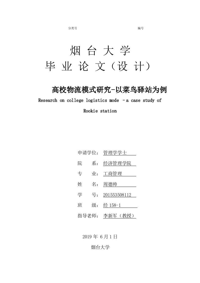 分类号编号烟台大学毕业论文(设计)高校物流模式研究-以菜鸟驿站为例Research on college logistics mode -a case study ofRookie station申请学位:管理学学士院系:经济管理学院专业:工商管理姓名:周德帅学201553508112班级:经158-1指导老师:李新军(教授)2019年6月1日烟台大学高校物流模式研究-以菜鸟驿站为例姓名:周德帅导师:李新军2017年6月1日烟台大学烟台大学毕业论文(设计)任务书院(系):经济管理学院姓名周德帅学号201553508112毕业届别2019专业工商管理(物流外包)毕业论文(设计)题目高校物流模式研究一以菜鸟驿站为例指导教师学历研究李新军生职称教授所学专业管理科学与工程主要内容:由于高校的特殊性,学校对学生及校外人员管理非常严格,随着校园快递数量的不断增多和规模的不断扩大,传统的快递企业配送网络很难满足在校师生对时效和服务的需求。在部分高校,各大快递企业进驻校园之后也出现了物流服务落后、低水平竞争和缺乏固定场地等诸多问题,严重影响到高校校园快递的健康发展。近年来,为了做好高校“最后一公里”的快递服务,菜鸟驿站在各个高校蓬勃兴起,将各个快递企业集中整合,统一对快递进行收寄和派发,既降低了快递企业的成本,也为高校师生提供了更加优质的服务。但是在菜鸟驿站终端数量增长,客户增加的基础上,菜鸟驿站物流业务发展过程也暴露了一系列问题,突出体现在服务方面,本文结合菜鸟驿站发展过程中存在的问题,针对性的提出菜鸟驿站物流业务的完善建议,旨在提高菜鸟驿站的物流服务水平。基本要求:1、按《烟台大学有关毕业论文工作的有关规定》要求撰写论文2、起草论文之前须至少阅读10-30篇相关正规刊物的文献,主要文献控制在近五年3、正文字数5000-10000字:杜绝抄袭,文责自负,错字率在2%以内主要参考文献:[1]杨婷婷.我国校园电子商务的发展现状及对策分析.2017[2]王俊.电子商务环境下“最后一公里”物流配送模式研究.2017[3]许鹏.高校中的电商“最后一公里”配送模式研究.2016进度安排:11月21日-1月15日:定题目,查文献1月16日-2月26日:提纲修改完毕,开始写初稿2月27日-3月31日:初稿完毕,提交,修改。4月1日-4月23日:二稿、三稿完毕,严格按导师的批改进行修改。4月24日-5月1日:学术检索,提交定稿,打印,准备答辩事宜。指导教师(签字):年月日院(系)意见:教学院长(主任)(签字):年月日备注: