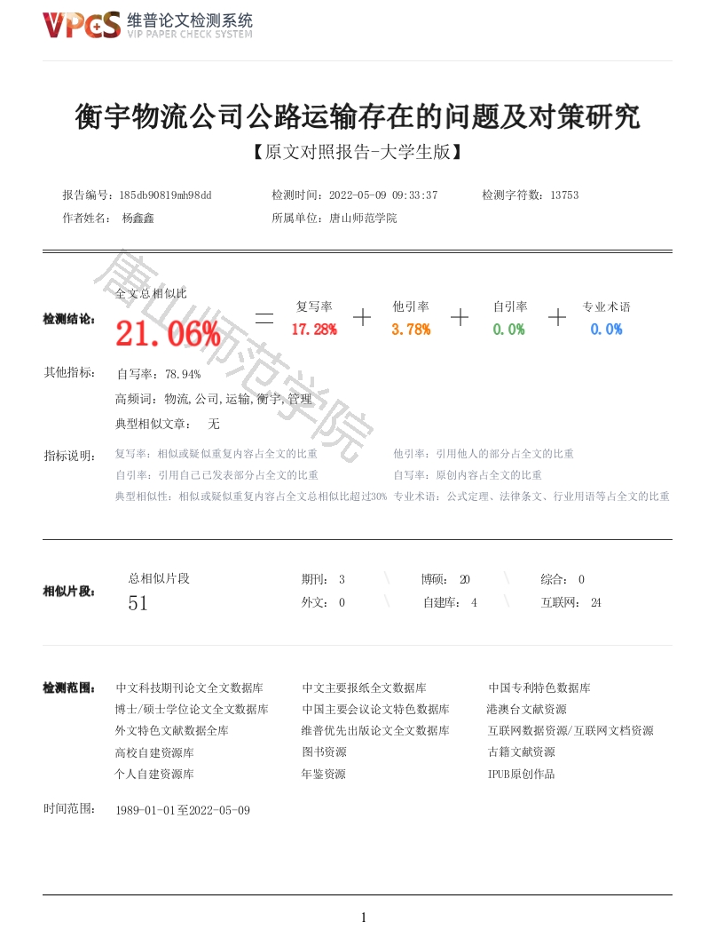 维普论文检测系统VIP PAPER CHECK SYSTEM衡宇物流公司公路运输存在的问题及对策研究【原文对照报告-大学生版】报告编号:185db90819mh98dd检测时间:202205-0909:33:37检测字符数:13753作者姓名:杨鑫鑫所属单位:唐山师范学院全文总相似比复写率他引率自引率专业术语检测结论:21.06%17.28%3.78%0.0%0.0%其他指标:自写率:78.94%高频词:物流,公司,运输,衡宇,管理典型相似文章:无指标说明:复写率:相似或疑似重复内容占全文的比重他引率:引用他人的部分占全文的比重自引率:引用自己己发表部分占全文的比重自写率:原创内容占全文的比重典型相似性:相似或疑似重复内容占全文总相似比超过3%专业术语:公式定理、法律条文、行业用语等占全文的比重总相似片段期刑:3相似片段:51外文:0自建库:4互联网:24检测范围:中文科技期刊论文全文数据库中文主要报纸全文数据库中因专利特色数据库博士/硕士学位论文全文数据库中国主要会议论文特色数据库港澳台文献资源外文特色文献数据全库维普优先出版论文全文数据库互联网数据资源/互联网文档资源高校自建资源库图书资源古籍文献资源个人自建资源库年鉴资源IPUB原创作品时间范围:198901-01至2022-05-091VPCS维普论文检测系统VIP PAPER CHECK SYSTEM颜色标注说明:■自写片段■复写片段(相似或疑似重复)☐引用片段(引用)■专业术语(公式定理、法律条文、行业用语等)唐山师范本科毕业论文衡宇物流公司公路运输存在的问题及对策研究姓名杨鑫鑫学号201500000530院系经济管理系专业物流管理指导教师王鸿昌二零二二年三月十四日本科毕业论文原创性声明本人所提交的毕业论文《衡宇物流公司公路运输存在的问题及对策研究》,是在导师的指导下,独立进行研究工作所取得的原创性成果。除文中己经注明引用的内容外,本论文不包含任何其他个人或集体己经发表或撰写过的研究成果。对本文的研究做出重要贡献的个人和集体,均己在文中标明。本声明的法律后果由本人承担。论文作者(签名):指导教师确认(签名):2022年3月14日年月日本科毕业论文版权使用授权书本毕业论文作者完全了解唐山师范学院有权保留并向国家有关部门或机构送交学位论文的复印件和磁盘,允许论文被查阅和借阅。本人授权唐山师范学院可以将毕业论文的全部或部分内容编入有关数据库进行检索,可以采用影印、缩印或其它复制手段保存、汇编学位论文。保密的学位论文在年解密后适用本授权书。论文作者(签名):指导教师(签名):2022年3月14日年月日摘要随着我国现代物流业的快速发展,物流运输领域的市场竞争日趋激烈。传统的公路运输和仓储方式己无法完全满足物流服务需求。在当今市场经济环境下,物流行业的竞争越发激烈,以马路运输为主要运输方式的物流公司,VPCS维普论文检测系统VIP PAPER CHECK SYSTEM也需要紧跟当今社会、经济、科技发展环境,更新自身物流管理制度,借助现代物流科技不断提升自身物流服务水平。因此有必要对物流公司公路运输问题进行研究。本次研究以衡宇物流公司作为研究对象,通过对衡宇物流公司公路运输存在的问题及对策研究,找出当下物流公司公路运输存在的问题,并提出相应的解决办法,希望该研究成果对同行业其他物流公司公路运输发展有借鉴作用。关键词:物流公司:公路运输:对策研究ABSTRACTWith the rapid development of China's modern logistics industry,the market competition in thefield of logistics transportation is becoming increasingly fierce.The traditional roadtransportation and storage methods cannot fully meet the needs of logistics services.In today'smarket economy environment,the competition in the logistics market is becoming more and morefierce.Logistics companies with road transportation as the main mode of transportation need to keepup with today's social,economic,scientific and technological development environment,update theirown logisties management system,and continuously improve their own logistics service level with thehelp of modern logistics technology.Therefore,it is necessary to study the road transportationproblems of logistics companies.This study takes Hengyu logistics company as the research object.Through the research on the problems and countermeasures of road transportation of Hengyu logisticscompany,find out the problems existing in road transportation of logistics companies,and putforward corresponding solutions,it is hoped that the research results can be used for reference byother logistics companies in the same industry to promote the development of logistics industry.Key words:Logistics company:Road transport:Countermeasure research目录第1章衡宇物流公司运输现状···1.1衡宇物流公司概况··········1.2衡宇物流公司公路运输环境分析11.2.1政治与法律环境·········11.2.2经济环境··········1.2.3社会文化环境·········1.3衡宇物流公司公路运输管理分析···3第2章衡宇物流公司公路运输存在的问题分析·2.1运输硬件支持不足···········2.2物流成本高・2.3管理制度落后·······2.4专业人才缺乏············第3章衡宇物流公司公路运输优化对策··3.1更新运输设备及信息化建设······83.1.1采用联合购车方法更新公司车辆设备···3