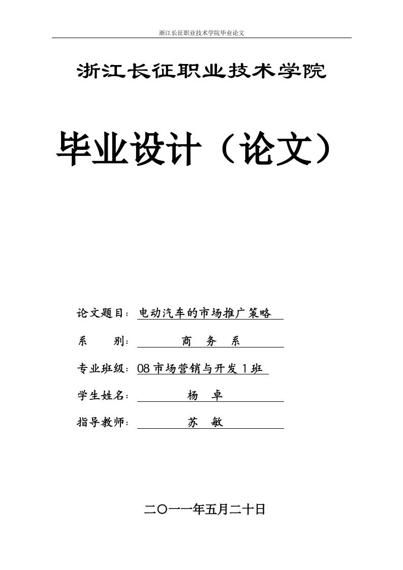 浙江长征职业技术学院毕业论文折江长征职业技术学院毕业设计(论文)论文题目:电动汽车的市场推广策略系商务系专业班级:08市场营销与开发1班学生姓名:杨卓指导教师:苏敏二O一一年五月二十日浙江长征职业技术学院毕业论文目录1引1上海宝钢物流有限公司现状..2货物物流的简单分类....32.1大件货物物流.…32.2危险货物物流.·....33.1对物流运输工具进行合理的选择3.2合理的包装,实行货物的轻重搭配,444554.4合装整车运输54.5中短距离铁路公路分流,“以公代铁”567致谢…i浙江长征职业技术学院毕业论文货物运输方案优化研究一以上海宝钢物流有限公司为例【摘要】货物运输在运输领域是一个重要的范畴,运输方案的选择对于货物的合理化运输具有重要意义。随着我国经济的长足发展、交通运输基础设施建设的完善以及人民生活水平的提高,人们对货物运输需求不断增长。虽然,交通运输基础设施建设水平在不断地提高,但是我国货物运输仍然存在运输能力不足、运输紧张、运输运程较长时造成拖延到货等突出状况。对于企业来说,如果某企业需将大批货物外运,但是却在某些运输方式上能力不足,这就会导致企业被迫维持高库存,甚至产生堵库的现象:对于个人来说,由于网络的发达,越来越多的人们选择网购,购买的物品经常来自四面八方,物流是网络交易的中间商,货物运输的快慢与安全不但影响到买家对卖方货物的直观评价,也直接关系到货运公司自身的信誉。因此,在货物运输时,必须要通过选择一种可行的运输方案或者与多种方案相结合的方式,来共同完成货运任务,节省货运成本。以上海宝钢物流有限公司为例,研究货物运输方案的优化。【关键词】货物运输方案优化基础设施建设上海宝钢物流