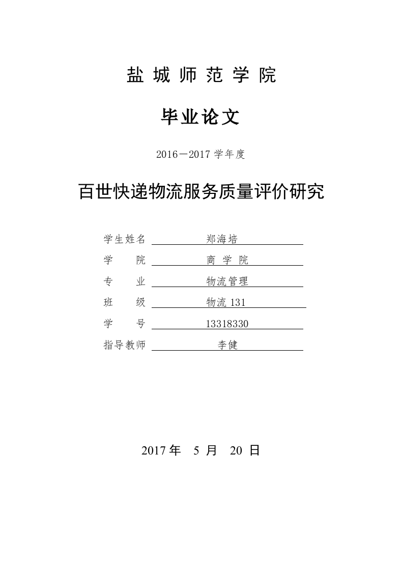 盐城师范学院毕业论文2016-2017学年度百世快递物流服务质量评价研究学生姓名郑海培学院商学院专业物流管理班级物流131学号13318330指导教师李健2017年5月20日盐城师范学院毕业论文百世快递物流服务质量评价研究摘要在互联网高速发展的时代下,随着人们对于生活水平的要求越来越高,对服务的要求也越来越高,其中快递就是服务的一种形式。服务型企业的长久发展必须依靠高质量的服务,快递企业的运作与发展必然离不开自身的服务质量。本文以百世快递为例,旨在通过建立物流服务质量指标体系来分析百世快递的服务质量,以便发现并解决问题,提高客户服务水平,完善信息系统,加强网络的控制。本文具体内容安排如下:首先,本文首先介绍了国内外诸多学者对于物流服务质量的研究,并加以评述。其次,对百世快递的基本情况进行了介绍,根据SERQUAL体系建立顾客满意-百世快递服务服务质量评价体系。最后,采用模糊层次评判法,对百世快递物流服务质量进行评价,根据评价结果找到服务过程中存在的问题并提出改进意见。【关键词】百世快递;物流服务质量:模糊判定盐城师范学院毕业论文Research on Quality Evaluation of Logistics Service in BESExpressAbstractIn the era of rapid development of Internet,with the increasing demand for people'sliving standards,the demand for services is becoming higher and higher,of which expressis a form of service.The long-term development of service enterprises must rely onhigh-quality services.The operation and development of express enterprises areinseparable from their own quality of service.In this paper,BES FedEx as an example,through the establishment of logistics service quality index system to analyze the BESExpress service quality,in order to find and solve problems,improve the level of customerservice,perfect information system,strengthen the network control.The content of thispaper is arranged as follows:First of all,this paper first introduces the domestic and foreign scholars'research andcomments on the logistics service quality.Secondly,the basic situation of BES Express was introduced,according to theSERQUAL to establish the system of customer satisfaction-BES Express serviceservicequality evaluation system.Finally,using the fuzzy evaluation method to evaluate the BES Express logisticsservice quality,according to the evaluation results are found problems in the process andput forward some suggestions for improvement.[Key words]BES Express;Quality of express service:Fuzzy judgment