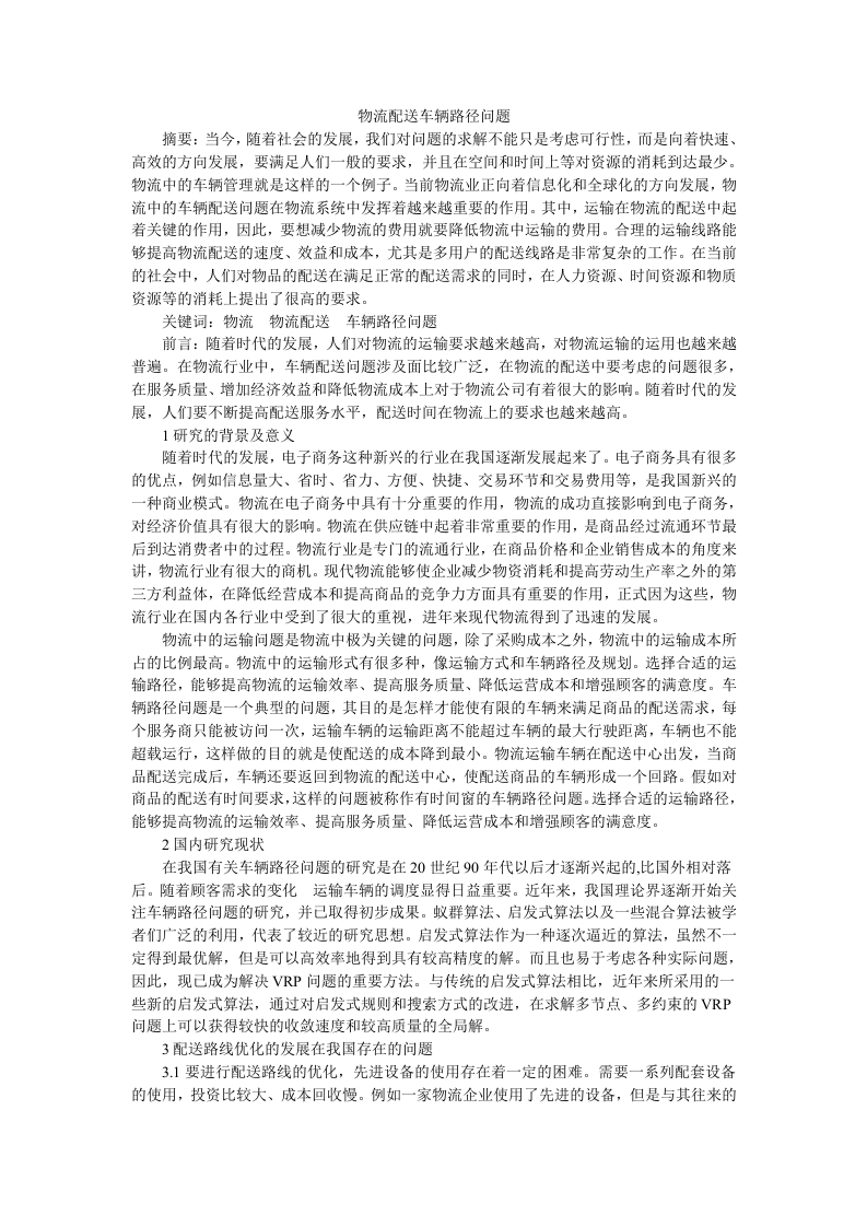 物流配送车辆路径问题摘要:当今,随着社会的发展,我们对问题的求解不能只是考虑可行性,而是向着快速、高效的方向发展,要满足人们一般的要求,并且在空间和时间上等对资源的消耗到达最少。物流中的车辆管理就是这样的一个例子。当前物流业正向着信息化和全球化的方向发展,物流中的车辆配送问题在物流系统中发挥着越来越重要的作用。其中,运输在物流的配送中起着关键的作用,因此,要想减少物流的费用就要降低物流中运输的费用。合理的运输线路能够提高物流配送的速度、效益和成本,尤其是多用户的配送线路是非常复杂的工作。在当前的社会中,人们对物品的配送在满足正常的配送需求的同时,在人力资源、时间资源和物质资源等的消耗上提出了很高的要求。关键词:物流物流配送车辆路径问题前言:随着时代的发展,人们对物流的运输要求越来越高,对物流运输的运用也越来越普遍。在物流行业中,车辆配送问题涉及面比较广泛,在物流的配送中要考虑的问题很多,在服务质量、增加经济效益和降低物流成本上对于物流公司有着很大的影响。随着时代的发展,人们要不断提高配送服务水平,配送时间在物流上的要求也越来越高。1研究的背景及意义随着时代的发展,电子商务这种新兴的行业在我国逐渐发展起来了。电子商务具有很多的优点,例如信息量大、省时、省力、方便、快捷、交易环节和交易费用等,是我国新兴的一种商业模式。物流在电子商务中具有十分重要的作用,物流的成功直接影响到电子商务,对经济价值具有很大的影响。物流在供应链中起着非常重要的作用,是商品经过流通环节最后到达消费者中的过程。物流行业是专门的流通行业,在商品价格和企业销售成本的角度来讲,物流行业有很大的商机。现代物流能够使企业减少物资消耗和提高劳动生产率之外的第三方利益体,在降低经营成本和提高商品的竞争力方面具有重要的作用,正式因为这些,物流行业在国内各行业中受到了很大的重视,进年来现代物流得到了迅速的发展。物流中的运输问题是物流中极为关键的问题,除了采购成本之外,物流中的运输成本所占的比例最高。物流中的运输形式有很多种,像运输方式和车辆路径及规划。选择合适的运输路径,能够提高物流的运输效率、提高服务质量、降低运营成本和增强顾客的满意度。车辆路径问题是一个典型的问题,其目的是怎样才能使有限的车辆来满足商品的配送需求,每个服务商只能被访问一次,运输车辆的运输距离不能超过车辆的最大行驶距离,车辆也不能超载运行,这样做的目的就是使配送的成本降到最小。物流运输车辆在配送中心出发,当商品配送完成后,车辆还要返回到物流的配送中心,使配送商品的车辆形成一个回路。假如对商品的配送有时间要求,这样的问题被称作有时间窗的车辆路径问题。选择合适的运输路径,能够提高物流的运输效率、提高服务质量、降低运营成本和增强顾客的满意度。2国内研究现状在我国有关车辆路径问题的研究是在20世纪90年代以后才逐渐兴起的,比国外相对落后。随着顾客需求的变化运输车辆的调度显得日益重要。近年来,我国理论界逐渐开始关注车辆路径问题的研究,并己取得初步成果。蚁群算法、启发式算法以及一些混合算法被学者们广泛的利用,代表了较近的研究思想。启发式算法作为一种逐次逼近的算法,虽然不一定得到最优解,但是可以高效率地得到具有较高精度的解。而且也易于考虑各种实际问题,因此,现已成为解决VP问题的重要方法。与传统的启发式算法相比,近年来所采用的一些新的启发式算法,通过对启发式规则和搜索方式的改进,在求解多节点、多约束的VRP问题上可以获得较快的收敛速度和较高质量的全局解。3配送路线优化的发展在我国存在的问题3.1要进行配送路线的优化,先进设备的使用存在着一定的困难。需要一系列配套设备的使用,投资比较大、成本回收慢。例如一家物流企业使用了先进的设备,但是与其往来的企业无法提供相应先进的设备和该企业配合,那么设备的利用率以及优势是无法体现出来的,现代化是无法展开的。3.2在中国社会中对于物流行业的偏见,配送路线优化工作的展开有一定的困难。很多人并不了解物流。认为物流只是简单的运输,不愿意进行投资发展,忽略了其中的价值。这造成了物流发展的阻碍。33专业型人才短缺。使得没有专业型人才进行配送路线优化工作。先进的设备以及现代化管理,都需要物流专业型人才的加入,而在中国很多物流企业中,缺少这种物流专业型人才。3.4物流专业型软件没有得到广泛应用,使得配送路线优化存在着困难。第一,很多物流企业只是靠经验来判断路线,并没有真正得到优化,没有使用计算机以及与其配套的专业型软件。软件的使用可以使路线的选择更加优化,也可以减少劳力。第二,对于物流专业型软件以及系统的开发,没有得到重视。在我国,软件在物流中的应用越来越广泛,并且带给企业以及社会很大的经济效益,帮助企业解决了很多困难。物流中的软件正朝着定制化、通用化、行业化的方向前进发展着。4物流配送车辆路线的慨述总体而言,在非单一业务的形式配送物流活动中,商流,物流,资金流紧张密结合,包括商业活动,物流活动产生的现金流量活动流程,可以说,他是活的,包括物流在