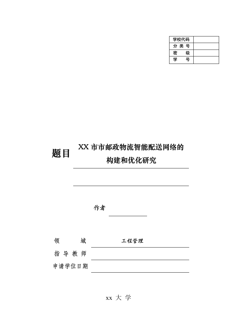 学校代码分类号密级学号XX市市邮政物流智能配送网络的题目构建和优化研究作者领域工程管理指导教师申请学位日期硕士学位论文(专业学位研究生)题目:XX市邮政物流智能配送网络的构建作者:领工业工程管理指导教师:xx大学硕士论文摘要随着经济全球化的进程和电子商务如雨后春笋般的迅猛成长,现代物流的发展方兴未艾。所以针对构建科学合理的现代城市物流配送网络的问题迫在眉睫。另一方面,城市对货车的交通限制和禁止虽在一定程度上缓解了现阶段的交通拥堵压力,但是也增加了城市配送企业的配送成本。因此,不论是从企业经济效益,还是从企业的核心竞争力都需要对原有的配送网络进行完善改造。为了避免资源浪费,促进资源的优化配置,提高XX市邮政速递企业的经济效益,对配送网络的优化构建就非常具有实际意义。该论文针对X市邮政速递物流业务流程和存在的问题进行研究分析。应用轴辐射式的理论,解决目前XX市邮政速递物流配送网络节点构建、流程优化、网络组织以及信息化建设方面的相关问题。得出XX市邮政速递物流配送网络布局规划、流程再造的必要性。论文构建出XX市邮政速递物流配送网络结构,对XX市邮政速递物流配送网络的能力提升,服务质量提升,配送时限提,市场竞争力的提升有着重大意义。同时也增强了X市邮政速递物流企业的核心竞争力和品牌影响力,对今后XX市邮政速递物流企业发展有一定的实用参考价值和现实推广意义。关键词:XX市邮政速递、网络构建、配送能力,优化建议