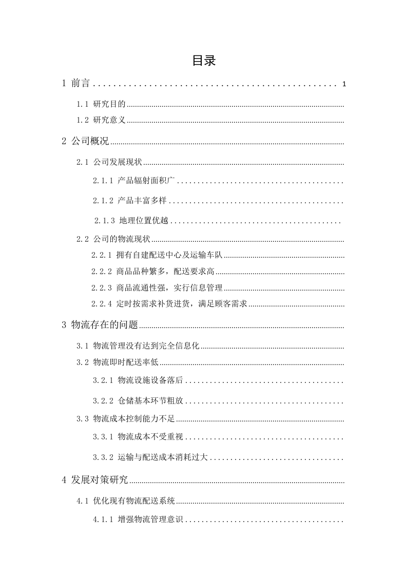 目录..1.1研究目的2公司概况.…2.1公司发展现状2.1.1产品辐射面积广2.1.2产品丰富多样..2.1.3地理位置优越..2.2公司的物流现状…2.2.1拥有自建配送中心及运输车队…2.2.2商品品种繁多,配送要求高…2.2.3商品流通性强,实行信息管理…2.2.4定时按需求补货进货,满足顾客需求3物流存在的问题…3.】物流管理没有达到完全信息化…3.2物流即时配送率低…3.2.1物流设施设备落后..3.2.2仓储基本环节粗放..3.3物流成本控制能力不足.3.3.1物流成本不受重视...3.3.2运输与配送成本消耗过大..4发展对策研究…4.1优化现有物流配送系统4.1.1增强物流管理意识.4.1.2优化现有物流设施设备及维护人员的管理…4.1.3与第三方物流企业合作..4.2进行科学仓库管理与库存管理.…4.2.3实行合理的库存管理...4.3规划企业内部物流成本4.3.1树立全员成本管理意识…4.3.2确立企业目标成本......4.4优化准入门槛与培养企业物流人才…4.4.1组建物流专业人员团队..4.4.2邀请物流专家培训员工.5结语…佛山广泰超市物流现状与对策分析欧绮彤摘要:佛山广泰超市作为在佛山以及周边城市地区具有一定知名度的连锁社区超市,随着经济规模的发展,广泰超市对物流需求越来越多,对物流服务的要求也日渐提高。然而作为一家知名企业,广泰超市的物流管理意识薄弱,物流配送能力也相对有限,具有较大的提升空间。广泰超市如何加强对超市物流管理的认识,熟悉并应用相关物流管理方式及物流管理系统是其当前急需学习了解的一门重要课程。根据广泰超市企业物流当前的情况以及存在的问题,提出了优化现有物流配送系统、强化仓库管理、合理规划企业内部物流成本、优化准入门槛与培养企业物流人才等物流管理措施,进而达到降低货损率,提高广泰超市的配送能力,探寻降低广泰超市物流成本的最佳途径,提高广泰超市经济效益等目的,进而为佛山广泰超市的长远有利发展打下更为坚实的基础。关键词:超市物流:物流管理:对策分析Foshan Guangtai supermarket logisticsstatus and countermeasures analysisBYOuqitongMarch,2020Abstract:Foshan Guangtai supermarket is not only a famous chain supermarket infoshan area,but also famous in the surrounding areas With the development ofeconomic scale,Guangtai supermarket has an increasing demand for logistics and anincreasing demand for logistics services.However,as a well-known enterprise,Guangtai supermarket has a weak sense of logistics management and relatively limitedlogistics and distribution capacity,which has a large room for improvement.Guangtai
