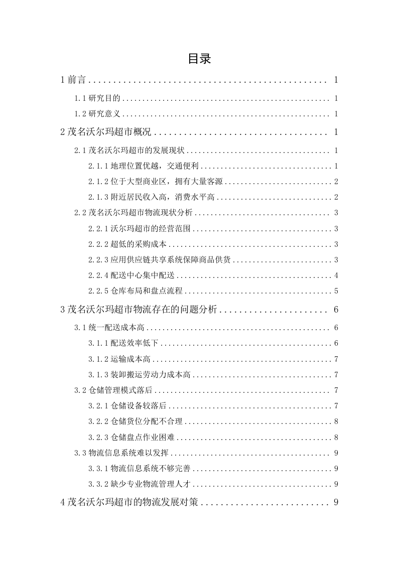 目录1前言.2.1茂名沃尔玛超市的发展现状2.1.1地理位置优越,交通便利....2.1.3附近居民收入高,消费水平高...22.2茂名沃尔玛超市物流现状分析....32.2.2超低的采购成本..32.2.3应用供应链共享系统保障商品供货..32.2.4配送中心集中配送2.2.5仓库布局和盘点流程...3茂名沃尔玛超市物流存在的问题分析.··63.1统一配送成本高....3.1.1配送效率低下.....3.1.2运输成本高....73.1.3装卸搬运劳动力成本高...3.2仓储管理模式落后73.2.1仓储设备较落后...73.2.2仓储货位分配不合理..83.2.3仓储盘点作业困难...3.3物流信息系统难以发挥....93.3.1物流信息系统不够完善..3.3.2缺少专业物流管理人才...…4茂名沃尔玛超市的物流发展对策.…·94.1降低搬运人工、配送成本…94.1.1与优质的第三方物流合作,多点配送..94.2.2运用ABC分类法与先入先出原则,合理分配货位......·11134.3.2引进专业化人才,建立完善的物流人才体系........13茂名沃尔玛超市物流现状与对策分析陈旭明摘要:随着时代的发展与社会的进步,网上购物这个新的消费方式已被人们接受,并逐渐成为当前最流行的消费方式之一。以互联网为媒介,信息硬件技术为支撑的电子商务经济模式逐渐改变着人们的消费意识和消费行为。美国沃尔玛作为世界传统的零售业巨头,目前其地位正受到以亚马逊为代表网络零售商的挑战。若想在当前消费者市场中继续保持零售商龙头地位,其必须创新和发展自身高效的物流模式。因此,茂名沃尔玛超市未来发展方向必将投向于物流。本文详述了茂名沃尔玛超市的物流发展现状,提出了其物流在装卸搬运效率低、仓储成本高、信息化网络管理水平低下等问题,并根据这些问题提出了构建物流运输网络平台,优化仓库管理模式,完善信息化网络系统等物流相关措施,促成茂名沃尔玛超市的长久发展。Maoming Wal-Mart Supermarket LogisticsStatus and CountermeasuresByChen xumingMarch,2020Abstract:With the development of the times and the progress of society,onlineshopping,a new consumption method,has been accepted by people and has graduallybecome one of the most popular consumption methods.The e-commerce economicmodel supported by the Internet and information hardware technology is graduallychanging people's consumption consciousness and consumption behavior.As theworld's traditional retail giant,Wal-Mart is currently being challenged by online