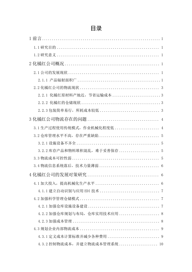 目录1.1研究目的1.2研究意义2化橘红公司概况...2.1.1产品辐射面积广..2.2化橘红公司的物流现状.....32.2.1化橘红原材料产地近,节省运输成本...32.2.2化橘红的仓储现状.....33化橘红公司物流存在的问题.....43.1生产过程使用传统模式,作业机械化程度低…43.2仓库管理水平不高,存在严重缺陷.·553.2.2库存产品和物料堆积混乱,难于妥善保存..·553.4物流信息系统落后,技术力量薄弱.·4化橘红公司的发展对策研究...64.1加大投入,提高机械化生产水平6774.2.1加强仓库设施设备建设.。78894.3.1定义成本计算标准并减少各种费用.…94.4完普物流信息系统…114.4.1引入现代技术,实现物流智能管理.·114.4.2配备E0S技术.......4.43关注物流人员,提高从业人员素质.…1112化橘红药材公司物流现状与发展对策研究李秋洁摘要:化州橘红药材产业作为广东省省级非物质中药文化遗产,也是化州市具有重大特色的产业之一,对推动化州市经济发展起着十分重要的作用,为此探究化橘红药材公司的发展是一项很有实践意义的活动。本文根据目前的市场状况,立足于化橘红公司的物流现状,分析该公司在作业机械化程度低,仓库管理水平不高,物流系统落后等方面存在的问题:针对相关问题提出化橘红公司物流发展的对策,提高机械化操作,整合规划物流系统,加强科学管理仓储模式,进行成本控制等措施。与此同时,有必要提高物流服务水平,确保产品质量和满足客户的最新需求,通过研究,我们可以促进高效物流模式及其降低货损等技术的研究和实践,提高物流效率,减少物流支出,提高企业竞争力,促进化橘红药材公司的长远发展。关键词:化橘红药材:现状:问题:对策研究Logistics status and development strategy ofHuajuhong pharmaceutical companyByLiqiujieMarch,2020Abstract:Huazhou orange medicine industry as a provincial intangible traditionalChinese medicine cultural heritage in Guangdong Province and one of the primarilyindustries in Huazhou City,it plays a decisive role in promoting the development ofeconomy in Huazhou.so,exploring the progress of Huajuhong medicinal materialscompany is a meaningful activity.By the present current market profile andestablished in the logistics status of Huajuhong company,analysis of the text,theexisting problems of the company in the aspects of low degree of operation