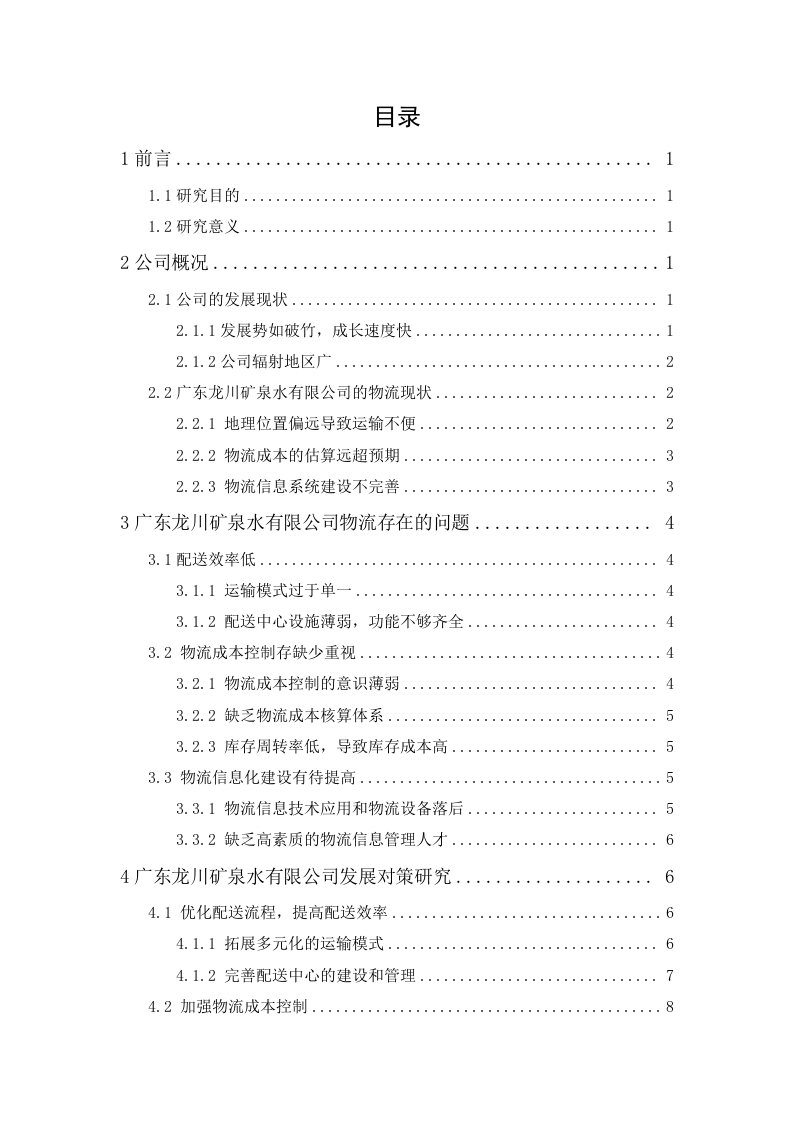 目录1前言.1.1研究目的..2.1.1发展势如破竹,成长速度快...2.1.2公司辐射地区广....2.2广东龙川矿泉水有限公司的物流现状.·22.2.1地理位置偏远导致运输不便....2333广东龙川矿泉水有限公司物流存在的问题.·…·443.1.1运输模式过于单一.......43.1.2配送中心设施薄弱,功能不够齐全..·43.2.2缺乏物流成本核算体系....53.2.3库存周转率低,导致库存成本高.…53.3.1物流信息技术应用和物流设备落后.·54广东龙川矿泉水有限公司发展对策研究…·64.1优化配送流程,提高配送效率....4.1.1拓展多元化的运输模式..64.1.2完善配送中心的建设和管理.·74.2.1提高物流成本控制的意识.…84.2.2建立一套系统的物流成本核算体系.8894.3.2制定人才教育政策,重视和培养专业人才..….9广东龙川矿泉水有限公司物流现状与对策分析谢臆芬摘要:日新月异,人们生活越来越好,对水产品的需求也越来越大,水产品的市场的迅速发展从而带动了矿泉水的生产与发展,霍山矿泉水天然、纯净、健康等特点获得了较大的市场需求。霍山矿泉水作为黎咀镇主要的特色产业,鞭策着黎咀的经济发展,因此探究龙川矿泉水产业的发展是一件极具现实意义的活动。本文立足于广东龙川矿泉水有限公司的物流现状,提出物流存在仓储安排不合理、物流信息化水平低和物流成本高等问题,并以这些问题为入手点展开广泛、深入的探讨与分析,提出改善当前现状的可行措施。通过研究,提出了改善措施,提高公司的物流效率,减少物流成本,提高企业竞争力,促成广东龙川矿泉水有限公司的后期发展。关键词:霍山矿泉水;物流:对策分析Logistics Status and CountermeasuresAnalysis of Guangdong Longchuan MineralWater Co.,Ltd.ByXie yifenMarch,2020Abstract:With each passing day,people's lives are getting better and better,and thedemand for aquatic products is also increasing.And the result of this phenomenondirectly benefits mineral water manufacturing enterprises and gains huge boost from it.Huoshan mineral water's natural,pure,and healthy characteristics have gained To alarger market demand.Huoshan mineral water,as the main characteristic industry of