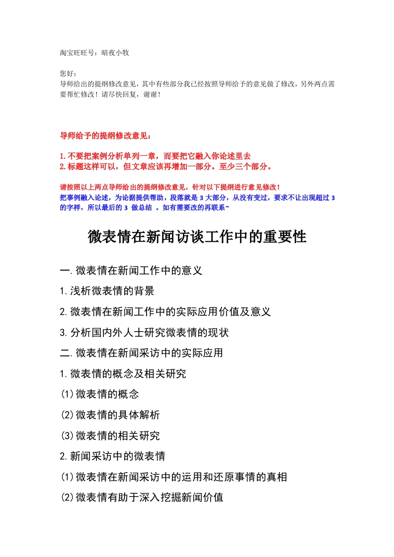 淘宝旺旺号:暗夜小牧您好:导师给出的提纲修改意见,其中有些部分我己经按照导师给予的意见做了修改,另外两点需要帮忙修改!请尽快回复,谢谢!导师给予的提纲修改意见:1.不要把案例分析单列一章,而要把它融入你论述里去2.标题这样可以,但文章应该再增加一部分。至少三个部分。请按照以上两点导师给出的提纲修改意见,针对以下提纲进行意见修政!把事例融入论述,为论据提供帮助,段落就是3大部分,从没有变过,要求不让出现超过3的字样,所以最后的3做总结。如有需要改的再联系~微表情在新闻访谈工作中的重要性一.微表情在新闻工作中的意义1.浅析微表情的背景2.微表情在新闻工作中的实际应用价值及意义3.分析国内外人士研究微表情的现状二.微表情在新闻采访中的实际应用1.微表情的概念及相关研究(1)微表情的概念(2)微表情的具体解析(3)微表情的相关研究2.新闻采访中的微表情(1)微表情在新闻采访中的运用和还原事情的真相(2))微表情有助于深入挖掘新闻价值(3)微表情帮助观察受访人即时状态让采访者掌握采访的主动权3.微表情在新闻工作中的运用对微表情整体发展的帮助三.总结:微表情在新闻采访工作中起到越来越重要的作用