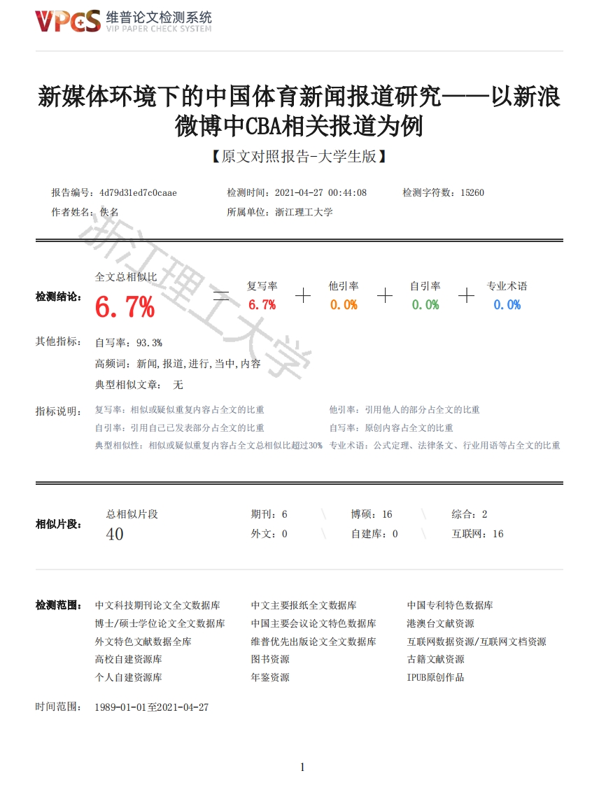 维普论文检测系统VIP PAPER CHECK SYSTEM新媒体环境下的中国体育新闻报道研究一一以新浪微博中CBA相关报道为例【原文对照报告-大学生版】报告编号:4d79d31ed7c0caae检测时间:2021-04-2700:44:08检测字符数:15260作者姓名:佚名所属单位:浙江理工大学全文总相似比复写率他引率自引率专业术语检测结论:6.7%6.7%0.0%0.0%0.0%其他指标:自写率:93.3%高频词:新闻,报道,进行,当中,内容典型相似文章:无指标说明:复写率:相似或疑似重复内容占全文的比重他引率:引用他人的部分占全文的比重自引率:引用自己已发表部分占全文的比重自写率:原创内容占全文的比重典型相似性:相似或疑似重复内容占全文总相似比超过30%专业术语:公式定理、法律条文、行业用语等占全文的比重总相似片段期刊:6博硕:16综合:2相似片段:40外文:0自建库:0互联网:16检测范围:中文科技期刊论文全文数据库中文主要报纸全文数据库中国专利特色数据库博士/硕士学位论文全文数据库中国主要会议论文特色数据库港澳台文献资源外文特色文献数据全库维普优先出版论文全文数据库互联网数据资源/互联网文档资源高校自建资源库图书资源古籍文献资源个人自建资源库年鉴资源IPUB原创作品时间范围:1989-01-01至2021-04-27维普论文检测系统VIP PAPER CHECK SYSTEM原文对照颜色标注说明:■自写片段■复写片段(相似或疑似重复)口引用片段(引用)■专业术语(公式定理、法律条文、行业用语等)新媒体环境下的中国体育新闻报道研究一一以新浪微博中CBA相关报道为例摘要随着新媒体技术的不断发展,体育赛事转播有了新的变化。本文新媒体环境下的中国体育新闻报道研究,新闻报道。,本文对新浪微博中CBA报道,发现内容定位精准度不高,影响范围相对有限,专业视角中商业内容把握等相关问题。为此,本文提出加强新闻报道专业内容,增强内容传播媒介影响力,严格控制内容及商业尺度等优化建议,能够更好的对CBA新闻报道进行优化提升。关键词:专业主义:新闻报道;体育:CBA:优化建议摘要AbstractWith the continuous development of new media technology,new changes have taken place in theprocess of broadcasting sports events.Therefore,this paper studies Chinese sports news reportsunder the new media environment to better understand the problems existing in the process of newsreports.Therefore,this paper takes the CBA report in sina weibo as an example,and based on theconcept theory of journalism professionalism,it finds that the content positioning accuracy is nothigh,the scope of influence is relatively limited,and the grasp of commercial content from theprofessional perspective and other related problems in the research.To this end,this paper putsforward optimization suggestions such as strengthening professional content of news reports,enhancing the influence of content media,and strictly controlling content and commercial scale,which can better optimize and improve CBA news reports.Key words:Professionalism;News reports;Sports;The CBA.Optimization SuggestionsAbstract目录摘要IAbstractII第一章引言1一、研究背景与意义1二、国内外研究现状1(一)新闻专业化主义发展研究1(二)新闻专业化主义操作策略研究2(三)对CBA新闻报道的研究2三、研究方法与内容32维普论文检测系统VIP PAPER CHECK SYSTEM第二章相关概念闸述4一、新闻专业主义概念4二、专业主义特点5三、专业主义作用5第三章央视体育新浪微博对CBA新闻报道现状6一、央视体育新浪微博发展简介6二、新闻报道的及时性7三、图文并茂的新闻报道8四、粉丝点评的及时互动9第四章央视体育新浪微博对CBA新闻报道中存在的问题10一、内容定位精准度不高10二、影响范围相对有限11三、专业视角中商业内容把握11第五章央视体有新浪微博对CBA新闻报道中存在的问题优化建议12一、加强新闻报道专业化内容12二、增强内容传播媒介影响力12◆三、严格控制内容及商业尺度13结论13参考文献14致谢16第一章引言一、研究背景与意义社会的快速发展,信息时代全面来临,对传统的新闻报道形式产生了冲击,以新媒体形式进行新闻报道这对于网络技术、网络数字、无线通信技术、平板电脑、智能手机等多个全新技术设备相连接,更好的为大众提供良好的新闻报道服务。据第4次《中国互联网络发展状况统计报告》显示,截止到2020年3月,我国网民人数规模已经达到9.04亿人,互联网普及率达到64.5%。同时,5G技术的快速提升使得智能化设备来进行网络连接的人数越来越多。据报告显示,我国网民通过网络直播来观看新闻的人数占比达到4.5%,通过传统及时通讯渠道观看网络新闻的人数占比达到4.8%,通过短视频为主的渠道观看新闻的人数占比达11%,通过在线推送看新闻的人数占比达14.8%。这种新闻形式也在全新的网络环境当中得以传播和实践,不断的淘汰和影响传统的新闻内容。因此,在过去的数年当中,国内网络环境发生了翻天覆地的变化,使传统体育新闻报道从纸媒、电视端逐步形成以新媒体的环境来进行报道,结合了微博、Ap、公众号等一系列平台来进行传播,而且还进入到了以“微时代”的门户网络为主的新闻报道,这些新闻报道在报道内容和报道形式上也有了新的变化,因此,如何更好的结合当前的网络环境以及在新闻专业主义的视野下,来对新闻报道进行关注,使体育热点新闻能够更好的结合社会的发展和网民需求来进行传播,使其成为在新闻报道当中重要的影响因素。(1)理论意义目前研究者大多从理论视角出