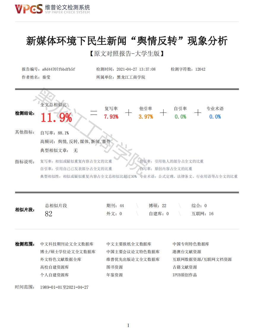维普论文检测系统VIP PAPER CHECK SYSTEM新媒体环境下民生新闻“舆情反转”现象分析【原文对照报告-大学生版】报告编号:a8d44707 fbbdfb5f检测时间:2021-04-2713:37:08检测字符数:12042作者姓名:秦莹所属单位:黑龙江工商学院全文总相似比复写率他引率自引率专业术语检测结论:11.9%7.93%3.97%0.0%0.0%其他指标:自写率:88.1%高频词:舆情,反转,媒体,新闻,事件典型相似文章:无指标说明:复写率:相似或疑似重复内容占全文的比重他引率:引用他人的部分占全文的比重自引率:引用自己已发表部分占全文的比重自写率:原创内容占全文的比重典型相似性:相似或疑似重复内容占全文总相似比超过30%专业术语:公式定理、法律条文、行业用语等占全文的比重总相似片段期刊:44博硕:22综合:0相似片段:82外文:0自建库:0互联网:16检测范围:中文科技期刊论文全文数据库中文主要报纸全文数据库中国专利特色数据库博士/硕士学位论文全文数据库中国主要会议论文特色数据库港澳台文献资源外文特色文献数据全库维普优先出版论文全文数据库互联网数据资源/互联网文档资源高校自建资源库图书资源古籍文献资源个人自建资源库年鉴资源IPUB原创作品时间范围:1989-01-01至2021-04-27维普论文检测系统VIP PAPER CHECK SYSTEM原文对照颜色标注说明:■自写片段■复写片段(相似或疑似重复)引用片段(引用)■专业术语(公式定理、法律条文、行业用语等)黑龙江工商学院本科毕业论文新媒体环境下民生新闻“舆情反转”现象分学生姓名:秦莹学生学号:201761031指导教师:吕育泽所在年级:2017级所在专业:播音与主持艺术所在系别:艺术与传媒系商学院2021年月日摘要近年来,随着网络的发展,网络媒体平台技术的革新,传统信息传播模式发生了改变。新媒体时代的到来,使网络媒体成为了人们又一主要的新闻来源。而热点新闻反转事件却频频发生,伴随而来的公众舆情反转现象也愈演愈烈。因此“后真相”便成为一些不良媒介“博眼球”现象的真实写照,在新闻事件传播过程中传统媒体开始融合新媒体平台传播优势、受众群体地位也从旁观者转变为参与者。即使当初已被媒体机构定论的新闻报道,也会在后续报道中有被完全逆转的可能,这在一定程度上增加了舆情反转的现象发生,更凸显出了媒体舆论引导的重要性。本文将会以新闻类型中最贴近公众的民生新闻为主要研究内容,从起源、发展、现状及传播模式几个方面深入剖析在新媒体背景下民生新闻中大量的舆情反转事件带来的社会影响,为推动良好舆情环境建设作出贡献。关键词:舆情反转:新媒体:民生新闻AbstractIn recent years,with the development of network and the innovation of Network media platformtechnology,the traditional mode of information dissemination has changed.The advent of the newmedia era,the network media has become another major source of news.But the hot news reversalevent frequently occurs,the accompanying public opinion reversal phenomenon also intensifies day byday.Therefore,the "post-truth"has become the true portrayal of the "eye-catching"phenomenon insome undesirable media,in the process of news event communication,the traditional media begins tointegrate the advantages of new media platform,and the status of audience group changes fromspectator to participant.Even if the original media organizations have been determined by the newsreports,there will be a complete reversal in the follow-up reports,which to a certain extentincreased the phenomenon of reversal of public opinion,highlighting the importance of media opinionguidance.This paper will focus on the people's livelihood news which is the most close to thepublic in the news type,from the origin,development,present situation and communication mode,2维普论文检测系统VIP PAPER CHECK SYSTEMthis paper analyzes the social impact of the mass public opinion reversal events in the news ofpeople's livelihood under the background of new media,and makes contributions to the constructionof good public opinion environment.Key words:Reversal of public opinion:New Media;people's Livelihood News目录摘要IAbstractII一、前言1(一)研究的背景、意义及目的1(二)国内外研究文献综述2(三)研究的主要内容2二、新媒体环境下民生新闻“舆情反转”概述4(二)“舆情反转”特点4三、新媒体环境下民生新闻“舆情反转”发展过程及现状6(一)“奥情反转”起源6(二)“舆情反转”发展6(三)“舆情反转”现状7四、新媒体环境下民生新闻“舆情反转”传播模式9(一)“舆情反转”传播要素9(二)“舆情反转”传播过程9(三)“舆情反转”传播平台10五、新媒体环境下民生新闻“舆情反转”影响与改进意见12(一)“奥情反转”现象的社会影响12(二)针对“舆情反转”现象的改进意见12六、结论14参考文献15一、前言(一)研究的背景、意义及目的1、研究背景本文主要研究的对象是新媒体背景下民生新闻的奥情反转现象,随着新媒体时代的到来,传统媒体话语权垄断地位日渐削弱,普通公众通过网络获得了部分话语权。而对于这些公共事件的观点所产生的舆论,在一定程度上也影响了整件事情的奥情走向,甚至影响到公共事件的本身。在整理相关文献时发现,“舆情反转”现象的研究是从2010年开始的,随之出现了“舆情反转”的相关词条。而在接下来的三年时间里,“奥情反转”的相关研究出现了断层,直到2014年研究才再次回温。近两年来,奥情反转现象层出不穷,2018年“重庆公交车坠江案”,媒体为追求新闻的时效性没有进行深入调查,便