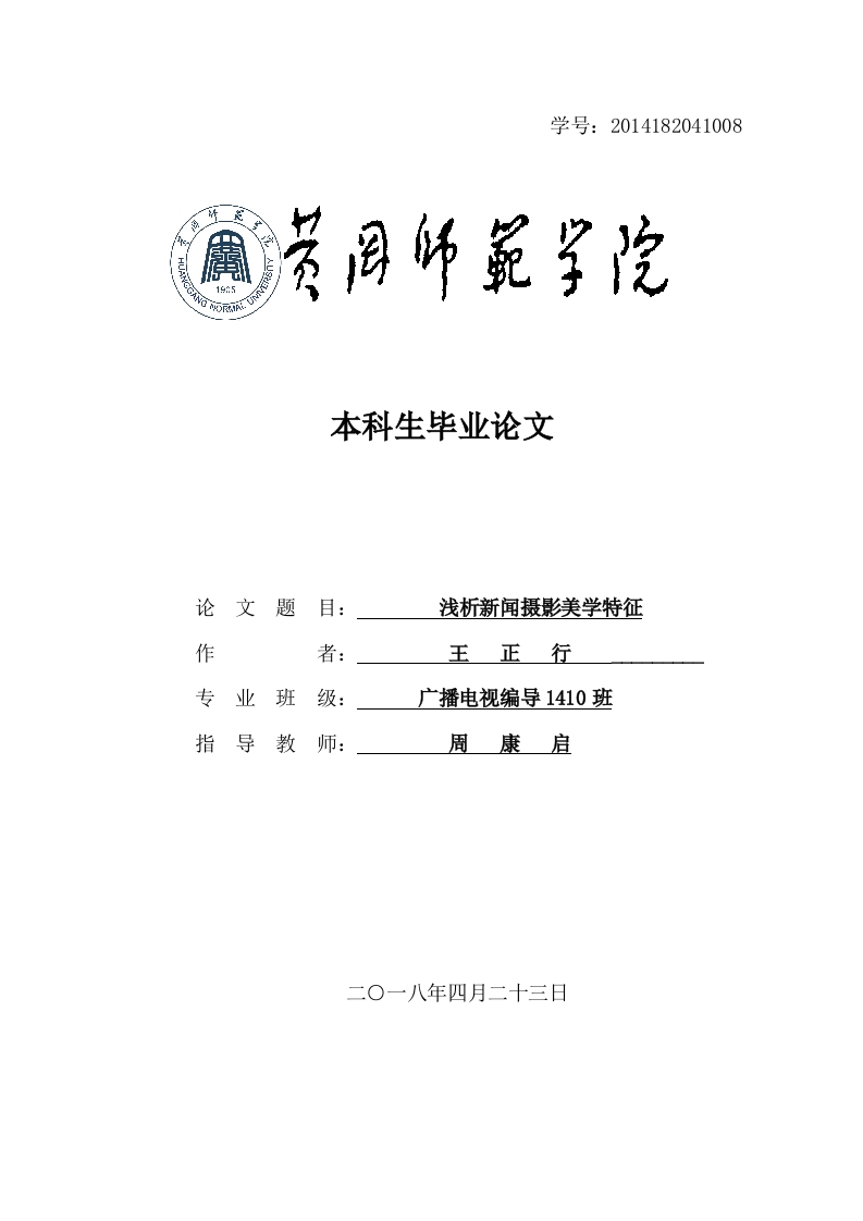 学号:2014182041008本科生毕业论文论文题目:浅析新闻摄影美学特征作者:王正行专业班级:广播电视编导1410班指导教师:周康启二O一八年四月二十三日目录题目、中英文摘要、关键词及作者简介23一、新闻摄影与纪实摄影的区别..(一)什么叫新闻摄影(一)综合来分析,新闻摄影至少具有以下几种社会功能..778(一)时效性是新闻摄影的首要特征(三)现场性也是一个明显的特征(四)新闻摄影的第四个美学特征是艺术性.…13四、新时代的摄影人如何把握新闻摄影的美学特征之我见...·1415151617浅析新闻摄影美学特征作者:王正行指导老师:周康启〔摘要)新闻报道的形式是多种多样的,其中就包括摄影。就新闻摄影而言,它具有某些特性,包括新闻和纪实特性。本文从新闻的视角浅析摄影的美学特征。寻求新闻摄影中的纪实性、美学特征的联系。在新时代的新闻摄影人应该在纪实的基础上追求摄影美学的表现力,力求在真实的情感的基础上用美的情调打动人心【关键词】新闻摄影纪实美学价值【作者简介】王正行(1996一),男,江西萍乡人,黄冈师范学院广播电视编导专业1410班,主要研究新闻摄影。A brief analysis of the aesthetic features of news photographyAuthor:Wang Zheng xingTeacher:Zhou Kang Qi[Abstract INews photography,as a form of news reports,has both the characteristicsof news and documentary photography.This article analyzes the aesthetic characteristicsof photography from the perspective of news.Seeking the relevance of documentary andaesthetic features in news photography.In the new era,the news photographers shouldpursue the expressive force of photography aesthetics on the basis of the documentaryreality,and strive to move the hearts of the people on the basis of the true emotion.[Key words]News photography Documentary Aesthetics value[Author Information]WangZhengxing (1996-),male,from Jiang Xi Pingxiang,inclass 1410 of broadcast television director major,school of Huanggang NormalUniversity,Main research on News photography.第2页共15页