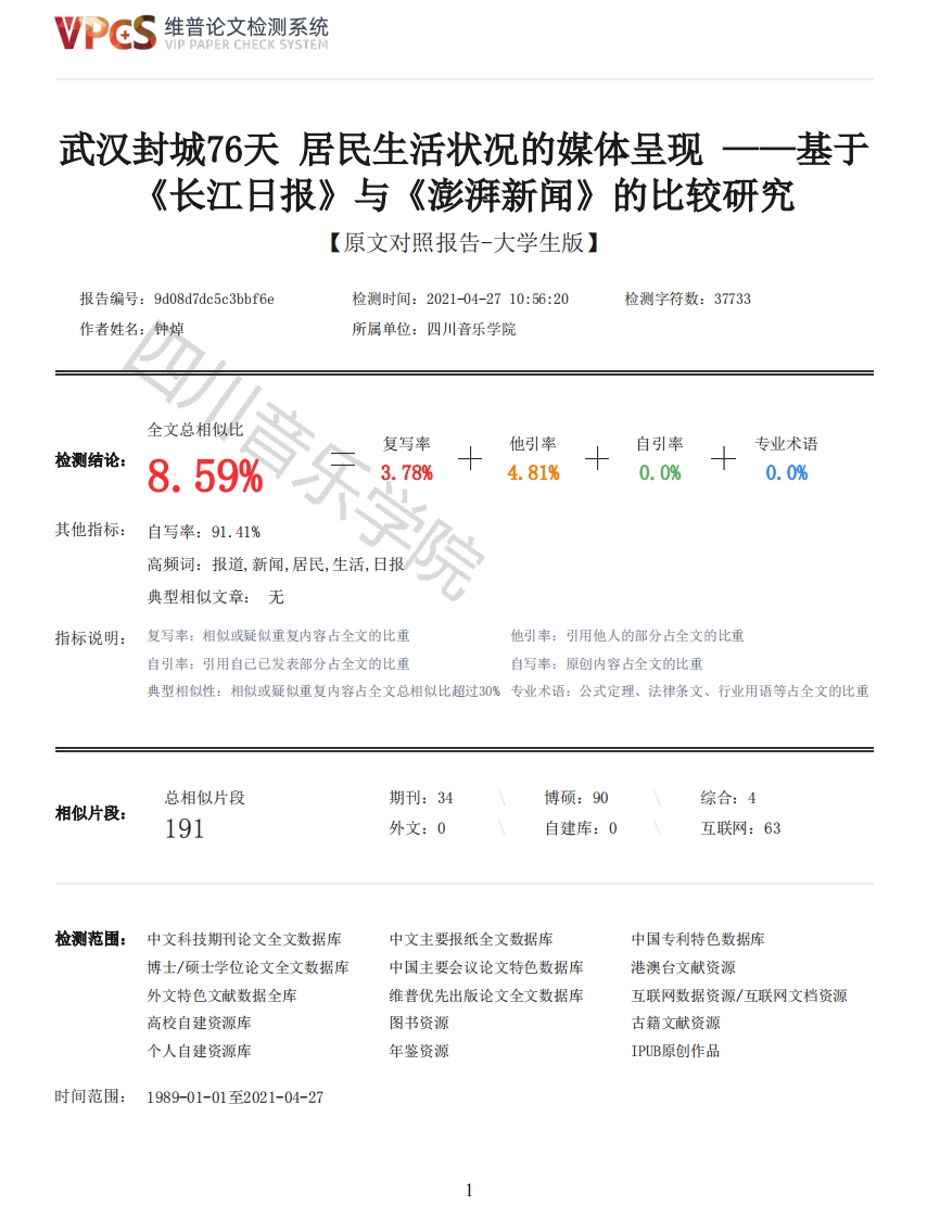 维普论文检测系统VIP PAPER CHECK SYSTEM武汉封城76天居民生活状况的媒体呈现一一基于《长江日报》与《澎湃新闻》的比较研究【原文对照报告-大学生版】报告编号:9d08d7dc5c3bbf6e检测时间:2021-04-2710:56:20检测字符数:37733作者姓名:钟焯所属单位:四川音乐学院全文总相似比他引率自引率专业术语检测结论:8.59%其他指标:自写率:91.41%复写率3.78%4.81%0.0%0.0%高频词:报道,新闻,居民,生活,日报典型相似文章:无指标说明:复写率:相似或疑似重复内容占全文的比重他引率:引用他人的部分占全文的比重自引率:引用自己已发表部分占全文的比重自写率:原创内容占全文的比重典型相似性:相似或疑似重复内容占全文总相似比超过30%专业术语:公式定理、法律条文、行业用语等占全文的比重总相似片段期刊:34博硕:90综合:4相似片段:191外文:0自建库:0互联网:63检测范围:中文科技期刊论文全文数据库中文主要报纸全文数据库中国专利特色数据库博士/硕士学位论文全文数据库中国主要会议论文特色数据库港澳台文献资源外文特色文献数据全库维普优先出版论文全文数据库互联网数据资源/互联网文档资源高校自建资源库图书资源古籍文献资源个人自建资源库年鉴资源IPUB原创作品时间范围:1989-01-01至2021-04-27维普论文检测系统VIP PAPER CHECK SYSTEM原文对照颜色标注说明:■自写片段■复写片段(相似或疑似重复)口引用片段(引用)■专业术语(公式定理、法律条文、行业用语等)学号2017300710031密级武汉大学本科毕业论文武汉封城76天居民生活状况的媒体呈现音乐学院一一基于《长江日报》与《澎湃新闻》的比较研究院(系)名称:新闻与传播学院专业名称:新闻学学生姓名:钟焯指导教师:夏琼教授二O二一年四月郑重声明本人呈交的学位论文,是在导师的指导下,独立进行研究工作所取得的成果,所有数据、图片资料真实可靠。尽我所知,除文中已经注明引用的内容外,本学位论文的研究成果不包含他人享有著作权的内容。对本论文所涉及的研究工作做出贡献的其他个人和集体,均已在文中以明确的方式标明。本学位论文的知识产权归属于培养单位。本人签名:日期:摘要2020年1月23日至4月8日,武汉市受新冠肺炎疫情影响,经历了长达76天的“封城”状态。除关闭离汉通道外,政府还先后实行了公交停运、中心城区车辆禁行、住宅小区封闭等管控措施。毋庸置疑,疫情和管控措施影响着包括医疗、消费、出行、心理在内的居民生活各个方面。本研究以武汉本地党报《长江日报》和市场化媒体《澎湃新闻》两家媒体微信公众号为研究对象,试图回答两者对武汉“封城”期间居民生活状况的呈现框架是什么,有何差异,并分析差异产生的原因,进一步提出优化方向。研究采用内容分析和对比分析方法,对两者报道数量、消息来源、报道主题、报道体裁、配图数量等5个方面进行了深入分析和比较。研究发现,两家媒体通过个体情感的显性表达、话语权的选择性赋予以及模糊化传统的真实准则,建构起各自的主导框架,即《长江日报》为主流意识形态主导下的英雄主义和动员稳定框架,《澎湃新闻》则是市场逻辑驱动下的个体抗争和呈现百态的报道框架,两者各自偏好呈现的,有重叠也有互补,甚至有冲突,一定程度上为公众再现了一个较为全面的“封城”期间武汉居民生活的图景。研究认为,媒体属性和受众群体差异是导致两者框架差异的主要方面,并根据公共危机事件中媒体的功能和职责提出框架优化建议:尊重真实原则,警惕越线煽情:强化居民主体地位,平衡利益诉求表达;积极正面为主,讲究报道时机。关键词:武汉封城:居民:生活状况:媒介呈现:长江日报;澎湃新闻2维普论文检测系统VIP PAPER CHECK SYSTEMABSTRACTJanuary 23 to April 8,2020,Wuhan,the city most severely affected by COVID-19,experienced a76-day "city closure".During the period of "lockdown",in addition to closing the exit from Wuhan,the government has also implemented the bus stop,the central city vehicles banned,residentialquarters closed 24 hours management and other control measures.There is no doubt that the epidemicand its control measures affected every aspect of people's lives,including medical treatment,consumption,transportation and psychological well-being.This study takes the relevant reports of WeChat public accounts of Wuhan's party newspaperChangjiang Daily and market-oriented media The Paper as the research object,trying to answer whatare their frames of presenting the living conditions of the residents of Wuhan during the period of"lockdown"and what is the difference between them,and analyzes the reasons for the difference,andfurther puts forward the direction of optimization.The research adopts content analysis and comparative analysis methods,and makes an in-depthanalysis and comparison on the number of reports,sources of news,topics of reports,genres ofreports and the number of pictures.It is found that the two media have constructed their respectiveleading frames through the explicit expression of individual emotions,selective endowment ofdiscourse power and the blurring of traditional real norms.That is to say,the reporting ofChangjiang Daily adopts the frame of heroism and mobilization stability under the dominance ofmainstream ideology.The Paper,on the other hand,is a reporting frame of individual protests andvarious situations driven by market logic.The two have their own preferences,some overlap,somecomplement,and even conflict.To a certain extent,it reappears to the public a relativelycomprehensive picture of Wuhan reside
