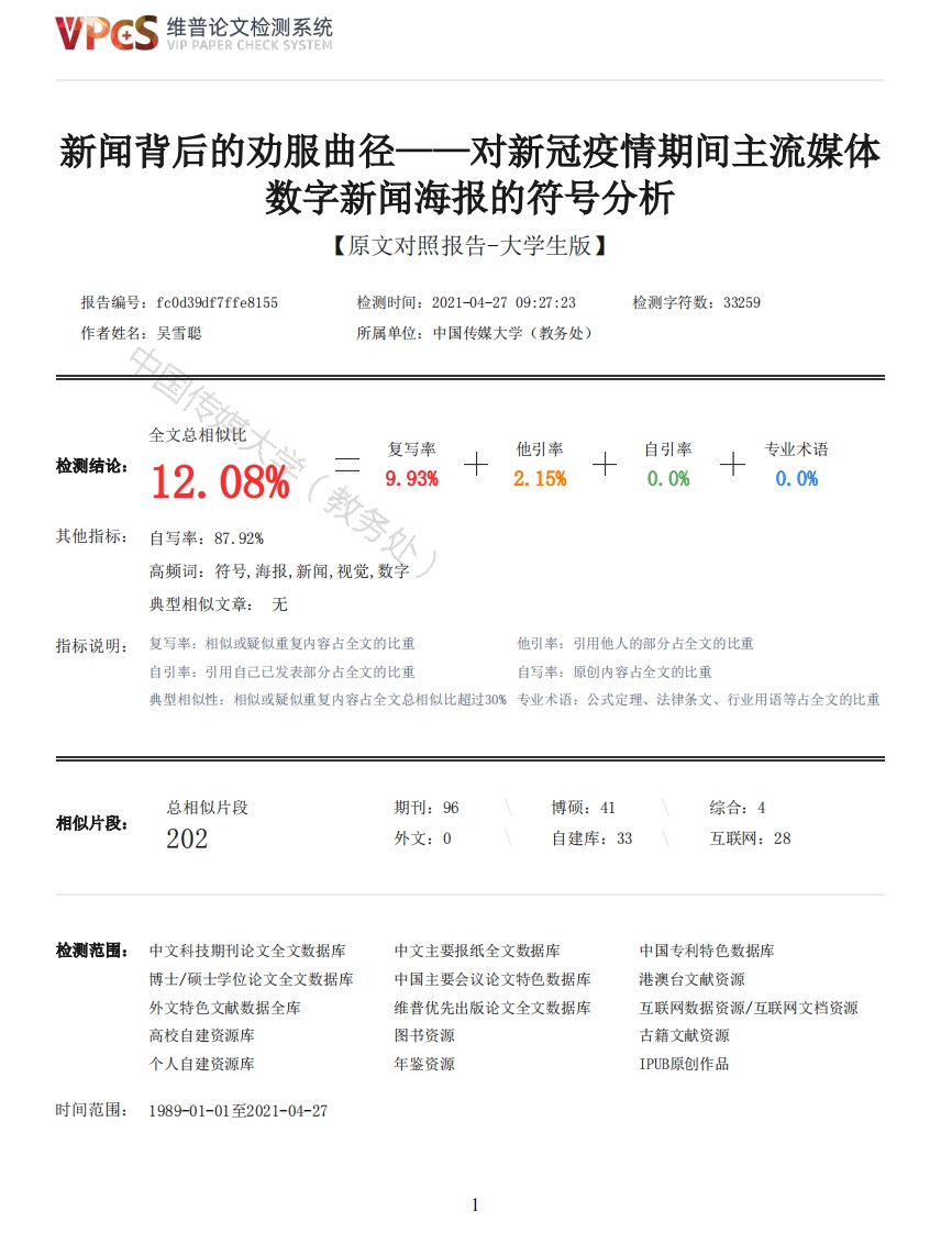 维普论文检测系统/IP PAPER CHECK SYSTEM新闻背后的劝服曲径一一对新冠疫情期间主流媒体数字新闻海报的符号分析【原文对照报告-大学生版】报告编号:fc0d39df7ffe8155检测时间:2021-04-2709:27:23检测字符数:33259作者姓名:吴雪聪所属单位:中国传媒大学(教务处)全文总相似比复写率他引率自引率专业术语检测结论:12.08%9.93%2.15%0.0%0.0%其他指标:自写率:87.92%教务高频词:符号,海报,新闻,视觉,数字典型相似文章:无指标说明:复写率:相似或疑似重复内容占全文的比重他引率:引用他人的部分占全文的比重自引率:引用自己已发表部分占全文的比重自写率:原创内容占全文的比重典型相似性:相似或疑似重复内容占全文总相似比超过30%专业术语:公式定理、法律条文、行业用语等占全文的比重总相似片段期刊:96博硕:41综合:4相似片段:202外文:0自建库:33互联网:28检测范围:中文科技期刊论文全文数据库中文主要报纸全文数据库中国专利特色数据库博士/硕士学位论文全文数据库中国主要会议论文特色数据库港澳台文献资源外文特色文献数据全库维普优先出版论文全文数据库互联网数据资源/互联网文档资源高校自建资源库图书资源古籍文献资源个人自建资源库年鉴资源IPUB原创作品时间范围:1989-01-01至2021-04-27维普论文检测系统VIP PAPER CHECK SYSTEM原文对照颜色标注说明:■自写片段■复写片段(相似或疑似重复)引用片段(引用)■专业术语(公式定理、法律条文、行业用语等)保密类别编号毕业论文新闻背后的劝服曲径教一一对新冠疫情期间主流媒体数字新闻海报的符号分析学电视学院专业.广播电视学班2017级广播电视学姓吴雪聪指导教师.杨凤娇崔林涂凌波中国传媒大学2021年4月27日摘要在此次新冠疫情期间,海报这一传统的视觉形式借助新媒体的东风重新流行,孵化出不少爆款新闻产品。表面上看,数字新闻海报只是对新闻现场的像似表征和客观呈现,但对@人民日报、@央视新闻两家央级主流媒体的内容分析发现,在新闻的表象下,数字新闻海报的内里仍有一条由符号搭建的、通往意义幽处的劝服曲径:在聚合结构中,编码者利用“缺席”与“在场”的辩证法,通过对人、物、景三类符码的选择性表征,在含蓄意指层面塑造出“积极的抗疫者”、“情感化的抗疫物象”、“阵地般的抗疫空间”这三幅符号图景:在组合结构中,编码者又借助了含指项的意义移植机制,以及部分指代整体的转喻机制,使镶嵌在海报中的劝服意图得以自然化和普遍化。视觉符号以一种合法的方式悄无声息地将劝服性话语可视化,这体现出在当下的“视觉政治”时代,中国宣传模式的某种结构性转型。关键词:数字新闻海报符号分析视觉劝服AbstractDue to the widespread of new media,poster,a traditional visual formart,has again caught onduring the COVID-19 pandemic.Seemingly the digital news poster is only the iconic representationand objective record of news scene,but the content analysis towards the posters on @The People'sDaily and @CCTV news still reveals that beneath the surface there exists a winding path ofpersuation consisting of visual symbols.On the axis of paradigm,through selective display ofcharacters,things and space,the coders sucessfully shapes three types of symbolic pictures,including active fighters,sensational items,and sacred space all featuring anti-epidemic;On the2维普论文检测系统VIP PAPER CHECK SYSTEMaxis of syntagm,the mechanism of Connotateurs and Metonymy are also used in order to naturalize anduniversalize the coders5 meaning.By the magic of visual symbols,persuasive discourse arevisisualized and beomes valid,which reflects the structural transformation of China's propagandamode in the era of visual politics.[Key words]digital news poster:symbolic analysis;visual persuation中文摘要I外文摘要II1.绪论1(一)研究背景与研究意义1(二)研究对象与研究问题2(三)文献综述4(四)研究设计与研究方法92.新冠疫情期间数字新闻海报的符号要素与结构10(一)数字新闻海报的符号要素10(二)数字新闻海报的组合结构11(三)数字新闻海报的聚合结构113.聚合分析:数字新闻海报中的“在场”与“缺席”12(一)人物符号:积极的“抗疫者”13(二)物象符号:感性的“抗疫意象”19(三)景象符号:神圣的“抗疫阵地”224.组合分析:数字新闻海报的意义自然化与普遍化25(一)图像内组合结构:含指项的意义移植机制25(二)组图间组合结构:部分指代整体的转喻机制28结语30参考文献33附录36后记37绪论(1)研究背景与研究意义在此次新冠疫情期间,有一种传统的视觉宣传形式,借新媒体的东风再次大放异彩,孵化出不少爆款产品,它就是“数字新闻海报”一一人民日报的“一线医护战疫日记”系列、央视新闻的“谢谢你为湖北拼过命”系列,微博点赞数均破十万,取得了相当可观的传播效果。新华社、光明网、浙江日报社等业界媒体也纷纷将数字新闻海报作为其疫情期间融媒创新的重要功绩,加以梳理和盘点。2月24日北外不获全胜决不轻言成功3