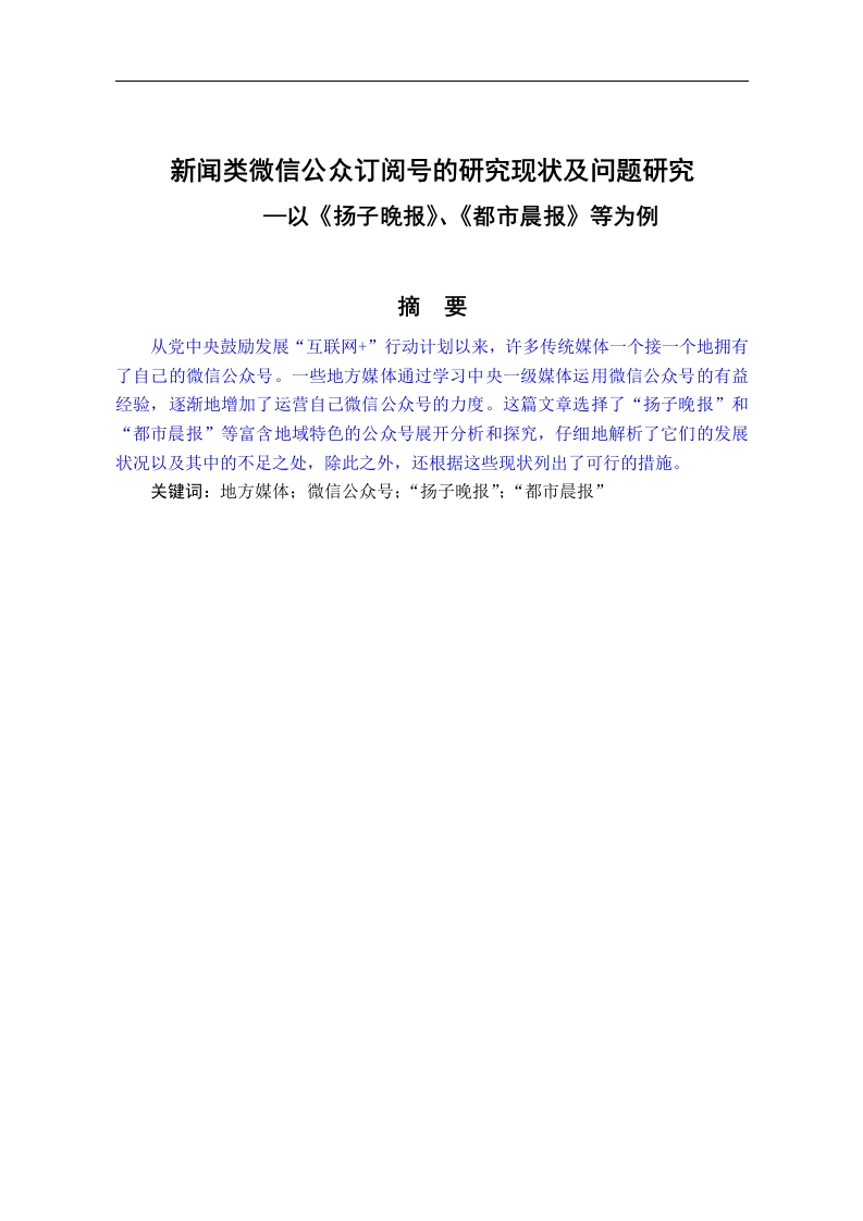 新闻类微信公众订阅号的研究现状及问题研究一以《扬子晚报》、《都市晨报》等为例摘要从党中央鼓励发展“互联网+”行动计划以来,许多传统媒体一个接一个地拥有了自己的微信公众号。一些地方媒体通过学习中央一级媒体运用微信公众号的有益经验,逐渐地增加了运营自己微信公众号的力度。这篇文章选择了“扬子晚报”和“都市晨报”等富含地域特色的公众号展开分析和探究,仔细地解析了它们的发展状况以及其中的不足之处,除此之外,还根据这些现状列出了可行的措施。关键词:地方媒体:微信公众号:“扬子晚报”;“都市晨报”引言腾讯公司最近推广了一款和QQ相似,但是具有更多功能的社交软件--微信。因为腾讯公司的产品腾讯QQ本来就有很多用户,所以微信刚推出就有较多的受众。在这个互联网飞速发展的时代,使用微信的群体越来越广泛,许多传统媒体把营销的目标锁定在了微信这个软件上。像“人民日报”和“央视新闻”这种中央一级媒体,较早入驻微信,并且获得不小的成就。接着,地方媒体也入驻微信,利用微信公众号向群众不断推送新闻,成为又一主力军。一媒体对微信公众订阅号的应用(一)微信公众号的现状当下,微信公众订阅号呈现出井喷式的发展趋势。根据微信官方数据,截止2014年7月,微信公众平台注册总量达580万,且每日新增1.5万个①。形形色色的微信公众号占据了微信平台的半壁江山。但根据微信第三方服务商“全微科技”的估测,在目前的几百万公众账号中只有不到20%的账号拥有一万以上的粉丝。由此可见,虽然微信公众号的总量巨大,然而实际情况是各个公众平台的单独的影响作用是一定的。换个说法吧,那些出色的公众平台拥有着了绝大多数的受众的关注。如今的微信公众号数量巨大,其中的传统媒体所注册的微信公众号具有强大生命力迅速发展,既充分发挥了他们自带的深厚底蕴的作用,又利用微信的传播形式,为受众带去了不一样的阅读感受(二)一级微信订阅号现状分析通常,一级媒体的微信公众号的走向会引导地方媒体的微信公众号的走向。在众多的中央一级媒体的微信公众号中,“人民日报”和“央视新闻”最具代表性。仔细研究这些微信公众号的经营,对地方的媒体微信公众号的经营具有较大的导向作用。人民日报的微信平台每日都会在6个既定的时间段内不间断地推送微信,而推送微信的数目不等。内容主要包括早上五点半左右的“新闻早班车”以及一系列的时政要闻、生活常识、美文荐读等。此外,偶尔会在例行的推送之外推送突发新闻,①黄锴:《微信公众号总数已超过580万或将公开阅读数和点赞书》,21世纪经济报道,2014年07月25日。例如“北京颐和酒店女子被袭案”和“魏则西事件”等。因为人民日报以及央视新闻的微信公众号都在较早使用的公众平台的行列,所以它们每日推荐的文章次数和数量都大,文章不但具有丰富内涵还具保持了自身特点,它们的公众平台塑造得较为成功。(三)地方媒体微信订阅号现状分析级媒体的微信订阅号完全取得胜利,使公众号经营者受到了不小的影响,许多地方媒体主动学习模仿,逐发展了专属自己的具有权威的官方微信订阅号。这些微信订阅号多数是用于推送国内和当地的重要时事政策以及其他和民众生活紧密联系的各种事情,这些主要指交通和医疗以及生活保健等等:除此之外,还有一部分微信公众订阅号负责推送当年的公务员以和其他事业单位的考试时间和其他相关资讯,帮助考生及时了解关于考试的资讯。《扬子晚报》属于江苏省内拥有强大的号召力的煤体之一,是国内众多地方性报刊中较为出色的媒体,在本行业中具有相当高的地位,对受众有很大的影响作用,同时具有极大的普及范围。除此之外,它还是江苏省先一步建立微信公众号的少数地方媒体的其中一个。扬子晚报的微信公众号的名字是“扬子晚报”,它的微信号是“yzwb20102806”。《都市晨报》即是徐州的地方媒体建立的微信公众号的极具代表性的公众号,尤其富含当地特色。都市晨报的微信公众号名字是“都市晨报”,它的微信号是“dschenbao”。“扬子晚报”以及“都市晨报”都是省级煤体以及市级媒体的微信公众号的代表性角色,这篇文章仔细地探讨和研究了它们的特点,以此来达到完全预测地方媒体的微信公众号的发展前景和和发展最适模式目的。1.“扬子晚报”的发展现状分析“扬子晚报”拥有独特的推送模式,它有机结合了微信语音和视频以及图文的功能优势,运用了信息推送+导航的推送模式。信息推送指的是“扬子晚报”以新闻精选作为基础,在早中晚三个每个时间段分别推送三到六条图文资讯。资讯内容饱满,大部分是时政要闻和社会新闻以及一些生活常识和时尚娱乐等资讯。导航推送即“扬子晚报”为了提高用户体验水平而研发的公众号的底部菜单功能。这个公众号特地设置了“微电台”和“微视台”还有“扬互动”这几个功能部分:“微电台”功能包含“丹丹说天气”和“蓓蓓讲故事”还有“婷婷韶韶南京话”以及“军事观察”这4个子栏目,每个都是由一个声音悦耳动听的女主播为受众播报天气、讲童话故事和说南京话等、或者是由资深军事观察员叙述关于军事的故事。这4个子栏目充分满足了各个年龄阶段、男女受众的各种需要,而且,语音推送所产生的近
