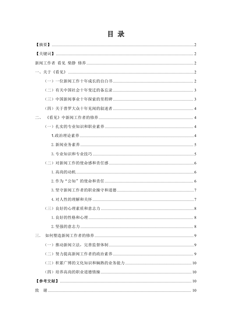 目录【摘要】【关键词】2新闻工作者看见柴静修养….2一、关于《看见》(一)一位新闻工作十年成长的自白书…(二)有关中国社会十年变迁的备忘录…3(三)中国新闻事业十年探索的里程碑3(四)关于普罗大众十年见闻的叙述者4二、《看见》中新闻工作者的修养(一)扎实的专业知识和职业素养1.政治理论素养…42.新闻业务素养…..3.专业知识和专业技巧…((二)对新闻工作的使命感和责任感.1.高尚的动机….62.作为“公知”的使命和责任3.坚守新闻工作者的职业操守和道德................................74.对人性的理解和关怀…(三)良好的心理素质和意志力1.良好的性格和心理82.坚强的意志力.…8三.如何塑造新闻工作者的修养…(一)推动新闻立法,完善监督体制9(二)努力提高新闻工作者的政治素养9(三)积累广博的文化知识和娴熟的业务能力.10(四)培养高尚的职业道德情操.…10【参考文献】10致谢…由柴静《看见》谈谈新闻工作者的修养【摘要】《看见》作为近两年来热销的读物,它不仅是作为一名新闻工作者柴静的自传性作品,更成为了当代新闻工作者加强自身修养的范本。在这个信息爆炸的时代里,新闻工作者为一己之私放弃新闻真实和职业道德的实例比比皆是。而柴静却身体力行着对新闻道德的坚守,对人文情怀的呵护。这十年的记录中,《看见》留下了她深刻的生命印记,也展示了新闻工作者的责任。本课题从柴静的《看见》出发,浅析《看见》在中国新闻界的影响,阐述一名新闻工作者的所需的素养和品质,以及在新形势下如何塑造和加强新闻工作者的修养。【关键词】新闻工作者看见柴静修养一、关于《看见》即使身处这样一个“全民记者”的年代,即使公共话语权被扩大到前无古人的状态,即使信息爆炸到无以复加的地步,我们仍然身受复杂表象的阻碍,难以抵达事件背后的真相。正如前人所说“新闻永远无法还原真实,即便它无限接近于真实”。《看见》便是一个无限抵达真相的过程的记录。它所承载的意义早已超越了一位新闻工作者的心得自传,更多的记录了时代的变迁,中国新闻事业的发展和新闻工作者的责任和情感。(一)一位新闻工作十年成长的自白书这位从《夜色温柔》中起步的新闻工作者,从加入央视,便坚守在新闻调查的第一线。从《东方时空》、《新闻调查》、《面对面》、《24小时》,以淡定的神情,柔和的声音为公众塑造了一种融入生活,贴近大众但又矜持专业的姿态。从对新闻一无所知,经过不断尝试、打击和坚持,在《看见》里,柴静终于能如此平和踏实的将自己所看见的世界娓娓道来。用柴静引用同事王开岭的话来说:“做新闻,就是和这个时代的疾病打交道,我们都是时代的患者,采访在很大程度是病友之间的相互探问。”所以在《看见》里,有太多相互的探问和个人的独白。在经历十年的风雨和历练之后,她褪去灰心和急躁,对生活与人性有了更为宽广与深厚的理解。她尽可能诚实地写下这不断犯错、不断推翻、不断疑问、不断重建的事实和因果的历程。用十年的时间学会了如何报道一个国家,如何报道自己。她的十年成长,伴随着时代的变迁和发展,被我们看见。(二)有关中国社会十年变迁的备忘录柴静曾这样说道,“《看见》中,我没有刻意选择标志性事件,也没有描绘历史的雄心,在大量的新闻报道里,我只选择了留给我强烈生命印象的人,因为工作原因,我恰好与这些人相遇。”一直以来,柴静的形象定位都是知性柔和,充满情感的。她用十年的时间摆脱了新闻工作者刻板官方的普遍印象。但毋庸置疑的是,抗击非典,汶川地震,北京奥运,双城服毒事件,药家鑫案…一系列在中国社会打下深刻烙印的事件中都有柴静不断看见,抵达真相的身影。这些能留下强烈生命印象的人和事,往往最生动的记录了中国社会的变迁。她给了我们一个机会,从一个新闻工作者的视角,去了解那些曾经发生的与我们息息相关的大事,让我们更深刻的读懂中国,看懂社会。(三)中国新闻事业十年探索的里程碑作为一个封建社会延续两千多年的历史大国,中国的新闻事业始终承受着众多的束缚和禁锢。随着新世纪的到来,即使步履维艰,中国的新闻事业仍然迎来了前所未有的发展时机。前总理朱镕基曾为央视的《焦点访谈》题词一一舆论监督,群众喉舌,政府镜鉴,改革尖兵。这正是中国大众对媒体,对新闻工作者的期待和要求。在柴静的《看见》中,没有宏伟的宣誓和承诺,但实实在在的记录了奋斗在新闻一线媒体人的情感和良知。即使公众对当代新闻工作者颇有微词,但媒体的公信力仍然没有被磨灭。柴静便是用实实在在的动人细节展示了新闻工作者对真相的探寻,展示了十年来中国新闻事业在跌跌撞撞中未曾停滞的进步和发展。“新旧之间没有怨讼唯有真与伪是大敌”,新闻求真,以此为碑。(四)关于普罗大众十年见闻的叙述者《看见》被看作柴静记录下淹没在宏大叙事中的动人细节,为时代留下私人的注脚。这些给她留下了强烈生命印象的人和事,都是关于这片土地的历史和故事。在这个联系越发紧密的世界里,没有人是旁观者,能轻易的独善其身。柴静带领我们看到了一个个实际实在的人,而在他们身上,也同样能看见我们自己的故事。