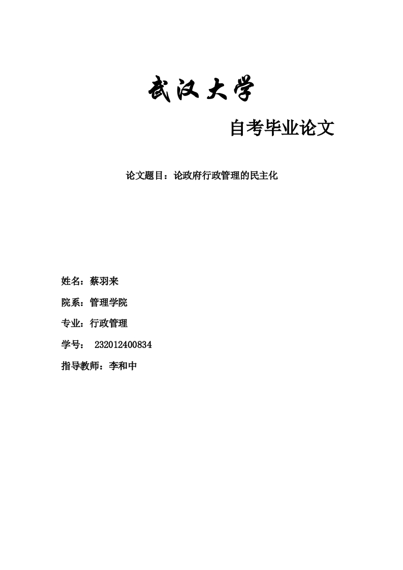 武汉大学自考毕业论文论文题目:论政府行政管理的民主化姓名:蔡羽来院系:管理学院专业:行政管理学号:232012400834指导教师:李和中摘要关键词一、民主理论二、我国政府行政管理民主化的现状(一)政府民主建设的成就(二)政府民主建设的马太效应三、中国政府行政管理民主化问题分析(一)目标有偏差(二)影响力不够(三)民主认识参差不齐四、未来中国政府民主建设的路径选择(一)重视基层政府民主建设工作(二)对民主保持客观的宣传和导向(三)重视已有的政府民主建设(四)正视当前民主建设的困境(五)民主建设要把握好发展速度结论参考文献政府的民主建设摘要本文从政治学和管理学等角度深刻地透视了中国政府民主建设的内容及影响力。对中国政府民主建设的应用,以及现状进行了深入的探讨。同时,通过案例的讨论阐述了中国政府通过变革自身的制度和机制的方式扩大公民参与渠道,从而促进了公民的有效监督。文章运用比较分析等方法,对中国政府民主建设的问题进行了深入的讨论。关键词政府:民主:建设发展民主治理,是持续推进国家现代化,提高综合国力的重要手段。有研究表明,民主治理既能充分地发挥现代化进程中分权化政府的自身优势,又能防止基层政府攫取垄断性政治和经济权力。新的历史时期,党中央、国务院充分注意到了民主治理的重要性,自上而下推行了农村村民自治、社区自治、企事业单位民主管理等形式的民主治理。与此同时,一些政府也通过对自身实际情况的分析,创造性的提出了符合本地经济社会发展的民主建设方式。由于政府建设活动的路径是自下而上的一以本地的成功案例为蓝本逐步向外拓展,所以在现阶段更具有可行性。一、民主理论民主(democracy)作为一个描述政治生活方式的概念,最初源于古希腊语demos和kratos,前者意指“人民”,后者意指“统治”,合在一起构成“民主,,意为“人民的统治”(government by the people)。民主是一定的阶级范围内,按照平等和少数服从多数原则共同管理国家事务的国家体制。法治的政府应通过民主投票选举产生,得到多数人民的支持而获得足够的合法性和权威。国家法律和决策最后要少数服从多数,这是靠多数决的,但是民主反对集权包括多数人的集权,民主意味着同样要尊重少数人的权利。亚里斯多德说过,权力集中在少数人手里和多数人手里是一样的。一个人集权,会成暴君,一群人集权就成了寡头,广大民众集权就成了暴民制。在民主体制下,人民拥有超越立法者和政府的最高主权。所有民主国家都在尊重多数人意愿的同时,极力保护个人与少数群体的基本权利。民主政治强调政治参与,参与的人越多越好。凡是公民,都有政治参与权,都是国家这个政治结合体的“股东”。民主政治是“众人之治”,无论事情的大小都要由众人决定。某一个人的智慧远远没有所有人的智慧那么多,而众人一起犯错的概率原则上应该低于一个人犯错的概率。这正是民主政治的优越之处。民主并不意味着简单的代议制选举或者理想化的全民选举,民主的外延远比选举宽泛。当一个国家腐败横行、政治灰暗的时候,人们往往会归咎于领导人不符合人民选举意愿,但是在德国完善的选举制度下却选举出了希特勒这样的领导人物。可见,选举政府和领导人只是实现民主的途径,而不是民主的最终目标。民主的价值观念和政治体制使政府必须遵循法治,确保全体公民都获得平等的法律保护,其权利受到司法体制的保护。在实行民主政治的国家中,公民不仅享有民主