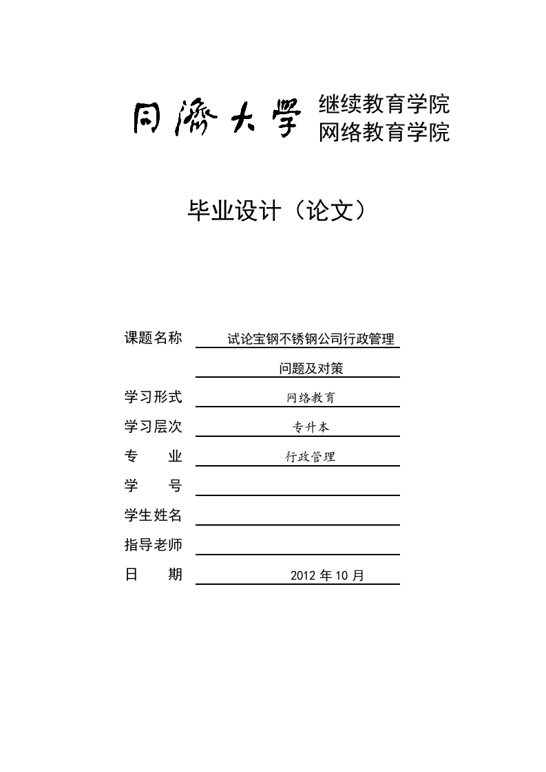 继续教育学院网络教育学院毕业设计(论文)课题名称试论宝钢不锈钢公司行政管理问题及对策学习形式网络教育学习层次专升本专业行政管理学号学生姓名指导老师日期2012年10月毕业设计(论文)报告纸摘要随着宝钢不锈钢公司改革的不断深入,社会主义市场经济体制的逐步建立,公司转换经营机制,建立现代企业制度,企业行政管理也面临着调整旧方式、适应新形势的任务。加强和改进企业行政管理,是搞好公司内部管理,适应市场经济和企业转机建制的重要环节,对于增强企业活力和发展市场经济具有重要意义。企业行政管理在企业的发展过程中起到的作用是不容忽视的,企业行政管理工作涉及到企业的方方面面,关乎整个企业的良好运作。一个企业取得较好的运营效果,在激烈的市场竞争中占有一席之地,除了自身过硬的技术之外,还必须有一套行之有效的管理体制。企业的行政管理事关一个企业的兴衰,它不仅仅涉及到企业运营中的诸多细节,更是企业内部领导与各部门之间的沟通渠道,良好的企业行政管理制度,有助于企业提高管理和运行的效率,促进企业效益的最大化。说到底,企业行政管理最重要的是管理、协调和服务三者必须统一发展,不可偏废其一本文由四部分构成:第一部分主要分析了论文的选题背景及意义,并给出了论文的研究方法与框架:第二部分主要介绍了企业行政管理理论基础:第三部分描述宝钢不锈钢公司行政管理现状:第四部反映了宝钢不锈钢公司行政管理存在的问题:第五部分完善宝钢不锈钢公司行政管理的措施。本文基于对现状的关注,通过对宝钢不锈钢公司行政管理现状的探讨,较为深入和全面的深讨了在宝钢不锈钢公司建立现代企业制度中,如何让看似平谈无奇的行政管理工作跟上改革的步伐,为企业的各项工作做好铺垫,也为企业理顺内部管理,使其能够更好的迎接市场国际化的挑战。【关键词】企业行政管理组织结构毕业设计(论文)报告纸目录412选题价值与意义…13研究方法与研究框架2行政管理理论基础2.1企业行政管理的内容2.2企业行政管理的特点23企业行政管理的功能.2.4企业行政管理的意义3.1宝钢不锈钢公司行政管理制度的现状…63.2当前宝钢不锈钢公司的层级组织机构…4宝钢不锈钢公司行政管理存在问题.....74.1公司高层决策方向把握不准,管理者执行难度较大74.2缺乏适合本企业自身特点的资源配置.…743公司组织结构变化致使资源配置随意性大…4.4公司领导主观配置的方式比较突出…4.5缺乏科学的人才测评手段,人岗匹配不佳.4.6企业人力资源流动性太大,影响到配置的效率84.7激励方式简单,缺乏有效的激励机制5完普宝钢不锈钢公司行政管理的措施...5.1合理配置公司人力资源岗位…85.2知人善用,适人适位招聘…53实现宝钢不锈钢公司扁平化的组织结构95.4实行员工内部流动和平衡…5.5宝钢不锈钢公司行政管理的信息化改革.121314