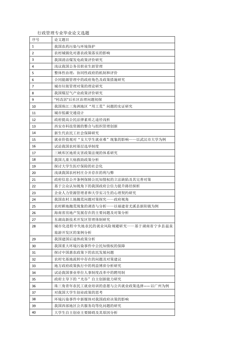 行政管理专业毕业论文选题序号论文趣目1我国农药污染与环境保护2农村城镇化对惠农政策落实的影响3我国清洁煤发电政策评价研究4浅议我国公务员职业生涯管理5整体性治理:协同性政府的机制和评价6合同能源管理中的政府角色及政策措施研究7城市垃圾管理对策的理论研究8我国煤层气产业政策评价研究9“村改居”后社区治理问趣初探10我国珠江三角洲地区“用工荒”问趣的实证研究11城市低碳交通设计12政府提高公民法律素质之途径浅析13西安市科技资源的整合与组织管理创新14新生代农民工社会保障研究15就业价值观对“女大学生就业难”现象的影响一一以武汉市大学为例16试论我国农村基层选举制度17三峡库区地质灾害政策法规的体系研究18我国儿童大病牧助政策分析19探讨大学生医疗保险的社会化20浅谈我国农村村庄合并存在的利与弊21政府信息公开条例保障公民知情权的立法缺陷及其完善对策22基于公众认知视角下的我国政府公信力提升路径探析23企业人力资源管理者和大学实习生的心理契约研究24我国农村土地抛荒问题对策探究一一政府视角25农村耕地抛荒现象的调查与分析—以福建省尤溪县新阳镇为例26海南省房地产发展存在的主要问趣及对策分析27东湖高新技术开发区管理体制研究28城市化进程中失地农民的就业风险规避研究一一基于湖南省宁乡县温泉旅游开发区的案例分析29我国建国后退休政策分析30我国重大环境污染事件中公民知情权的保障31探讨中国惠农政策下的农民发展问趣32农村宅基地流转中存在的问趣及对策建议33地方政府政策执行中的利益博弈分析研究34试论我国事业单位人事制度改革中的聘用制35政府主导下的“光谷”自主创新能力研究36珠三角青年农民工就业培训的意愿与公共就业政策选择一一以广州为例37对我国大学生创业政策的思考38环境污染事件中新媒体对我国政府决策的影响39我国西部地区公共服务均等化问题的研究40大学生自主创业主要障碍及其原因分析41我国矿业权出让市场存在问趣及对策42核事故的政策探讨43我国矿区土地复垦的政策困境及其矫正探讨44关于我国大学生农民工问题成因及影响的研究45关于中国稀士土定价权问趣的探讨46我国就业培训支出与财政政策路径选择研究47我国食品安全管制的模式研究48中美高科技园区竞争力机制的比较研究一一以中国光谷和美国硅谷为例48我国粮食流通政策分析50矿业外商投资政策环境评价指标体系构建研究