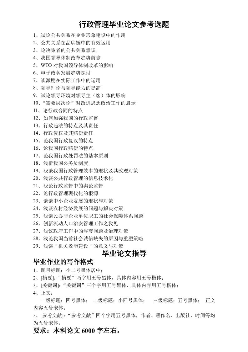 行政管理毕业论文参考选题1、试论公共关系在企业形象建设中的作用2、公共关系在品牌链中的有效运用3、论决策者的公共关系意识4、我国领导体制改革趋势前瞻5、WTO对我国领导体制改革的影响6、电子政务发展趋势探讨7、谈激励在实际工作中的运用8、领导理论与领导能力的提高9、试论领导环境对领导主(客)体的影响10、“需要层次论”对改进思想政治工作的启示11、论行政合同的特点12、如何加强我国的行政监督13、行政违法的特点及其责任14、行政侵权及其赔偿责任15、论我国行政复议的特点16、论我国行政赔偿的特点17、论我国行政处罚法的基本原则18、浅析我国公务员制度19、浅谈我国行政管理效率的现状及其改观对策20、浅谈公共行政管理的信息技术化21、浅论行政监督中的舆论监督22、论行政管理现代化的根源23、谈谈中小企业发展的现状与对策24、浅谈农村经济发展的问题与解决对策25、浅谈民办非企业单位职工的社会保障体系问题26、创新流动人口治安管理工作之我见27、浅议政府工作中的浮夸问题及治理对策28、浅论我国当前社会诚信缺失的原因与重塑策略29、浅谈“机关效能建设“的意义与对策毕业论文指导毕业作业的写作格式1、题目标题:小二号黑体居中:2、[摘要]:“摘要”两字用五号黑体,具体内容用五号楷体:3、[关键词]:“关键词”三个字用五号黑体,具体内容用五号楷体:4、正文:一级标题:四号黑体;二级标题:小四号黑体:三级标题:五号黑体;正文内容五号宋体。5、[参考文献]:“参考文献”四个字用五号黑体,作者、著作名、出版社、时间等均为五号宋体。要求:本科论文6000字左右。