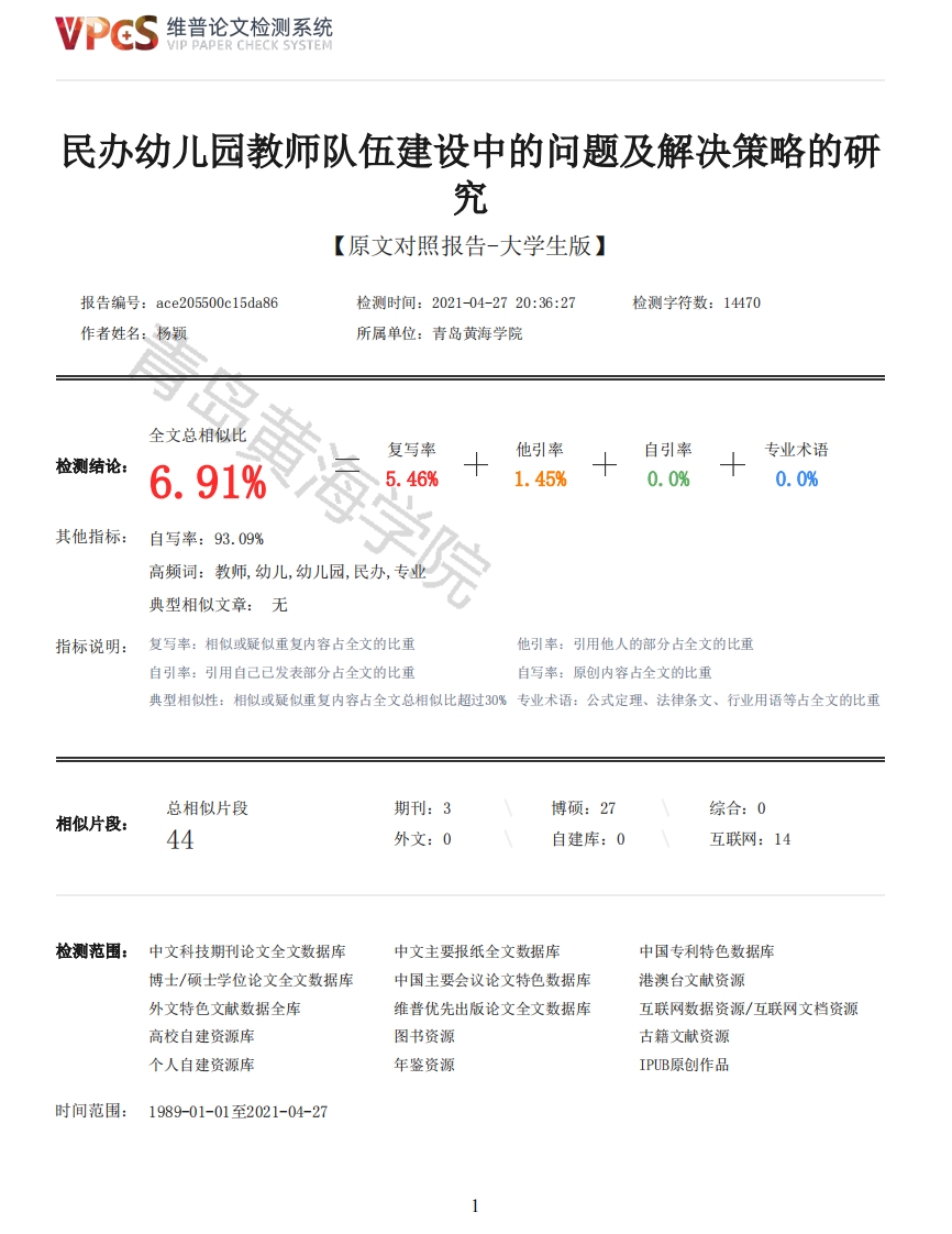 维普论文检测系统/IP PAPER CHECK SYSTEM民办幼儿园教师队伍建设中的问题及解决策略的研究【原文对照报告-大学生版】报告编号:ace205500c15da86检测时间:2021-04-2720:36:27检测字符数:14470作者姓名:杨颗所属单位:青岛黄海学院全文总相似比检测结论:其他指标:自写率:93.09%黄海学院复写率他引率自引率专业术语6.915.46%1.45%0.0%0.0%高频词:教师,幼儿,幼儿园,民办,专业典型相似文章:无指标说明:复写率:相似或疑似重复内容占全文的比重他引率:引用他人的部分占全文的比重自引率:引用自己已发表部分占全文的比重自写率:原创内容占全文的比重典型相似性:相似或疑似重复内容占全文总相似比超过30%专业术语:公式定理、法律条文、行业用语等占全文的比重总相似片段期刊:3博硕:27综合:0相似片段:44外文:0自建库:0互联网:14检测范围:中文科技期刊论文全文数据库中文主要报纸全文数据库中国专利特色数据库博士/硕士学位论文全文数据库中国主要会议论文特色数据库港澳台文献资源外文特色文献数据全库维普优先出版论文全文数据库互联网数据资源/互联网文档资源高校自建资源库图书资源古籍文献资源个人自建资源库年鉴资源IPUB原创作品时间范围:1989-01-01至2021-04-27维普论文检测系统VIP PAPER CHECK SYSTEM原文对照颜色标注说明:■自写片段■复写片段(相似或疑似重复)引用片段(引用)■专业术语(公式定理、法律条文、行业用语等)摘要学前教育是我国教育的基础,教师是基础的基础:立德树人是教育的根本,教师是根本的根本。目前国家对幼儿园越来越重视,民办幼儿园是幼儿教育的重要力量,其作用不言而喻。经过访谈及问卷调查,可以发现民办幼儿园中还存在一些问题,如教师专业素养不高、职业认同感低等。本研究共分为四个部分,第一部分包括问题的提出、研究目的与意义、国内外研究文献综述、研究方法工具以及研究对象:第二部分包括民办幼儿园教师队伍建设的现状调查:第三部分包括民办幼儿园教师队伍建设中存在的问题,分别从教师个人、幼儿园以及政府三方面分析:第四部分是民办幼儿园教师队伍建设问题的解决策略,是从教师个人层面、幼儿园层面以及政府层面寻找解决策略。关键词:民办幼儿园:教师队伍建设:解决策略AbstractPreschool education is the foundation of education in China,teachers are the foundation of thefoundation.Moral education is the root of education and teacher is root of the fundamental.Atpresent,it is paying more and more attention private kindergarten is an important force in earlychildhood education,its role is self-evident.Through interviews and questionnaires,it can be found that there are some problems in privatekindergartens,such as low teachers'quality andlow professional identity.This research is dividedinto four parts.The first part is the proposal of the problem,the purpose and significance of theresearch,the review of domestic and foreign research literature,the research methods and tools,research purpose.The second part is the investigation of the current situation of the constructionof private kindergarten teachers.The third part is the problem existing in the construction ofprivate kindergarten teachers,respectively from the teachersof kindergarten and government three aspects of analysis;The fourth part isthe solution to the problems of private kindergarten teacher team construction.Keywords:private kindergarten;construction of Teachers;resolution strategy目录引言1(一)问题提出11.教师队伍建设对于幼儿园的兴衰至关重要12.民办幼儿园教师队伍建设中存在诸多问题12维普论文检测系统VIP PAPER CHECK SYSTEM(二)研究目的与研究意义11.研究目的12.研究意义1(三)文献综述21.概念界定22.相关研究综述2(四)研究计划41.研究内容42.研究对象43.研究方法5一、民办幼儿园教师队伍建设现状调查6(一)教师的专业素养6(二)教师的职业生涯规划意愿6(三)教师每天平均工作时间调查7(四)教师的培训次数7二、民办幼儿园教师队伍建设中存在的问题8(一)教师方面81.教师的专业素养不高82.教师的职业认同感不高93.职业生涯规划的能力有待提升9(二)幼儿园方面91.教师福利少待遇不高9海学院2.培训机会少9(三)政府方面101.对民办幼儿教师的关注度较低102.从业标准较低和监管力度不够10三、民办幼儿园教师队伍建设问题的解决策略10(一)教师自身101.促进教师专业化发展102.加强自身的职业认同感113.提高教师职业规划的能力12(二)幼儿园方面121.提高教师的福利待遇以及工资水平122.增加培训交流机会123.完善民办幼儿园的管理制度13(三)政府方面131.健全相关的法律法规并完善民办园教师的保障体系132.提高教师从业标准并加大监管力度14结论14参考文献15致谢16附录18附录118附录219引言(一)问题提出1.教师队伍建设对于幼儿园的兴衰至关重要3
