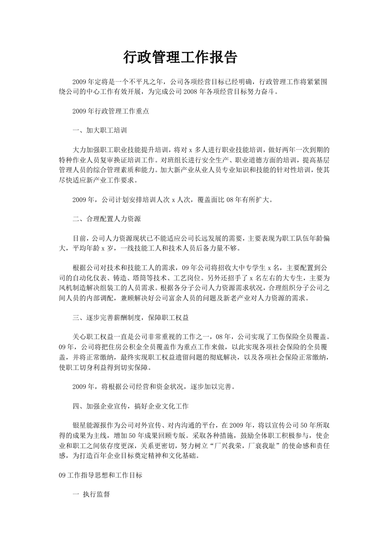 行政管理工作报告2009年定将是一个不平凡之年,公司各项经营目标己经明确,行政管理工作将紧紧围绕公司的中心工作有效开展,为完成公司2008年各项经营目标努力奋斗。2009年行政管理工作重点一、加大职工培训大力加强职工职业技能提升培训,将对x多人进行职业技能培训,做好两年一次到期的特种作业人员复审换证培训工作。对班组长进行安全生产、职业道德方面的培训,提高基层管理人员的综合管理素质和能力。加大新产业从业人员专业知识和技能的针对性培训,使其尽快适应新产业工作要求。2009年,公司计划安排培训人次x人次,覆盖面比08年有所扩大。二、合理配置人力资源目前,公司人力资源现状己不能适应公司长远发展的需要,主要表现为职工队伍年龄偏大,平均年龄x岁,一线技能工人和技术人员后备力量不够。根据公司对技术和技能工人的需求,09年公司将招收大中专学生X名,主要配置到公司的自动化仪表、铸造、塔筒等技术、工艺岗位。另外还招手了x名左右的大专生,主要为风机制造解决组装工的人员需求。根据各分子公司人力资源需求状况,合理组织分子公司之间人员的内部调配,兼顾解决好公司富余人员的问题及新老产业对人力资源的需求。三、逐步完善薪酬制度,保障职工权益关心职工权益一直是公司非常重视的工作之一,08年,公司实现了工伤保险全员覆盖。09年,公司将把住房公积金全员覆盖作为重点工作来做,以此实现各项社会保险的全员覆盖,并将正常缴纳,最终实现职工权益遗留问题的彻底解决,以及各顶社会保险正常缴纳使职工切身利益得到切实保障。2009年,将根据公司经营和资金状况,逐步加以完善。四、加强企业宣传,搞好企业文化工作银星能源报作为公司对外宣传、对内沟通的平台,在2009年,将以宣传公司50年所取得的成果为主线,增加50年成果回顾专版。采取各种措施,鼓励全体职工积极参与,使企业和职工之间依存度更深,关系更密切,努力树立“厂兴我荣,厂衰我耻”的使命感和责任感,为打造百年企业目标莫定精神和文化基础。09工作指导思想和工作目标一执行监督作为企业的行政人事经理,其不仅要做好本部门的管理工作,还需担负起总经理秘书的职责,承办总经理及董事会交办的各项事宜,加强对各项工作的督促和检查,同时还需定期对公司的相关制度及总经理董事会交办的事项进行检查监督,核实完成执行情况,并及时把执行过程中的问题汇总向上反映,做出调整,便于以后工作的改进。二组织管理不同的管理理念导致不同的管理方式,不同的管理方式将会导致不同的管理结果。在行政管理中,应运适合企业特点的刚柔并济的管理模式,制定一套符合企业自身的管理制度,并运用权利和组织系统,进行指挥、控制、命令等管理手段来达到企业和谐规范的目的。三沟通协调任何一种组织,都需要进行沟通协调。在企业中,行政部门就担当起了协调沟通的载体。作为行政经理应协助总经理搞好各部门之间的综合协调,落实公司规章制度,沟通内外联系,保证上情下达和下情上报,加强对外联络,拓展公关业务,保证部门之间及公司对外联系的通畅,更充分的形成良好的团队,提高合作效率。四服务外联行政部在企业中也是后勤的保障部门,加强对水电、办公用品、固定资产、电话传真、卫生环境、网络等的管理,更有效的做好服务工作,同时还需进行对外联络,同一些相关职能部门、媒体的联系,塑造企业精神环境形象,提升企业对内对外的品牌建设。五文化建设企业文化不但能反映出企业生产经营活动中的战略目标,群体意识、价值观念和道德规范,还能凝集企业员工的归属感、积极性和创造性,引导企业员工为企业和社会的发展而努力。一个有战略规划的企业,其文化建设均需经历三个层面:一是人治阶段,其次是法治阶段,即规章制度的管理约束,第三便是文治,也就是通过企业文化的完善形成一种无形的管理手段,来约束企业员工,遵循企业的各种规章制度,创造一种良好的工作环境。主要表现在一下几方面:1、企业精神形象,对于员工有强大的凝聚力,感召力,引导力和约束力,能增加员工对企业的信任感,自豪感和荣誉感。2、企业环境形象因为创造良好的企业环境,是企业生产经营活动顺利进行的前提和基础,而充分认识企业环境的特征又是创造良好企业环境的基础。3、企业员工形象制定《员工日常行为规范》,良好的员工素质和形象,是企业形象的重要构成要素。员工的仪表装束、言谈举止、工作能力、科学文化水平、精神风貌、工作效率等都会给社会公众一个整体印象。09年工作指导原则和方针1、明确岗位职责。日常办公事务管理包括日常事务的计划安排、组织实施、信息沟通、协调控制、检查总结和奖励惩罚等方面的管理工作:办公物品管理包括办公物品的发放、使用、保管、采购以及相应制度的制定:文书资料管理包括印信管理、公文管理、档案管理、书刊管理:会议管理包括会前准备、会中服务、会后工作:其他事务视具体情况而定。作为行政部门就要按岗位职责明确分工,保证每项工作有人抓。2、加强沟通。沟通包括纵向沟通和横向沟通。纵向沟通分为与上级沟通和与下级部门沟通。与上级沟通主要是充分领悟上级领导的意图,把握住方向,同时将自己和下级部门的观点很好的传达给上级,这需要行政人员有