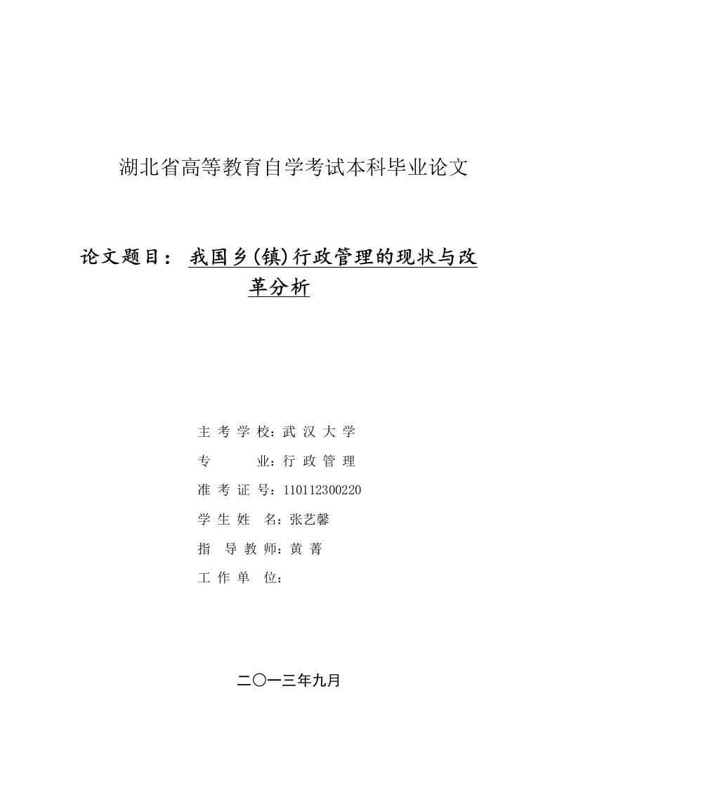 湖北省高等教育自学考试本科毕业论文论文题目:我国乡(镇)行政管理的现状与改革分析主考学校:武汉大学专业:行政管理准考证号:110112300220学生姓名:张艺馨指导教师:黄菁工作单位:二○一三年九月郑重声明本人呈交的论文,是在导师的指导下,独立进行研究工作所取得的成果,所有数据、图片资料真实可靠。尽我所知,除文中已经注明引用的内容外,本论文的研究成果不包含他人享有著作权的内容。对本论文所涉及的研究工作做出贡献的其他个人和集体,均已在文中以明确的方式标明。本论文的知识产权归属于培养单位。本人签名:日期:摘要全面建设小康社会和构建社会主义和谐社会对新形势下的乡镇行政管理改革提出了更高的要求。由于完善体制机制是谋求科学发展的重要保障,而行政管理体制改革是完善体制机制中非常重要的组成部分。基于以上原因,本文探讨以下内容:第一,我国乡(镇)行政管理的现状。本部分从机构设置和管理和行政运行方式两个方面进行概述。第二,我国乡(镇)行政管理存在的问题。主要包括职能错位严重、行政运作方式不科学、财政不足,腐败严重、党、政、事混同及公务员选拔任用体系不完第三,我国乡(镇)行政管理存在问题的原因。本部分针对上述问题进行原因分析,主要原因为对政府职能认识错误及乡镇的职能体制被削弱。第四,我国乡(镇)行政管理的政策。基于以上分析,本部分总结了有利于我国发展的乡(镇)行政管理的政策。从完善机构设置、转变政府职能、深化改革目标、精兵简构等方面进行总结。综上所述,本课题的研究旨在促进我国乡(镇)行政管理趋向合理化发展。关键词:乡(镇)行政管理;现状:改革