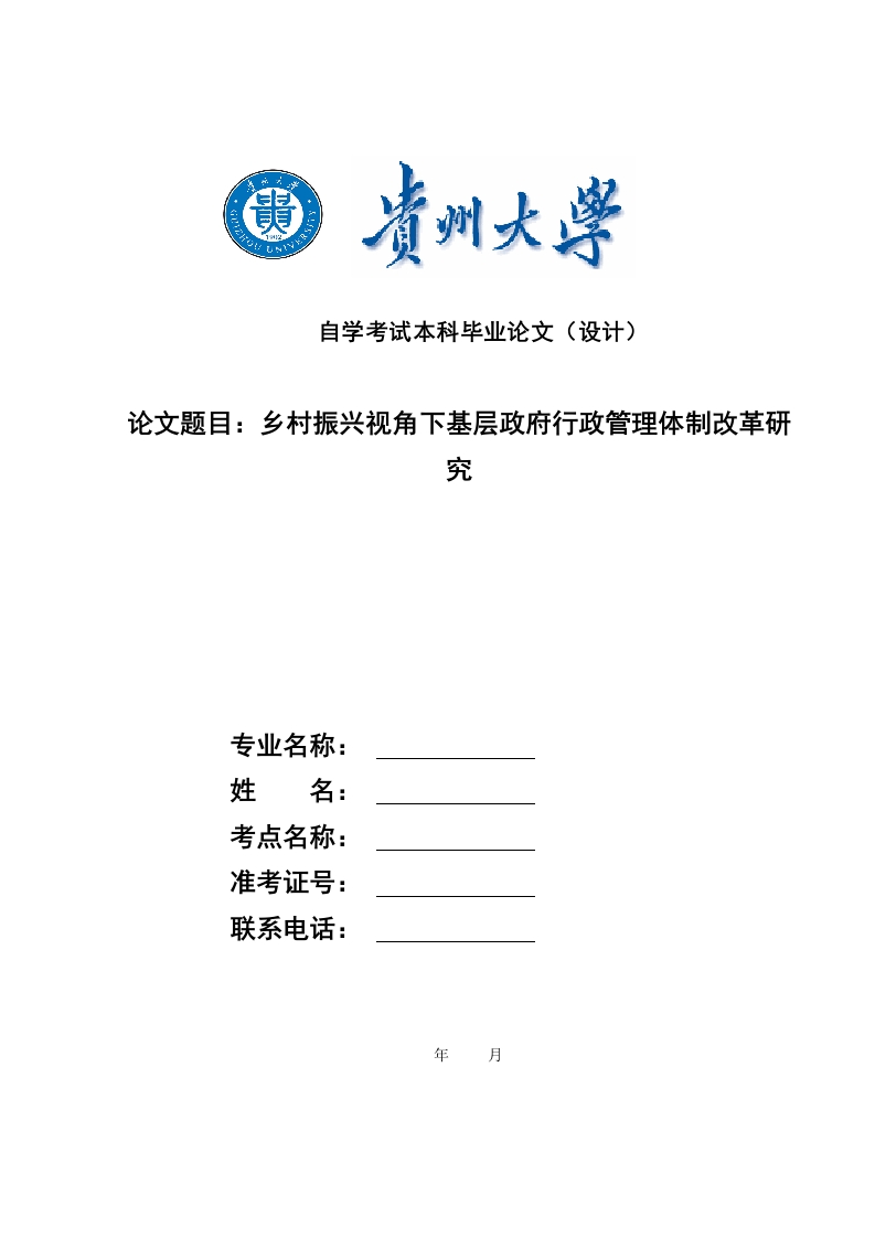 自学考试本科毕业论文(设计)论文题目:乡村振兴视角下基层政府行政管理体制改革研究专业名称:姓名:考点名称:准考证号:联系电话:年月贵州大学自学考试本科毕业论文(设计)诚信责任书本人郑重声明:本人所呈交的毕业论文(设计),是独立进行研究所完成。毕业论文(设计)中凡引用他人已经发表或未发表的成果、数据、观点等,均已明确注明出处。特此声明。论文(设计)作者签名:日期:乡村振兴视角下基层政府行政管理体制改革研究摘要作为乡村振兴战略具体实施,要求基层政府不断创新以适应新的工作要求。当前,基层政府在乡村振兴实践中存在人员、组织、制度建设等方面问题,需要针对问题加强基层政府建设,才能够更好发挥基层政府在乡村振兴中的作用关键词:基层政府:乡村振兴:基层政府治理