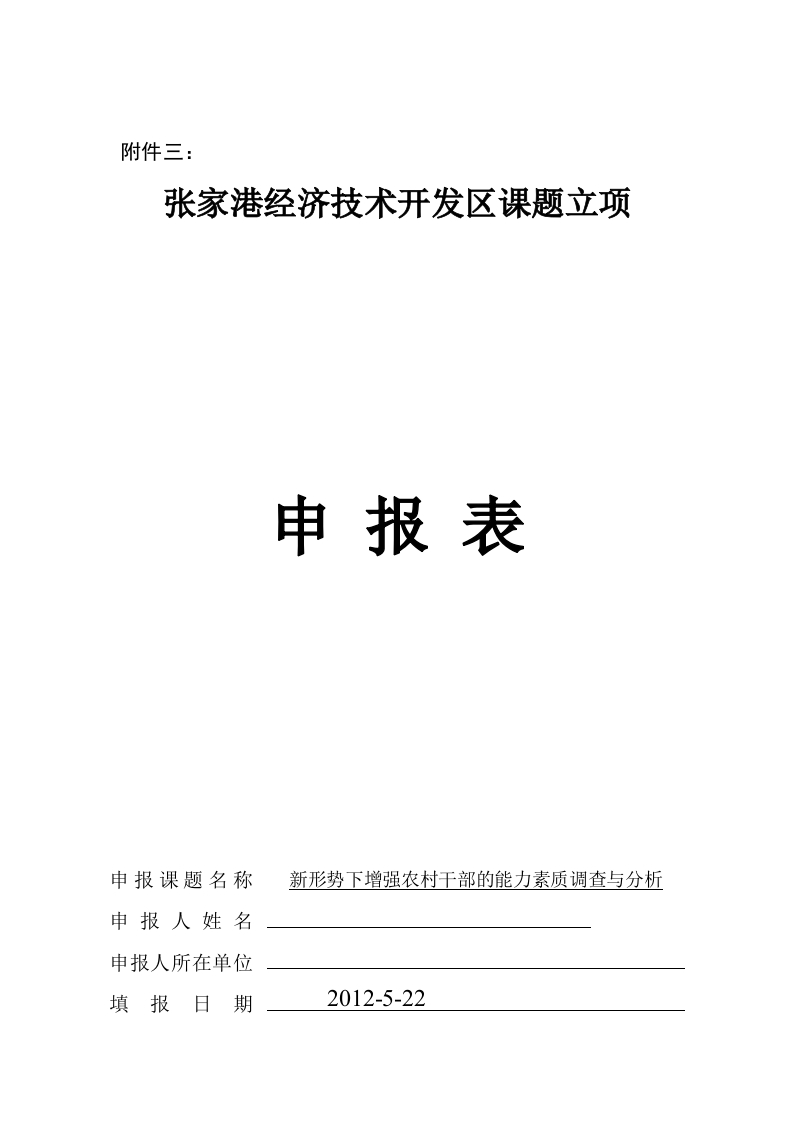 附件三:张家港经济技术开发区课题立项申报表申报课题名称新形势下增强农村干部的能力素质调查与分析申报人姓名申报人所在单位填报日期2012-5-22填表须知一、每个课题限报申报人1人,课题申报人必须是该项目的实际负责人,并在该课题研究中承担实质性任务。二、课题组主要成员是指课题申报人之外的课题研究方案的设计人员、研究人员与子课题负责人等。三、申报表须经课题申报人所在村、办事处等单位加盖公章。四、申报表请认真如实填写(或打印),可自行增印书写页面。五、申报表需一式三份。其中一份为原件,另二份可为复印件。申报课题名称新形势下增强农村干部的能力素质调查与分析姓名性别女年龄28职称申工作单位职务报人通讯地址邮编215627联系电话传真E-mail姓名性别年龄职称工作单位专长分工主要成员课题组主要成员正在担任的其他研究项目课题名称实施时间批准单位