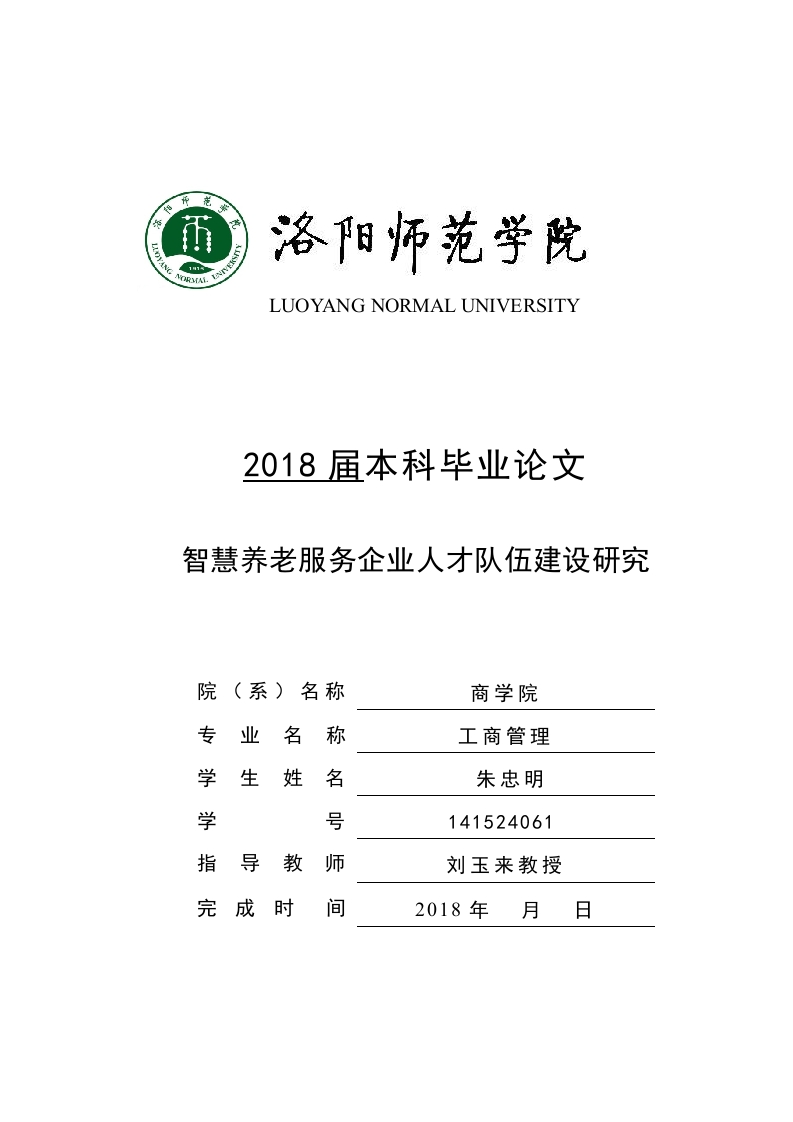 洛阳师范学院LUOYANG NORMAL UNIVERSITY2018届本科毕业论文智慧养老服务企业人才队伍建设研究院(系)名称商学院专业名称工商管理学生姓名朱忠明学号141524061指导教师刘玉来教授完成时间2018年月日智慧养老服务企业人才队伍建设研究朱忠明商学院工商管理专业学号:141524061指导教师:刘玉来教授摘要:我国智慧服务养老行业经过数十年的发展已经逐步取得了喜人的成果,但目前现阶段仍然面临着一定的发展阻碍,最主要的问题还是行业高素质人才严重缺乏,从业人员数量远不能满足实际需求。从社会大环境的角度来看,是由于近年来我国人口结构的变化无法满足劳动力市场的需求,具体到智慧服务养老行业来看,则是由于该行业目前的就业吸引力还有待进一步提高。因此,进一步重视该行业人才队伍建设,促进行业更好地发展对当下社会而言显得尤为重要。关键词:人才队伍建设;智慧养老企业;人才流失:《中国养老产业发展白皮书》中针对我国人口老龄化现象给出一组数据,数据表明截至2015年底,我国60周岁及以上老年人口数量已经达到2.22亿,占到总人口的16.1%。老年人口数量的不断攀升宣告着我国人口老龄化社会的到来。伴随着人口老龄化,我国养老服务业快速迅猛发展,以互联网技术为主要支撑,对养老产业链和养老产业相关衍生产品与服务的升级换代正在迎来关键产业升级时刻,但值得注意的是,与之相匹配的行业人才队伍的建设却没有得到良好的发展。一、智慧养老企业的内涵与发展趋势2015年300余个城市被我国住房城乡建设部确定为国家新型智慧城市试点,伴随着国家智慧城市的发展进程,我国养老服务也逐渐走向为“智慧养老”道路。(一)智慧养老企业的内涵界定英国生命信托基金的“全智能老年系统”、“智慧养老”为养老产业带来了创新性的革命性突破,它们不仅能够拓宽服务老年人的地域范围,同时也能更加全方位地提高服务老年人的时长。“智慧养老”和“智能养老”之间虽仅一字之差,但涵义却大有不同。“智能养老”强调的是利用一些智能信息系统来更好地服务老年人生活,促进老年人养老舒适化,通过一些智能设备来保证老年人的养老生活更加安全,促进医护人员实时监控检测老年人的地理位置及身体各项健康指标,有效预防老年人在生活中发生意外。智能养老企业旨在利用现代技术,如互联网、物联网、大数据和云计算,使得老年人1护理服务更加智能化和互联化。利用一些传感系统以及信息媒介来进一步提高老年人养老生活质量,不仅仅在养老费用上更加节省,而且更能保证养老生活的高质量。之所以说智慧养老的内涵远远大于智能养老,是因为智慧养老系统将传统的养老服务在技术、方法、内容和模式等多个方面上进行了较大程度的革新,不仅是物联网等新一代信息科学技术对以往老式的养老服务进行基础性的功能升级,更是在养老理念与行业发展动态上进行更深层次的革新,促进该行业像更加现代化、技术化的方向发展。(二)智慧养老服务企业对传统养老服务的革新科学技术不断进步,各个行业都在积极借助高新技术的力量来大力推动本行业的快速发展。新联网与新媒体等信息技术不仅仅打破了养老服务行业的地域限制,更是大大延长了服务时间,24小时全天候的信息快速传达使得智慧养老突破了时间限制,相关服务变得更加准确及时。养老关系到的不仅仅只是社会老年人与其家人等相关角色而已,智慧养老拓宽了产业参与边界,带动了更多社会角色参与到该项工程当中去,其中包括政府、企业、社会各个参与者。物联网是互联网在物物连接领域的创新,不仅比互联网应用主体更多,还更加便携,最重要的是将人与物相连接。传感器作为物联网技术的核心在养老服务领域的应用中有着举足轻重的地位,不管是精准定位还是远程监控、远程医疗,传感器都在其中扮演主要角色。大数据技术将老年人和养老资源所有相关数据整合到了一起,满足了养老服务的个性化需求,也使得养老服务变得精细化。云计算技术使得智慧养老服务平台的建设更加简单化和完整化,这一技术大大加强了智慧养老服务平台的资源整合能力和评估计算能力,为智慧养老服务平台的日常运行提供了技术支持。(三)我国智慧养老服务企业的发展趋势1.服务产品人性化目前我国养老行业服务老年人的重点还大多数停留在满足老年人的基本物质生活需求上,对老年人的精神生活需求关注还比较缺乏,更别提在满足老年人实现更高的社会价值和自我实现价值,目前我国的老年人空巢家庭数已接近半数,老年人需要更多的精神满足。因此,未来智慧养老服务将更加人性化地关注老年人包括精神世界在内的各方面的需求。2.健康管理线上线下相结合2