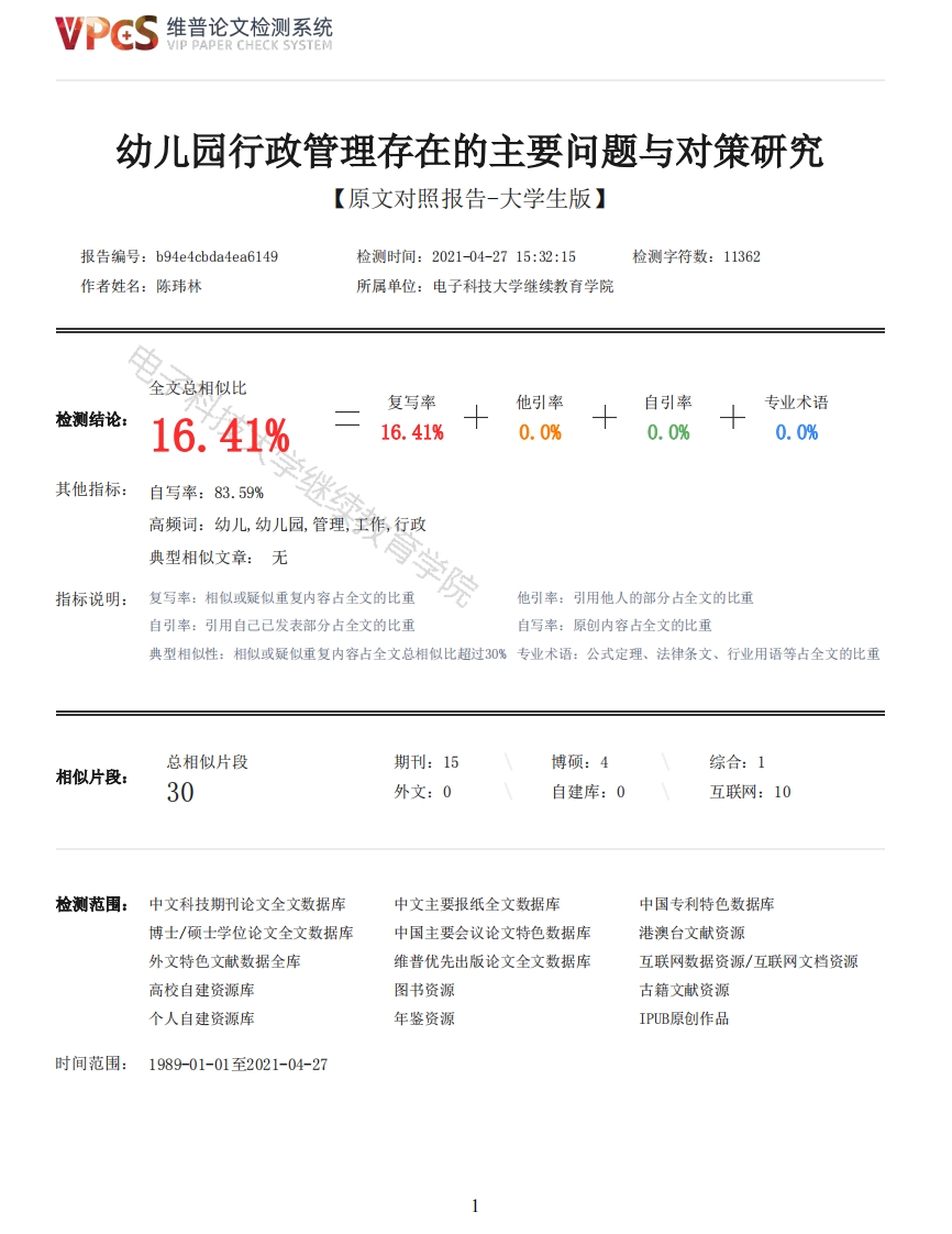维普论文检测系统/IP PAPER CHECK SYSTEM幼儿园行政管理存在的主要问题与对策研究【原文对照报告-大学生版】报告编号:b94e4cbda4ea6149检测时间:2021-04-2715:32:15检测字符数:11362作者姓名:陈玮林所属单位:电子科技大学继续教育学院全文总相似比复写率他引率自引率专业术语检测结论:16.41%16.41%0.0%0.0%0.0%其他指标:自写率:83.59%高频词:幼儿,幼儿园,管理,工作,行政典型相似文章:无指标说明:复写率:相似或疑似重复内容占全文的比重他引率:引用他人的部分占全文的比重自引率:引用自己已发表部分占全文的比重自写率:原创内容占全文的比重典型相似性:相似或疑似重复内容占全文总相似比超过30%专业术语:公式定理、法律条文、行业用语等占全文的比重总相似片段期刊:15博硕:4综合:1相似片段:30外文:0自建库:0互联网:10检测范围:中文科技期刊论文全文数据库中文主要报纸全文数据库中国专利特色数据库博士/硕士学位论文全文数据库中国主要会议论文特色数据库港澳台文献资源外文特色文献数据全库维普优先出版论文全文数据库互联网数据资源/互联网文档资源高校自建资源库图书资源古籍文献资源个人自建资源库年鉴资源IPUB原创作品时间范围:1989-01-01至2021-04-27VPCS维普论文检测系统VIP PAPER CHECK SYSTEM原文对照颜色标注说明:■自写片段■复写片段(相似或疑似重复)口引用片段(引用)■专业术语(公式定理、法律条文、行业用语等)电子科技大学毕业设计(论文)论文题目幼儿园行政管理存在的主要问题与对策研究学习中心(或办学单位):成都市青羊区孟翔教育培训中心指导老师:范华英职称:学生姓名:陈玮林学号:V191080174201001专业:行政管理继续教育学院电子科技大学网络教育学院2021年5月10日电子科技大学毕业设计(论文)任务书题目:幼儿园行政管理存在的主要问题与对策研究任务与要求:针对幼儿园当前行政管理工作现状以及个体案例,分析该如何有效进行幼儿园的行政管理工作和进行工作的有效策略。时间:2021年1月13日至2021年5月6日共14周学习中心:(或办学单位)成都市青羊区孟翔教育培训中心学生姓名:陈玮林学号:V191080174201001专业:行政管理指导单位或教研室:成都市青羊区孟翔教育培训中心指导教师:范华英职称:继续教育学院电子科技大学制网络教育学院2021年5月10日毕业设计(论文)进度计划表指导教师日期工作内容执行情况签字1月13日2维普论文检测系统VIP PAPER CHECK SYSTEM至选择答辩方式、选题完成3月8日3月9日至撰写论文、提交初稿完成3月31日4月1日至修改论文、提交复稿完成4月19日确定答辩方式4月19日前(书面、现场)4月20日至校对论文、提交终稿5月7日至14日/5月15书面答辩/现场答辩教师对进度计划实施情况总评签名年月日本表作评定学生平时成绩的依据之一。摘要我国的教育事业目前正处于高速发展的状态,在我国新创办的幼儿园规模逐年保持持续上升。目前,我国的幼儿园已经在办学形式上体现了多元化以及规模化的发展,这就让当前我国幼儿园在行政管理模式上面临着特别大的挑战。针对目前大多数幼儿园在行政管理中普遍存在的一些突出问题,始终秉承以人为核心的教育发展理念和管理思想,完善并购创新幼儿园管理体制与教育发展思路,充分调动幼儿园全体教职工的事业热情和其工作积极性,打造优秀的幼儿园。关键词创新行政管理:工作现状:重要性:优秀的幼儿园:AbstractWiththerapiddevelopmentofeducation,thenumberofkindergartensinmycountryhasbeenincreasingyearbyyear.Atpresent,kindergartensarepresentingdiversifiedandlarge-scaleschool-runningforms,whi chmakes thecurrentmanagementmethodsofkindergartensfaceveryhugechallenges.Inviewof thecurrentproblemsintheadministrativemanagementofkindergartens,onlybyadheringtothepeople-canwepromotethephysicalandmentalheal thofchildrenandbuildexcellenceKindergarten.目录第一章幼儿园行政管理工作现状1第二章目前造成幼儿园行政管理执行力差的原因1第一节缺乏专业的行政管理知识与业务能力1第二节各部门间的职权划分不明确2第三节幼儿园行政工作精细化管理存在问题2第二章针对幼儿园行政管理提升分析4第一节执行力在幼儿园管理中心的地位4第二节创新行政管理的必要性和重要意义4第三章幼儿园行政管理案例剖析5第一节少了一份点心53