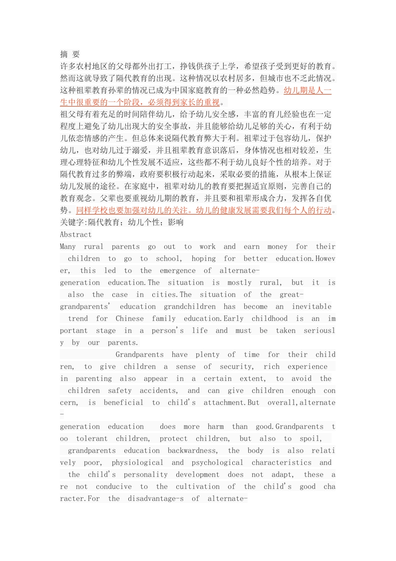 摘要许多农村地区的父母都外出打工,挣钱供孩子上学,希望孩子受到更好的教育。然而这就导致了隔代教育的出现。这种情况以农村居多,但城市也不乏此情况。这种祖辈教育孙辈的情况已成为中国家庭教育的一种必然趋势。幼儿期是人一生中很重要的一个阶段,必须得到家长的重视。祖父母有着充足的时间陪伴幼儿,给予幼儿安全感,丰富的育儿经验也在一定程度上避免了幼儿出现大的安全事故,并且能够给幼儿足够的关心,有利于幼儿依恋情感的产生。但总体来说隔代教育弊大于利。祖辈过于包容幼儿,保护幼儿,也对幼儿过于溺爱,并且祖辈教育意识落后,身体情况也相对较差,生理心理特征和幼儿个性发展不适应,这些都不利于幼儿良好个性的培养。对于隔代教育过多的弊端,政府要积极行动起来,采取必要的措施,从根本上保证幼儿发展的途径。在家庭中,祖辈对幼儿的教育要把握适宜原则,完善自己的教育观念。父辈也要重视幼儿期的教育,并且要和祖辈形成合力,发挥各自优势。同样学校也要加强对幼儿的关注。幼儿的健康发展需要我们每个人的行动。关键字:隔代教育:幼儿个性:影响AbstractMany ruralparents go out to work and earn money for theirchildren to go to school,hoping for better education.However,this led to the emergence of alternate-generation education.The situation is mostly rural,but it isalso the case in cities.The situation of the great-grandparents'education grandchildren has become an inevitabletrend for Chinese family education.Early childhood is an important stage in a person's life and must be taken seriously by our parents.Grandparents have plenty of time for their children,to give children a sense of security,rich experiencein parenting also appear in a certain extent,to avoid thechildren safety accidents,and can give children enough concern,is beneficial to child's attachment.But overall,alternategeneration education does more harm than good.Grandparentstoo tolerant children,protect children,but also to spoil,grandparents education backwardness,the body is also relatively poor,physiological and psychological characteristics andthe child's personality development does not adapt,these are not conducive to the cultivation of the child's good character.For the disadvantage-s of alternate-generationeducation,the government should take the necessary measuresto ensure the development of children.Inthe family,the grandchild's education should grasp the appropriateprinciple and improve its own education concept.Parentsshouldalso pay attention to the education of early childhood,and they should work together withgrandparentsto usetheirstrength.The same schools need to focus on young children.The healthy development of young children needs the actions of all of us.Key Words:alternate-generationeducation;Infants'personality;Influence目录T0C\o"1-4”h \u HYPERLINK\1”Toc481452334”摘要IHYPERLINK\1”Toc481452335”Abstract IIHYPERLINK\1”Toc481452336”目录IIIHYPERLINK\1”Toc481452337”引言1HYPERLINK \1 Toc481452338"一、隔代教育和幼儿个性的概念界定2HYPERLINK \1 Toc481452339"(一)隔代教育的含义2HYPERLINK\1”Toc481452340”(二)个性的含义以及幼儿个性的概念2HYPERLINK\1”ToC481452341”二、我国隔代教育的现状分析2HYPERLINK\1”Toc481452342”(一)我国接受隔代教育的幼儿比例较大2HYPERLINK\1”Toc481452343”(二)孩子年龄越小,祖辈的参与教养度越大3HYPERLINK\1”Toc481452344”(三)祖辈在教育思想上落后3HYPERLINK\1”ToC481452345”(四)祖辈对教育方法缺乏创新3HYPERLINK\1”ToC481452346”(五)祖辈对幼儿的教育内容比较单一3HYPERLINK \1 Toc481452347"三、隔代教育对幼儿个性发展的积极影响4HYPERLINK \1 Toc481452348"(一)祖辈的亲情关怀,利于幼儿依恋情感的产生4HYPERLINK \1 Toc481452349"(二)祖辈丰富的抚养经验,利于幼儿的身体健康4HYPERLINK \1_Toc481452350"(三)祖辈有充足的时间陪伴幼儿,抑制幼儿孤独感等消极情感的产生4HYPERLINK \1 "_Toc481452351"四、隔代教育对幼儿个性发展的消极影响4HYPERLINK \1 Toc481452352"(一)祖辈过多包容让幼儿更加以自我为中心4HYPERLINK\1”Toc481452353”(二)祖辈过分溺爱导致幼儿缺乏独立性5HYPERLINK\1”_Toc481452354”(三)祖辈落后观念不利于幼儿创新能力的养成6HYPERLINK \1 Toc481452355"(四)祖辈过多保护不利于幼儿勇气,自信等个性的培养6HYPERLINK \1 Toc481452356"(五)祖辈的生理心理特点不利于幼儿活泼性格的养成6HYPERLINK1”Toc481452357”(六)祖辈身体状况制约幼儿社交能力的形成7HYPERLINK\1”ToC481452358”(七)祖辈的教育意识不强影响幼儿良好品质的培养7HYPERLINK\1”Toc481452359”五、减少隔代教育消极影响的建议8HYPERLINK\1”Toc481452360”(一)社会方面8HYPERLINK\1”ToC481452361”1.政府的支持8HYPERLINK\1”_Toc481452362”(1)颁布针对性的教育法规,完善各项规章制度8HYPERLINK \1 Toc481452363"(2)鼓励“外出人员”和剩余劳动力在家门口就业8HYPERLINK\1”ToC481452364”(3)组织办好家长学校8HYPERLINK\1”Toc481452365”(4)发展寄宿制学校,为幼儿提供便利9HYPERLINK\1”Toc481452366”2.发挥社会舆论的作用9HYPERLINK\1”Toc481452367”(二)家庭方面9HYPERLINK\1”ToC481452368”1.祖辈方面9HYPERLINK\1”ToC481452369”(1)合理把握爱的尺度9HYPERLINK\1”Toc481452370”(2)转变教育思想、学习科学的教育方法9HYPERLINK\1”Toc481452371”2.父辈方面9HYPERLINK\1”Toc481452372”(1)转变教育观念,注重幼儿期的教育9HYPERLINK\1”_Toc481452373”(2)提高责任感,加强育儿知识的学习10HYPERLINK\1”ToC481452374”3.祖辈与父辈形成教育合力10HYPERLINK\1”ToC481452375”(1)祖辈与父辈教育思想保持一致1