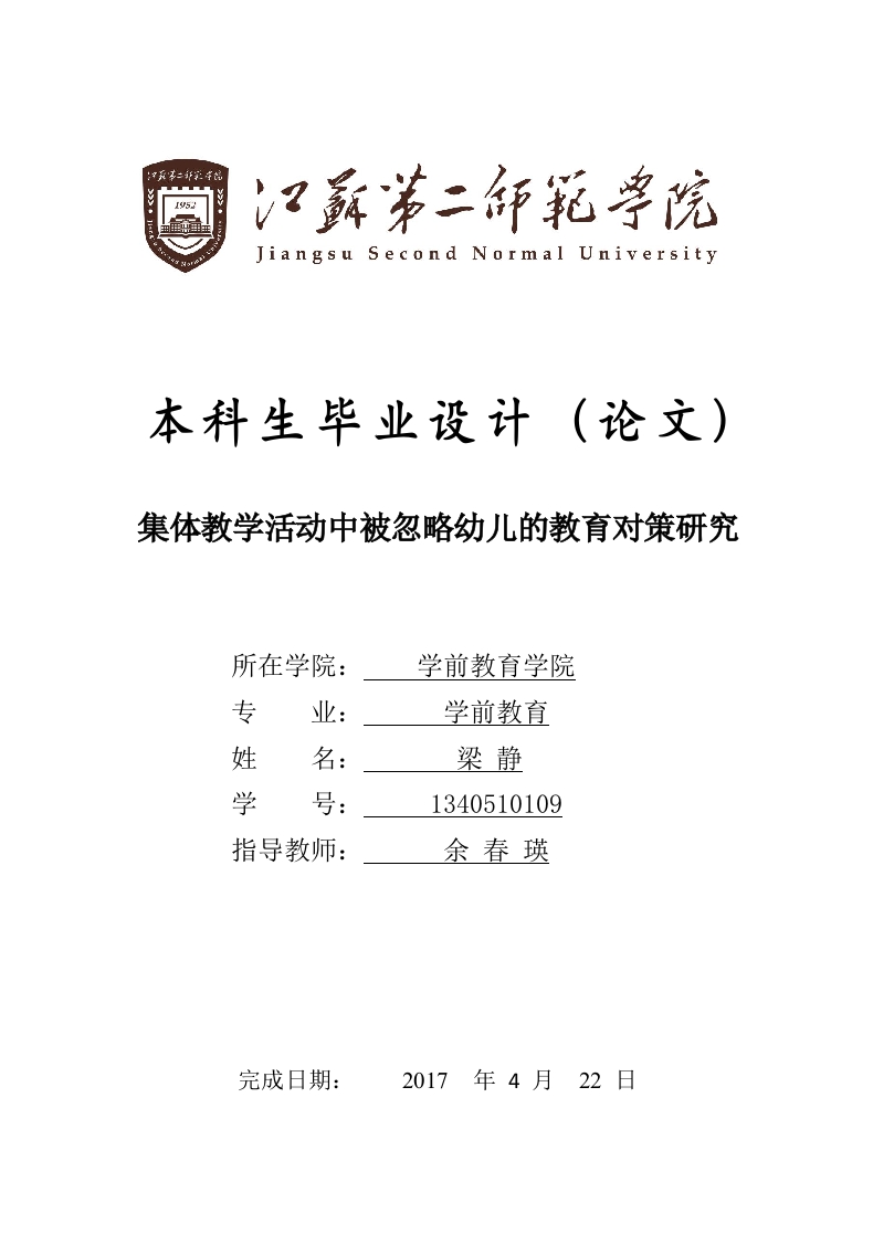 Jiangsu Second Normal University本科生毕业设计(论文)集体教学活动中被忽略幼儿的教育对策研究所在学院:学前教育学院专学前教育姓名:梁静学号:1340510109指导教师:余春瑛完成日期:2017年4月22日目录摘要ABSTRACT……第一部分绪论……1一、选题依据……1(一)选题缘由…1(二)研究意义…1二、国内外研究现状……2(一)国内研究现状…(二)国外研究现状…第二部分相关概念界定……3一、被忽略幼儿……3二、集体教学活动……3三、研究方法……3(一)同伴提名法…(二)观察法…3(三)访谈法…4(四)个案研究法(五)文献法第三部分被忽略幼儿具体案例…一、被忽略幼儿在园基本情况(一)被忽略幼儿所在班级带班教师基本概况…4(二)被忽略幼儿所在班级幼儿基本概况…5二、被忽略幼儿的具体案例…5(一)研究对象选取过程和方法…5(二)被忽略幼儿的具体案例…5第四部分被忽略幼儿的原因分析及建议…8一、被忽略幼儿的原因分析……8(一)幼儿园环境…8(二)教师…(三)幼儿自身…10(四)家庭方面…11二、建议…13(一)给幼儿园建议…13(二)给幼儿教师建议……14(三)给幼儿家长建议……15第五部分研究反思……16致谢…17参考文献…18…19附录一…19
